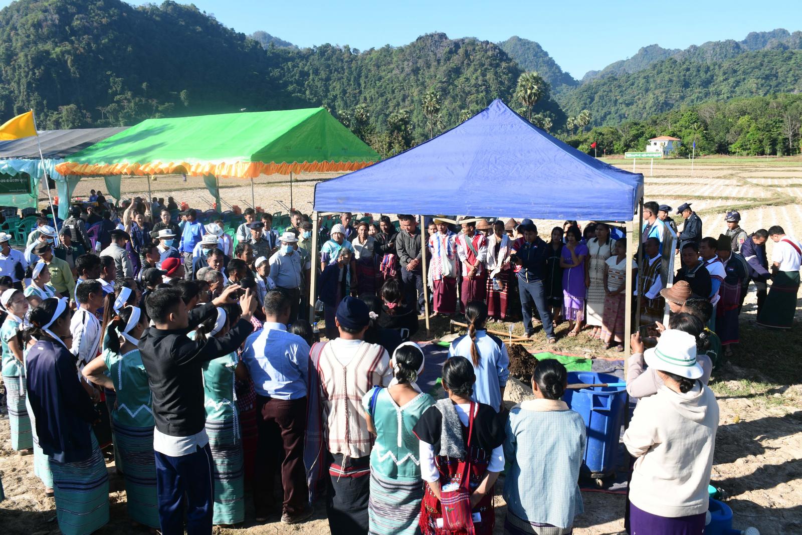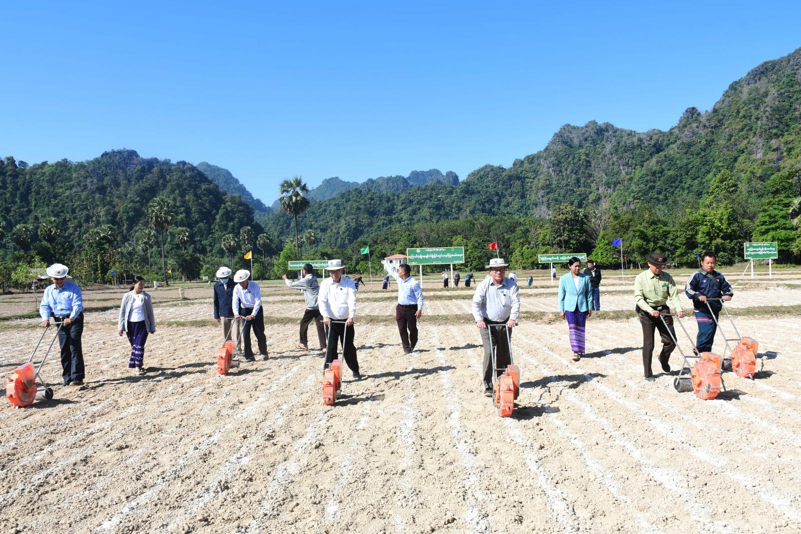 ထို့နောက် ဆောင်းနေကြာသီးနှံမျိုးစေ့ချစိုက်ပျိုးခြင်းကွင်းသရုပ်ပြပွဲကို ကျင်းပရာ ပြည်နယ်ဝန်ကြီးချုပ်က အမှာစကားပြောကြားပြီး ပြည်နယ်စိုက်ပျိုးရေးဦးစီးဌာနညွှန်ကြားရေးမှူးဦးထွန်းမြင့်က နေကြာ စိုက်ပျိုးခြင်းနှင့်ပတ်သက်၍ ရှင်းလင်းတင်ပြကာ မျိုးစေ့ချကိရိယာများဖြင့် နေကြာသီးနှံမျိုးစေ့ချ စိုက်ပျိုးခြင်းကွင်းသရုပ်ပြပွဲကိုကျင်းပရာ ပြည်နယ်ဝန်ကြီးချုပ်၊ ပြည်နယ်တရားလွှတ်တော် တရားသူကြီး ချုပ်၊ ပြည်နယ်အစိုးရအဖွဲ့ဝင်များကိုယ်တိုင် ပါဝင်သရုပ်ပြသခဲ့ကြပြီးကွင်းသရုပ်ပြခြင်းနှင့် တောင်သူများအစေ့ချစိုက်ပျိုးခြင်းတို့ကို ကြည့်ရှုအားပေးကာ တာဝန်ရှိသူများအား လိုအပ်သည်များ မှာကြားခဲ့သည်။