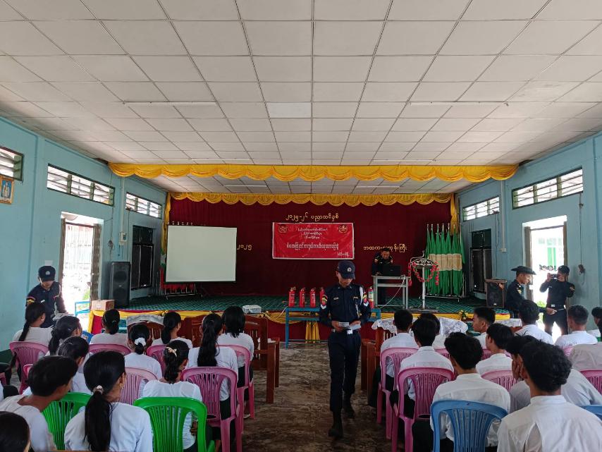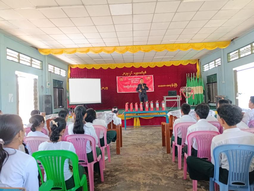 အဆိုပါ ဟောပြာပွဲတွင် မြို့နယ်မီးသတ်ဦးစီးမှူးဦးမျိုးမြင့်စိုးက မီးဘေးအန္တရာယ်ကြိုတင်ကာကွယ်တားစီးရေးနှင့်ပတ်သက်၍ ဆောင်ရန်/ရှောင်ရန်အချက်အလက်များနှင့် မီးဘေးအန္တရာယ်ကြုံတွေ့လာပါက မီးသတ်ဆေးဘူးဖြင့်မီးငြှိမ်းသတ်ရာ၌ မီးသတ်ဆေးဘူးအားအသုံးပြုနည်းများအား စနစ်တကျ ရှင်းလင်းပြောကြားခဲ့ပြီး အသိပညာပေးလက်ကမ်းစာစောင်များအား ကျောင်းသား၊ ကျောင်းသူများ၏ လက်ဝယ်အရောက်ဖြန့် ဝေပေးခဲ့သည်။