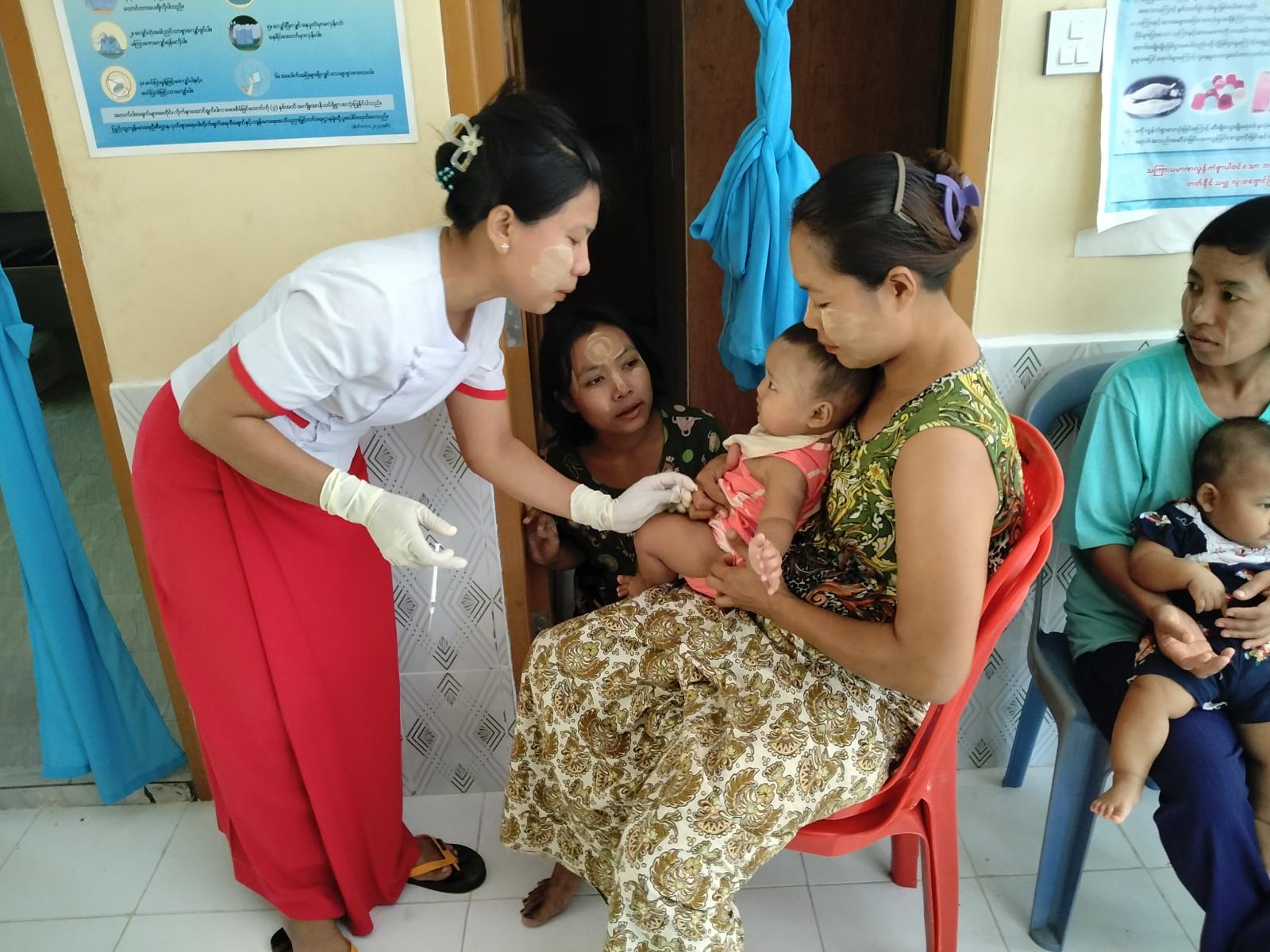 ဧရာဝတီတိုင်းဒသကြီး၊ ပုသိမ်ခရိုင်၊ ရွှေသောင်ယံမြို့ အမှတ်(၂) ရပ်ကွက်ရှိ ကျေးလက်ကျန်းမာရေးဌာနခွဲတွင်၊ ယနေ့နံနက်(၉)နာရီခွဲအချိန်က မွေးစနှစ်လမှ တစ်နှစ်ခွဲအထိ ကလေးငယ်များအား ပုံမှန်ကာကွယ်ဆေးများ ထိုးနှံခြင်းလုပ်ငန်းများကို ဆောင်ရွက်ခဲ့ကြသည်။