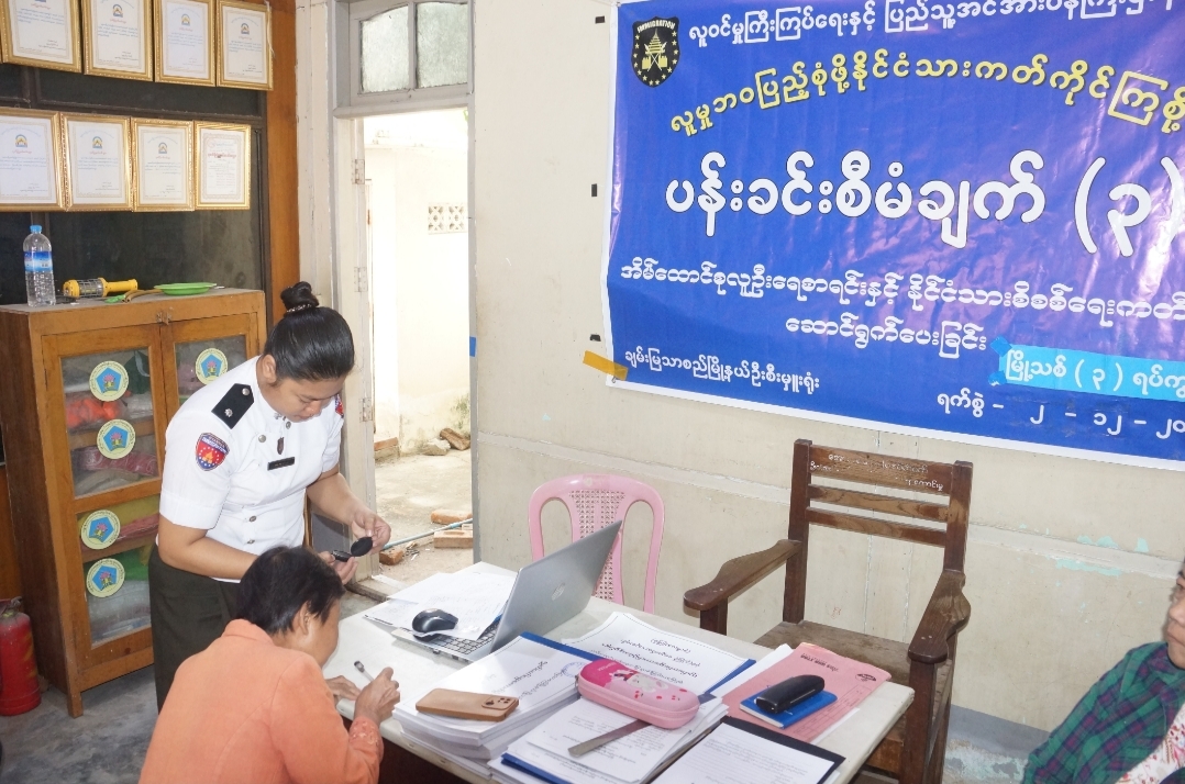 ထိုသို့ အိမ်ထောင်စုလူဦးရေစာရင်းနှင့် နိုင်ငံသားစိစစ်ရေးကတ်ပြား ဆောင်ရွက်ပေးခြင်းကို လူဝင်မှုကြီးကြပ်ရေးနှင့်ပြည်သူ့အင်အားဝန်ကြီးဌာန ချမ်းမြသာစည်မြို့နယ်ဦးစီးမှူး ဦးရဲမင်းထွန်းနှင့်ဝန်ထမ်းများ၊ မြို့နယ်စီမံခန့်ခွဲရေးနှင့်အုပ်ချုပ်ရေးကော်မတီအဖွဲ့ဝင် (၁) ဗိုလ်မှူး ထွန်းဇံဖြူ၊ မြို့နယ်စီမံခန့်ခွဲရေးနှင့်အုပ်ချုပ်ရေးကော်မတီ ဒုတိယမြို့နယ်အုပ်ချုပ်ရေးမှူး ဦးမြင့်ဇော်နှင့် ရက်ကွက်အုပ်ချုပ်ရေးမှူးများပူးပေါင်း၍ ဆောင်ရွက်ပေးလျက်ရှိပြီး နိုင်ငံသားစိစစ်ရေးကတ်များကို ပြည်သူများလက်ဝယ် အရောက်ပေးအပ်ကြသည်။