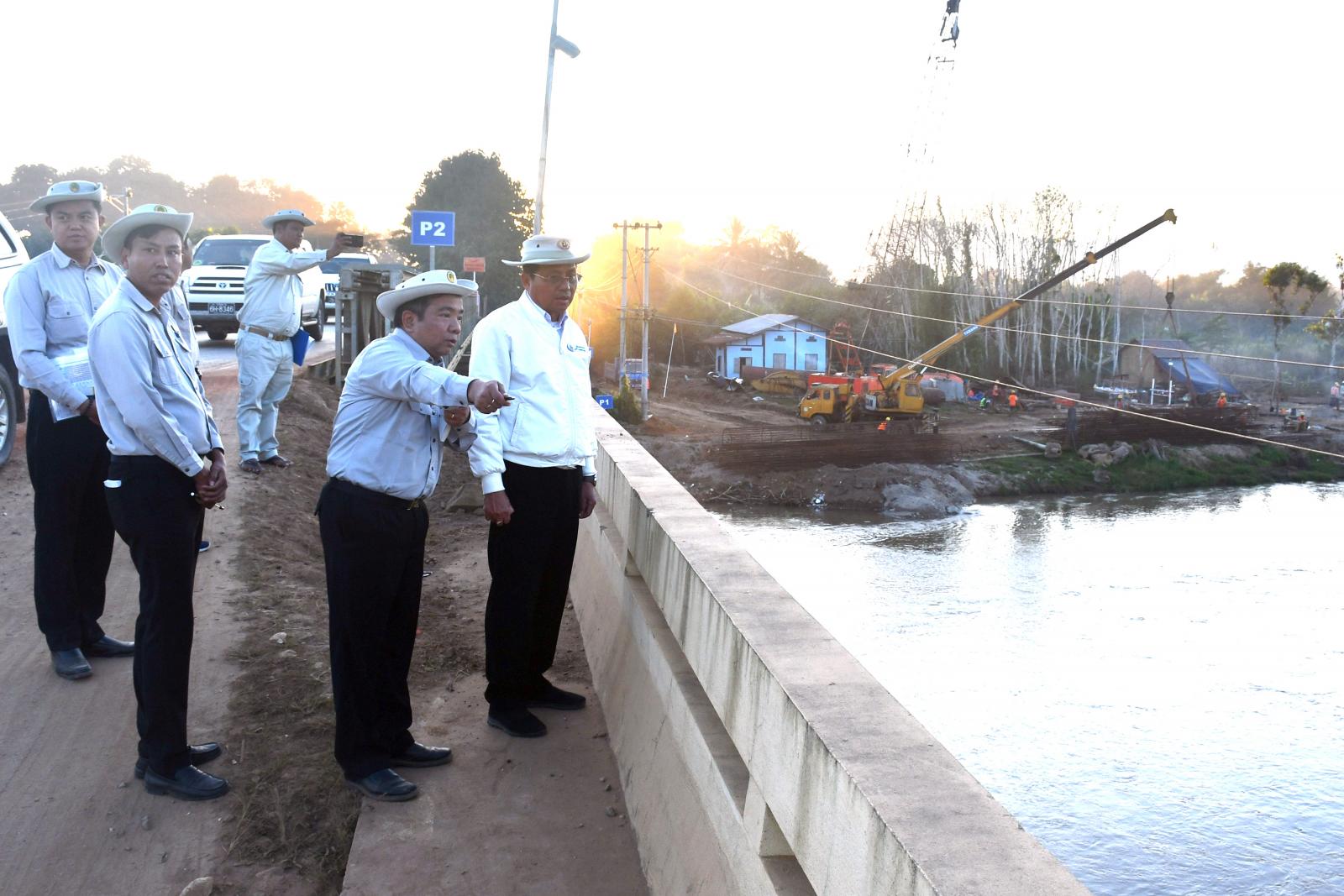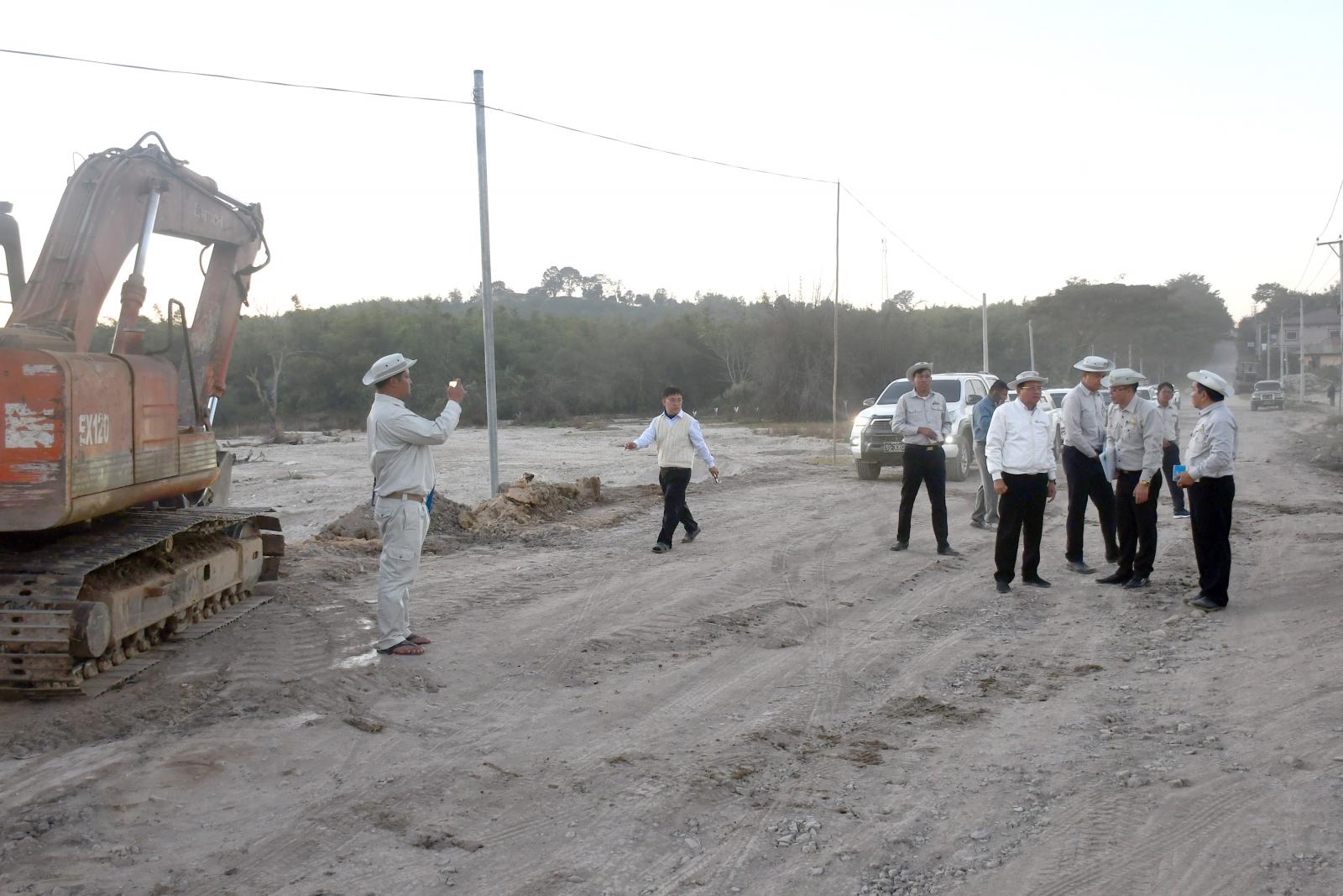 ယင်းနောက် မိုင်းဆတ်-တာချီလိတ်လမ်းမ ဆိုင်ခေါင်တံတား အရှယ် ၄၂၀ ပေ သံကူကွန်ကရစ်တံတား တည်ဆောက်နေမှုနှင့် နမ့်ကျန်းတံတား ချဉ်းကပ်လမ်းတည်ဆောက်နေမှုတို့ကို ကြည့်ရှုစစ်ဆေးရာ လမ်းဦးစီးဌာန၊ ရှမ်းပြည်နယ်(အရှေ့ပိုင်း)မှ ညွှန်ကြားရေးမှူး(မြို့ပြ) ဦးသူရဇော်နှင့် တာဝန်ခံ အင်ဂျင်နီယာတို့က လုပ်ငန်းဆောင်ရွက်ပြီးစီးအခြေအနေတို့ကို ရှင်းလင်းတင်ပြကာ ပြည်နယ်ဝန်ကြီးက လုပ်ငန်းများ သတ်မှတ်စံချိန်စံညွှန်းနှင့်အညီ အချိန်မီပြီးစီးရေး လိုအပ်သည်များ ပေါင်းစပ်ညှိနှိုင်း ဆောင်ရွက်ပေးခဲ့ကြောင်း သိရသည်။