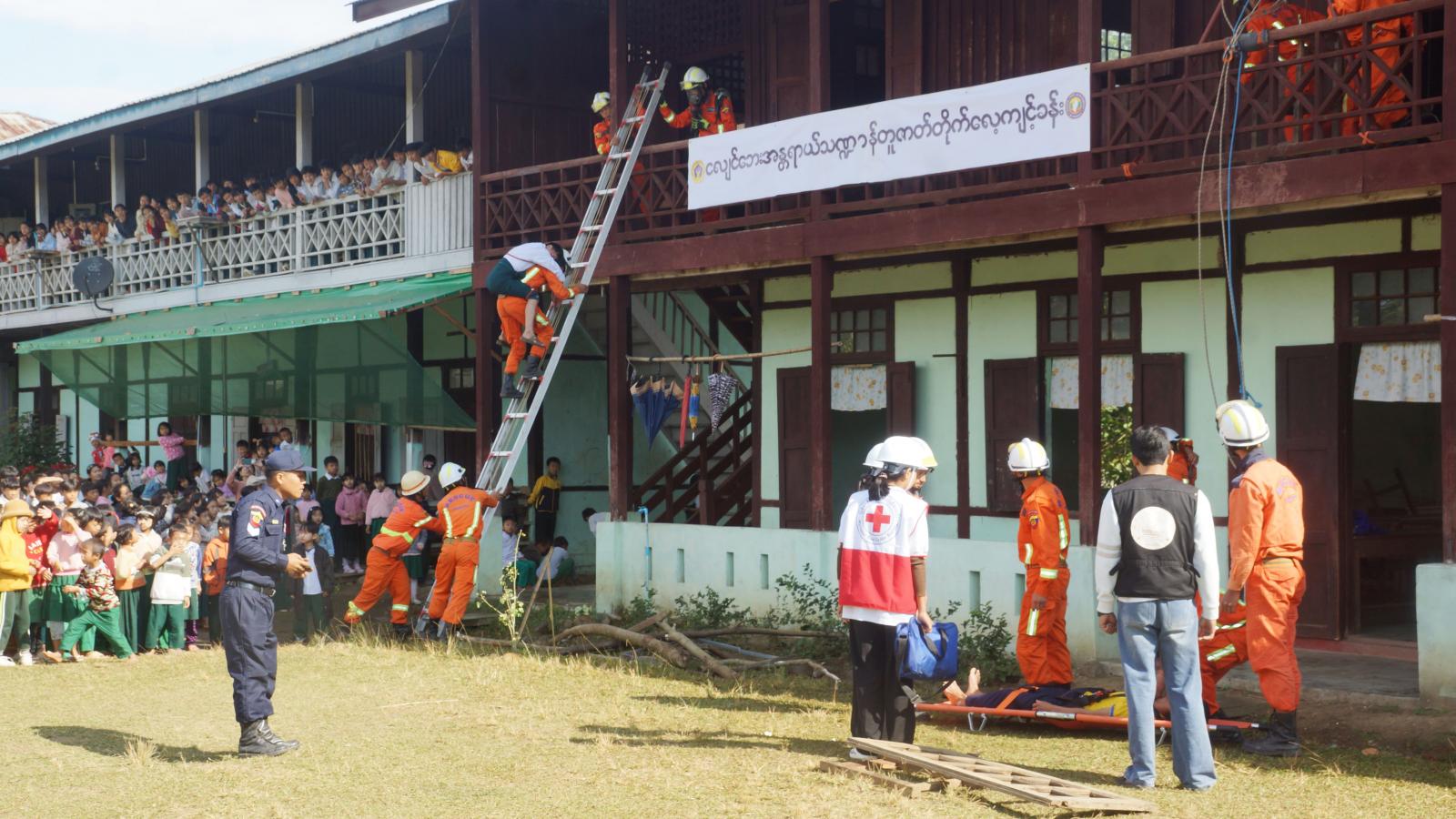 ထို့နောက် မြောက်ပိုင်းတိုင်းစစ်ဌာနချုပ် ဒုတိယတိုင်းမှူးနှင့်တာဝန်ရှိသူများက မီးသတ်ဦးစီးဌာန၊ လူမှုကူညီရေးအသင်းအဖွဲ့များနှင့် ကျောင်းသား၊ ကျောင်းသူများက မြေငလျင်ဖြစ်ပွားပြီးနောက် ဖြစ်ပွားနိုင်သော မီးဘေးအန္တရာယ်နှင့်သစ်ပင်များပြိုလဲခြင်း၊ တိုက်အဆောက်အအုံများပြိုကျပိတ်မိခြင်းများရှိလာပါက စက်ပစ္စည်းကိရိယာများအသုံးပြု၍ ကူညီကယ်ဆယ်ရေးလုပ်ငန်းများဆောင်ရွက်ခြင်း၊ ပထမအထပ်တွင် ပိတ်မိနေသော လူနာများအား လူနာထမ်းစင်ဖြင့်ကယ်ဆယ်ခြင်း၊ ဒုတိယအထပ်တွင် ပိတ်မိနေသော လူနာများအား မီးသတ်သမားကြိုးချည်နည်းဖြင့်ကယ်ထုတ်ခြင်း၊ အထပ်မြင့်တွင် ပိတ်မိနေသော လူနာများအား ရှာဖွေကယ်ဆယ်ရေးတပ်ဖွဲ့ဝင်များက Tri pot စနစ်၊ ဝန်အားလျော့ချနည်း၊ ကြိုးချည် နည်းဖြင့် လူနာအားကယ်ထုတ်ခြင်း၊ ကယ်ထုတ်လာသော လူနာများအား ကူညီကယ်ဆယ်ရေး စခန်းများတွင် ကျန်းမာရေးစောင့်ရှောက်မှုများ သရုပ်ပြသဇာတ်တိုက်လေ့ကျင့်မှုများကို ကြည့်ရှုအားပေးကြသည်။