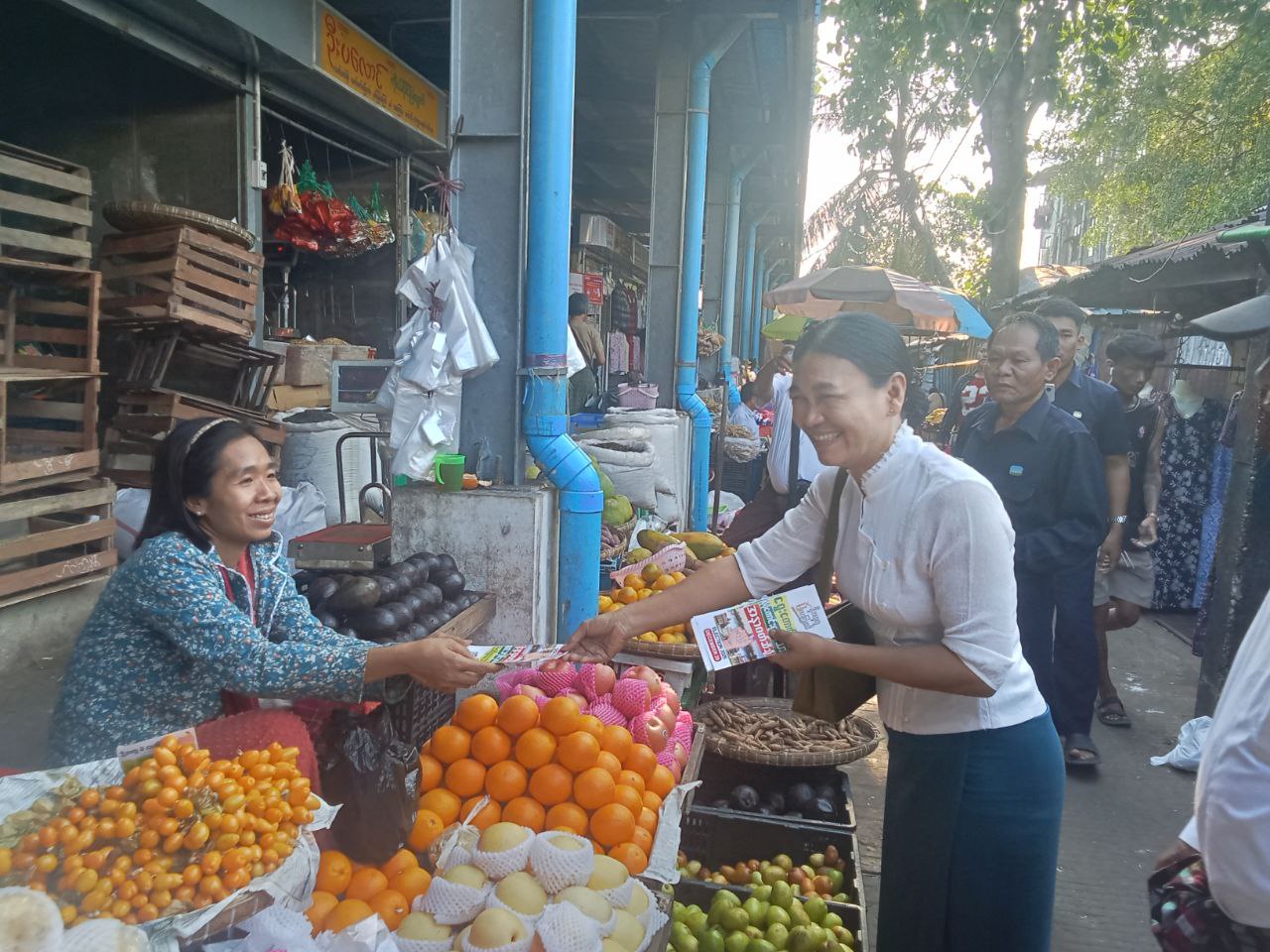 "ရွေးကောက်ပွဲမှသည် ပိုမိုကောင်းမွန်သောအနာဂတ်ဆီသို့" ဆောင်ပုဒ်နှင့်အညီ ဒီမိုကရေစီကို ပြန်လည်ဖော်ဆောင်ဖို့အတွက် ရွေးကောက်ပွဲမှလွဲ၍ အခြားနည်းမရှိပါ၊ ပြည်သူများလိုလားသည့် ဒီမိုကရေစီနိုင်ငံတော်ကို ရွေးကောက်ပွဲဖြင့်သာ ဖော်ဆောင်နိုင်ပါသည်၊ ဒီမိုကရေစီခိုင်မြဲဖို့ မဲရုံသွားပြီး မဲပေးကြပါစို့၊ နိုင်ငံဖွံ့ဖြိုးတိုးတက်ဖို့ ဦးဆောင်နိုင်သူရွေးချယ်ကြပါစို့" စသည့်အကြောင်းအရာများပါဝင်သော လက်ကမ်းစာစောင်များအား ဒုတိယမြို့နယ်အုပ်ချုပ်ရေးမှူး ဦးကျော်ကိုကို၊ ပြန်ကြားရေးနှင့်ပြည်သူ့ဆက်ဆံရေးဦးစီးဌာန မြို့နယ်ဦးစီးမှုး၊ မြို့နယ်စည်ပင်သာယာဝန်ထမ်းများ၊ မြို့နယ်မီးသတ်ဦးစီးဌာနမှ တာဝန်ရှိသူများ၊ မြို့နယ်အမျိုးသမီးရေးရာအဖွဲ့ဝင်များ၊ မြို့နယ်မိခင်နှင့် ကလေးစောင့်ရှောက်ရေးအသင်းဝင်များ၊ ရပ်ကွက်အုပ်ချုပ်ရေးမှုးများပါဝင်သောအဖွဲ့မှ ပြည်သူများ လက်ဝယ်အရောက် ဖြန့်ဝေပေးခဲ့ကြောင်း သိရသည်။