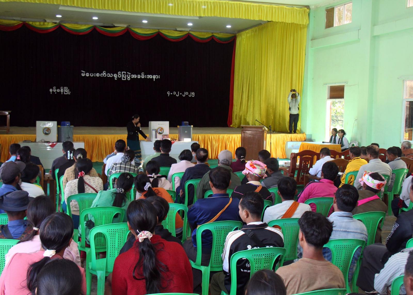 ရှမ်းပြည်နယ်(တောင်ပိုင်း)၊ နမ့်စန်ခရိုင်၊ နမ့်စန်မြို့နယ်တွင် မြန်မာအီလက်ထရောနစ်မဲပေးစက်ဆိုင်ရာ အသိပညာပေးခြင်းနှင့် လက်တွေ့စမ်းသပ်မဲပေးခြင်းကို ယနေ့ နံနက် ၉ နာရီက အမှတ်(၂)ရပ်ကွက်ရှိမြို့ နယ်ခန်းမတွင် ကျင်းပခဲ့ရာ ခရိုင်စီမံခန့်ခွဲရေးနှင့်အုပ်ချုပ်ရေးကော်မတီဥက္ကဋ္ဌ ဦးသက်နိုင်နှင့် အဖွဲ့ဝင်များ၊ မြို့နယ်စီမံခန့်ခွဲရေးနှင့်အုပ်ချုပ်ရေးကော်မတီဥက္ကဋ္ဌ ဦးနေမျိုးထွန်းနှင့် ခရိုင်၊ မြို့နယ်အဆင့်ဌာနဆိုင်ရာအကြီးအကဲများ၊ ဝန်ထမ်းများ၊ မြို့နယ်ရွေးကောက်ပွဲကော်မရှင်အဖွဲ့ခွဲဥက္ကဋ္ဌ ဦးအောင်ဆယ်နှင့် အဖွဲ့ဝင်များ၊ မြို့နယ်ရွေးကောက်ပွဲအရာရှိ ဒေါ်မျိုးမျိုးအောင်နှင့် ဝန်ထမ်းများ၊ နိုင်ငံရေးပါတီကိုယ်စားလှယ်များ၊ ရပ်/ကျေးအုပ်ချုပ်ရေးမှူးများနှင့် ရပ်ကွက်နှင့် ကျေးရွာများမှ ပြည်သူများ တက်ရောက်ခဲ့ကြသည်။