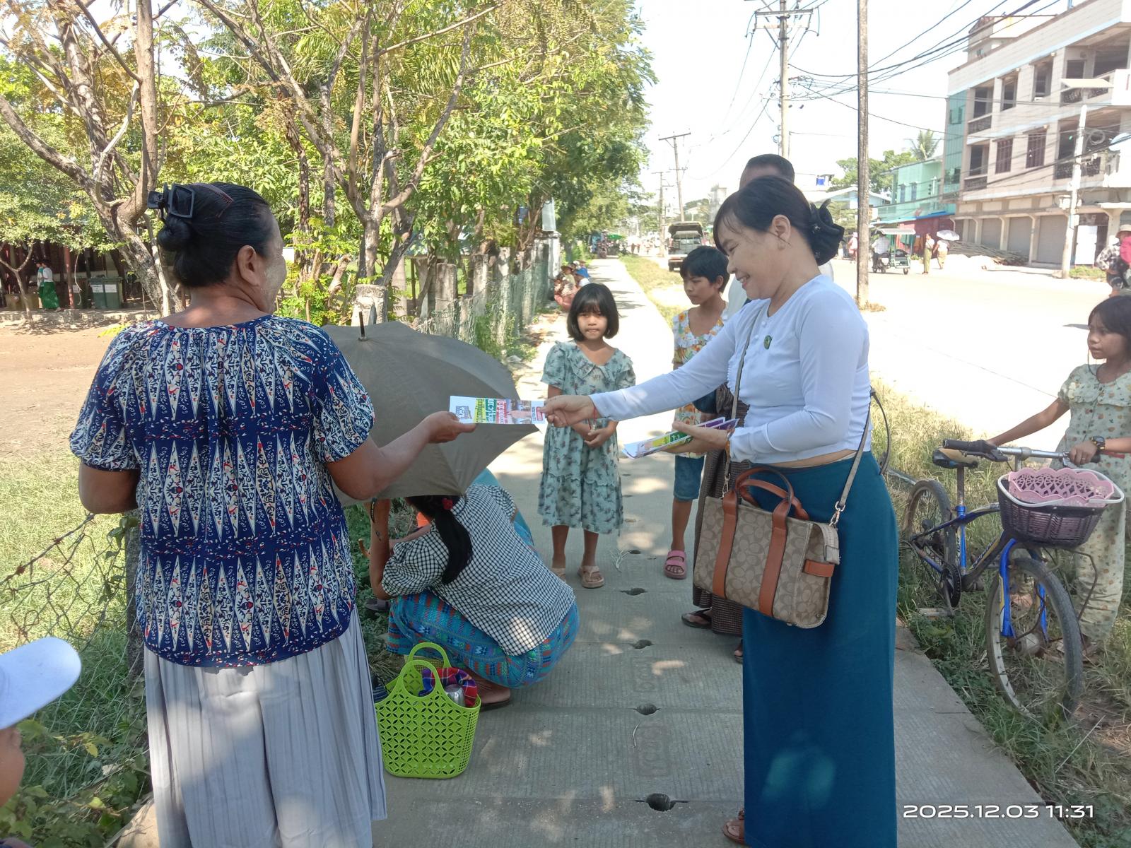 ရန်ကုန်တိုင်းဒေသကြီး၊ အင်းစိန်ခရိုင်၊ လှိုင်သာယာ (အရှေ့ပိုင်း) မြို့နယ်တွင် ၂၀၂၅ ခုနှစ် ဒီဇင်ဘာ ၂၈ ရက်နေ့၌ ကျင်းပမည့် ပါတီစုံဒီမိုကရေစီအထွေထွေရွေးကောက်ပွဲတွင် ဆန္ဒမဲပေးနိုင်ရန်အတွက် "ဒို့အတူတူမဲပေးကြမယ်" လက်ကမ်းစာစောင်ကို ယမန်နေ့ နေ့လယ် (၂) နာရီ၌ အမှတ် (၆) ရပ်ကွက်နှင့် အမှတ် (၇) ရပ်ကွက်အတွင်းရှိ ရပ်ကွက်နေပြည်သူများအား တာ၀န်ရှိသူများက လက်ကမ်းစာစောင်များ ဖြန့်ဝေလျက်ရှိသည်။