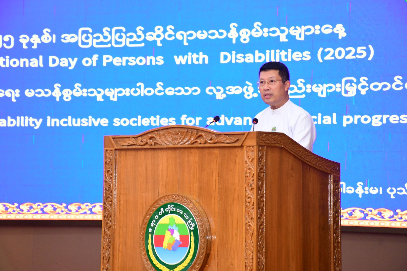 ဦးစွာ တိုင်းဒေသကြီးဝန်ကြီးချုပ်က “ယခုနှစ်တွင်ကျရောက်သည့် အပြည်ပြည်ဆိုင်ရာမသန်စွမ်းသူများနေ့ ဂုဏ်ပြုဆောင်ပုဒ်မှာ လူမှုဘဝမြင့်မားရေး မသန်စွမ်းသူများပါဝင်သော လူ့အဖွဲ့အစည်းများမြှင့်တင်ပေး " "Fostering Disability inclusive societies for advancing social progress "ဖြစ်ပါကြောင်း၊ နိုင်ငံအတွင်း ဆောင်ရွက်မည့် လူမှုဖွံ့ဖြိုးတိုးတက်ရေးလုပ်ငန်းစဉ်များမှာ မသန်စွမ်းသူများအရေး ထည့်သွင်းရေးဆွဲအကောင်အထည်ဖော်ရန်နှင့် မသန်စွမ်းသူများကိုယ်တိုင် ပါဝင်ဆောင်ရွက်ခွင့်ရရှိစေရန်၊ မသန်စွမ်းသူများ၏ အမြင်နှင့်သဘောထားကို အလေးထား၍ လူ့အဖွဲ့အစည်း၏ လူမှုစီးပွားဘဝမြှင့်တင်နိုင်ရေး လှုံ့ဆော်လိုက်ခြင်းဖြစ်ပါကြောင်း၊ ထိုကဲ့သို့ဆောင်ရွက်ရာတွင် မသန်စွမ်းသူများက ကိုယ်တိုင်အမှီအခိုကင်းစွာ ပါဝင်ဆောင်ရွက်နိုင်ရန် မိမိကိုယ်ကိုယုံကြည်မှုထားပြီး အရည်အသွေးများမြင့်မားနေစေရေး အားထုတ်ကြိုးပမ်းရန် ဆန္ဒများရှိနေရန်နှင့် သက်ဆိုင်ရာလူ့အသိုင်းအဝိုင်းနှင့် တာဝန်ရှိသူများအနေဖြင့်လည်း မသန်စွမ်းသူများ၏ စွမ်းဆောင်နိုင်မှုကိုအသိအမှတ်ပြု လက်တွဲခေါ်ဆောင်နိုင်ရန် လိုအပ်ပါကြောင်း၊ ကမ္ဘာ့လူဦးရေ သန်းပေါင်း (၈၂၀၀) ကျော်ရှိသည့်အနက် (၁၆) ရာခိုင်နှုန်းဖြစ်သည့် လူဦးရေသန်းပေါင်း (၁၃၀၀) ကျော်သည် မသန်စွမ်းသူများဖြစ်ကြပါကြောင်း၊ မြန်မာနိုင်ငံတွင် နိုင်ငံလူဦးရေ၏(၇.၆) ရာခိုင်နှုန်း မသန်စွမ်းသူများဖြစ်ကြသည့်အတွက် ကမ္ဘာမှာရော မြန်မာမှာပါ မသန်စွမ်းသူဦးရေဟာ အချိုးအစားကြီးမားစွာတည်ရှိနေပါကြောင်း၊ မသန်စွမ်းသူများအနေဖြင့် ဂုဏ်သိက္ခာရှိစွာ၊ အမှီအခိုကင်းစွာ ဘဝရပ်တည် နေထိုင်နိုင်ရေးအတွက် အသက်မွေးဝမ်းကြောင်းပညာ ရရှိရေး၊ အလုပ်အကိုင်အခွင့်အလမ်းနှင့် ကိုယ်ပိုင်ဝင်ငွေရရှိရေးသည်လည်း အရေးကြီးပါကြောင်း၊ ထို့ကြောင့် အလုပ်လုပ်ကိုင်နိုင်သော မသန်စွမ်းသူများအတွက် သင့်လျော်သောအလုပ် ခန့်ထားနိုင်ရေး သက်ဆိုင်ရာဌာနများနှင့် ပူးပေါင်းဆောင်ရွက်လျက်ရှိပါကြောင်း၊ ယခုနှစ်ဆောင်ပုဒ်ဖြစ်သည့် “လူမှုဘဝမြင့်မားရေး မသန်စွမ်းသူများပါဝင်သော လူ့အဖွဲ့အစည်းများ မြှင့်တင်ပေး” နှင့်အညီ မသန်စွမ်းသူများပါဝင်သည့် လူအဖွဲ့အစည်းမှသည် လူမှုစီးပွားဘဝမြင့်မားစေရေး ဝိုင်းဝန်းကြိုးပမ်း ဆောင်ရွက်ပေးကြရန်လိုပါကြောင်း” တိုက်တွန်းအမှာစကားပြောကြားသည်။