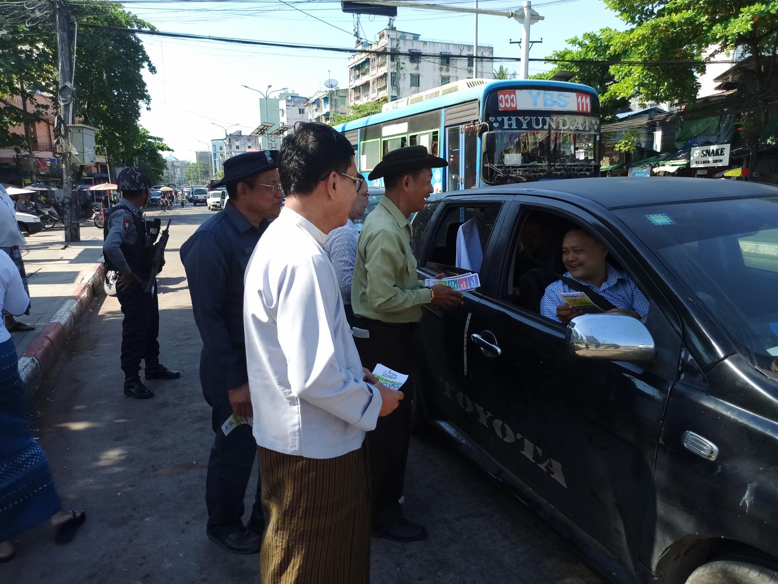 ရန်ကုန်တိုင်းဒေသကြီး သင်္ဃန်းကျွန်းမြို့နယ် ဘေးထောင့်ကန်ရပ်ကွက်၊ လေးထောင့်ကန်လမ်း၊ ဘီအိုစီကားမှတ်တိုင်နှင့် ငမိုးရိပ်ရပ်ကွက်၊ လေးထောင့်ကန်လမ်း၊ စံပြဈေးကားမှတ်တိုင်တို့ရှိ ခရီးသွားပြည်သူများနှင့် ဦးတင်ဦးလမ်းပေါ်ရှိ ပျံကျဈေးအတွင်း ဈေးရောင်းချနေသော ဈေးဆိုင်များ၊ လမ်းသွားလမ်းလာပြည်သူများထံသို့ "ဒို့အတူတူမဲပေးကြမယ်" စာသားနှင့် "ရွေးကောက်ပွဲမှသည် ပိုမိုကောင်းမွန်သောအနာဂတ်ဆီသို့" စာသားများပါ လက်ကမ်းစာစောင်များအား မြို့နယ်စီမံခန့်ခွဲရေးနှင့် အုပ်ချုပ်ရေးကော်မတီဥက္ကဋ္ဌ ဦးလှမျိုးနှင့် အဖွဲ့ဝင်များ၊ မြို့နယ်ရွေးကောက်ပွဲကော်မရှင်အဖွဲ့ခွဲဥက္ကဋ္ဌ ဦးမျိုးမြင့်နှင့် အဖွဲ့ဝင်များ၊ မြို့နယ်စည်ပင်သာယာအုပ်ချုပ်ရေးမှူး ဦးနိုင်ဝင်း၊ ပြန်/ဆက်ဦးစီးမှူး ဒေါ်ဝါဝါဝင်းမြိုင်ပါဝန်ထမ်းများဖြင့် လက်ကမ်းစာစောင် (၁၀၀၀) စောင်အား ဒီဇင်ဘာလ ၄ ရက်နေ့နံနက်ပိုင်းက ဖြန့်ဝေပေးခဲ့ပါကြောင်းနှင့် သင်္ဃန်းကျွန်းမြို့မရဲစခန်းမှ နယ်ထိန်းအရာရှိ ဒုရဲအုပ် ထွန်းထွန်းလတ်ဦးစီး (၁+၆) ဦးတို့မှ လုံခြုံရေးလိုက်ပါဆောင်ရွက်ခဲ့ကြောင်း သတင်းရရှိသည်။