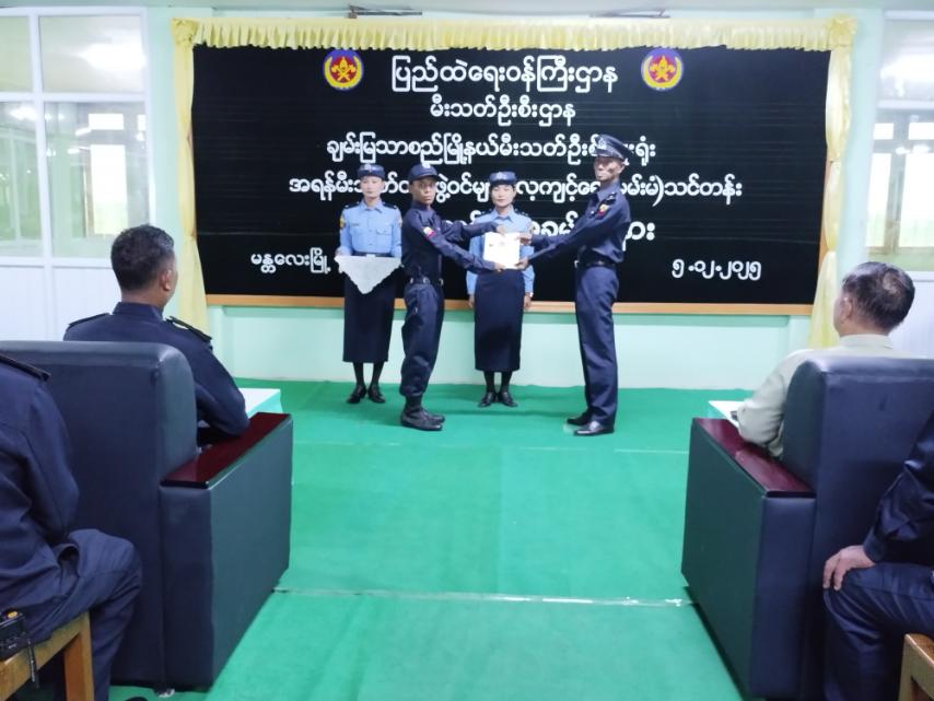 အခမ်းအနားတွင် မြို့နယ်စီမံခန့်ခွဲရေးနှင့်အုပ်ချုပ်ရေးကော်မတီ အဖွဲ့ဝင် ဗိုလ်မှူး ထွန်းဇံဖြူက အဖွင့်အမှာစကား ပြောကြားပြီးနောက် မြို့နယ်စီမံခန့်ခွဲရေးနှင့် အုပ်ချုပ်ရေးကော်မတီဥက္ကဋ္ဌ ဦးထင်ဇော်ဦး၊ အဖွဲ့ဝင်ဗိုလ်မှူးထွန်းဇံဖြူနှင့် အရန်မီးသတ်ဒုတိယတပ်ရင်းမှူး ဦးဝင်းမောင်တို့မှ သင်တန်းသားများအား သင်တန်းဆင်းလက်မှတ်များ အပ်နှင်းခဲ့ကြောင်း သိရသည်။