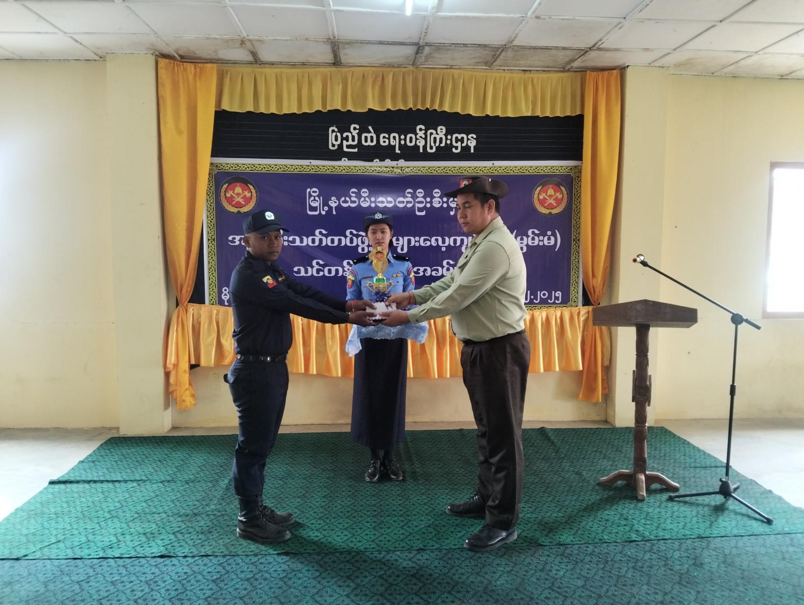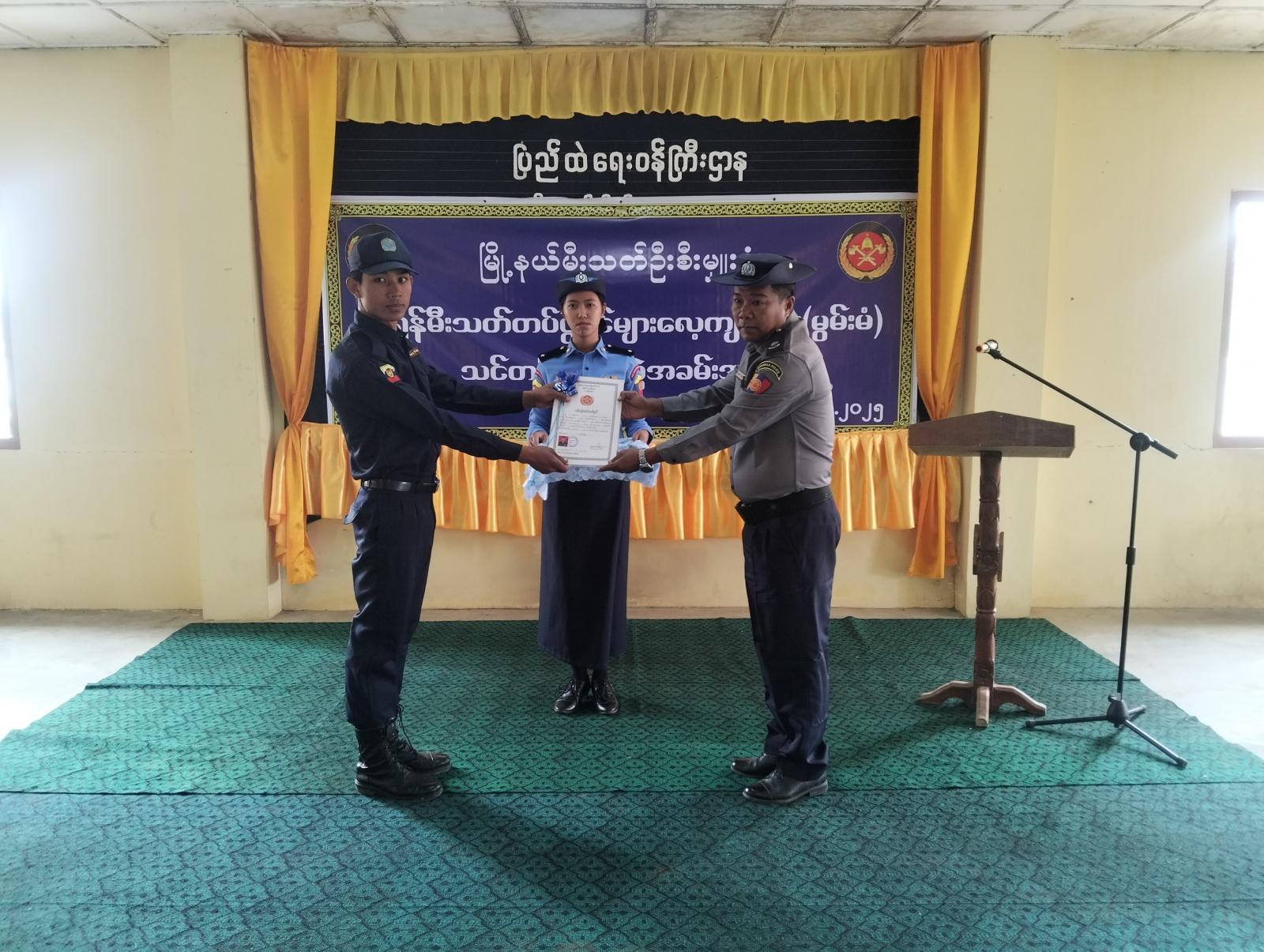 အခမ်းအနားတွင် မြို့နယ်စီမံအုပ်ချုပ်ရေးအဖွဲ့ဥက္ကဋ္ဌ၊ မြို့နယ်အုပ်ချုပ်ရေးမှူး ဦးဟန်ဇော်မြင့်က အဖွင့်အမှာစကားပြောကြားပြီး အရန်မီးသတ်တပ်ဖွဲ့များ လေ့ကျင့်ရေး(မွမ်းမံ)သင်တန်းတွင် မီးသတ်ပညာထူးချွန်ဆုနှင့် သင်တန်းဆင်းလက်မှတ်များ မြို့နယ်အုပ်ချုပ်ရေးမှူးနှင့် ရဲမှူး ကျော်သိန်းနိုင်တို့မှ သင်တန်းသားများအား အသီးသီးချီးမြှင့်ပေးအပ်ခဲ့ကြောင်း သိရသည်။
