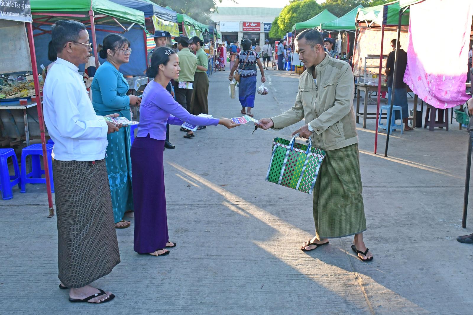 ထိုသို့ဆောင်ရွက်ရာတွင် မြို့နယ်စီမံခန့်ခွဲရေးနှင့်အုပ်ချုပ်ရေးကော်မတီအဖွဲ့ဝင် ဦးသန်းငွေ၊ မြို့နယ်အထွေထွေအုပ်ချုပ်ရေးဦးစီးဌာနမှ ဒုတိယမြို့နယ်အုပ်ချုပ်ရေးမှူး ဦးဇေယျာထွန်း၊ မြို့နယ်အဆင့်ဌာနဆိုင်ရာများ၊ မြို့နယ်မိခင်နှင့်ကလေးစောက်ရှောက်ရေးအသင်း၊ မြို့နယ်အမျိုးသမီးရေးရာအဖွဲ့တို့ပူးပေါင်း၍ ပုဗ္ဗသီရိညဈေးရှိ ဈေးရောင်း၊ ဈေးဝယ်ပြည်သူများအား ရွေးကောက်ပွဲမှသည်ပိုမိုကောင်းမွန်သော အနာဂတ်ဆီသို့၊ ဒီမိုကရေစီကိုပြန်လည်ဖော်ဆောင်ဖို့အတွက် ရွေးကောက်ပွဲမှလွဲ၍ အခြားနည်းမရှိပါ၊ ပြည်သူများလိုလားသည့် ဒီမိုကရေစီနိုင်ငံတော်ကို ရွေးကောက်ပွဲဖြင့်သာ ဖော်ဆောင်နိုင်ပါသည်၊ ဒီမိုကရေစီခိုင်မြဲဖို့ မဲရုံသွားပြီးမဲပေးကြပါစို့၊ နိုင်ငံဖွံ့ဖြိုးတိုးတက်ဖို့ ဦးဆောင်နိုင်သူရွေးချယ်ကြပါစို့ဟူသောအချက်များပါရှိသည့် အသိပညာပေး လက်ကမ်းစာစောင်များ အခမဲ့ဖြန့်ဝေပေးခဲ့ကြောင်း သိရသည်။