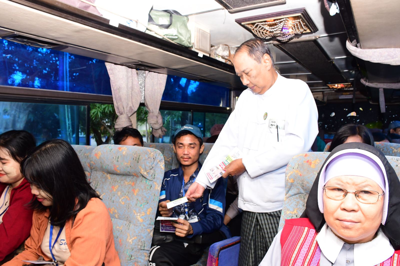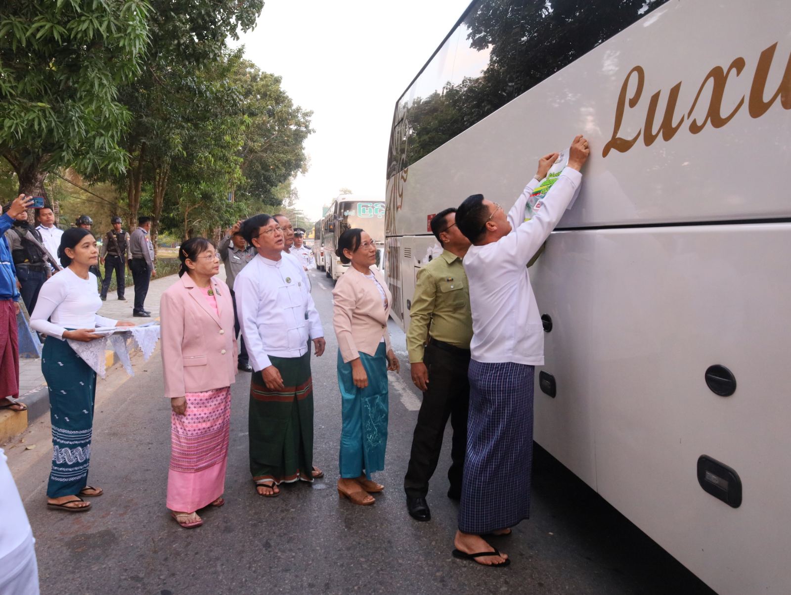 ဦးစွာ တိုင်းဒေသကြီးဝန်ကြီးချုပ်နှင့် အစိုးရအဖွဲ့ဝင်ဝန်ကြီးများသည် ခရီးသည် ယာဉ်များအား “ဒီမိုကရေစီခိုင်မြဲဖို့ မဲရုံသွားပြီးမဲပေးကြစို့”၊ “ ဒီမိုကရေစီပန်းတိုင်ဆီ မဲပေးခြင်း ဖြင့်တို့လှမ်းချီ”၊ “ရွေးကောက်ပွဲမှသည် ပိုမိုကောင်းမွန်သောအနာဂတ်ဆီသို့” ၊ “တိုင်းပြည် သာယာဝပြောရေး နိုင်ငံသားတိုင်းမဲပေးပေး”၊ လှမ်းစို့ကူညီမဲရုံဆီ ဒီမိုကရေစီဖော်ဆောင်မည်” စတစ်ကာများကို ကပ်နှံပေးခဲ့ပြီးနောက် ဌာနဆိုင်ရာများနှင့်အတူ “ဒို့အတူတူမဲပေးကြမယ်” လက်ကမ်းစာစောင်များကို ဖြန့်ဝေပေးခဲ့ကြသည်။