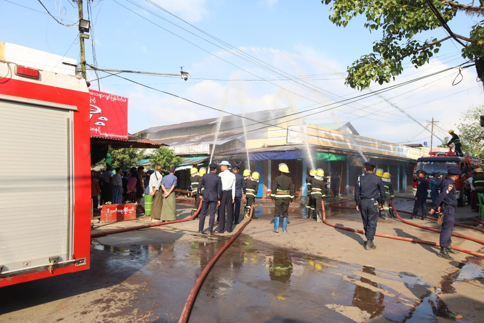 သရုပ်ပြဆောင်ရွက်ရာတွင် မြို့နယ်မီးသတ်ဦးစီးဌာနမှ မီးငြှိမ်းသတ်ယာဉ်များဖြင့် မီးငြှိမ်းသတ်ခြင်း၊ ဆီကြောင့်မီးလောင်မှုဖြစ်ပေါ်လာပါက မီးသတ်ဆေးဗူး အသုံးပြုပုံအဆင့်ဆင့်ကို မီးသတ်ဦးစီးဌာန မြို့နယ်ဦးစီးမှူး ဦးတိုးနိုင်ဦးက အကျယ်တစ်ဝင့် ရှင်းလင်းပြောကြားခဲ့ပြီး မီးသတ်ဆေးဗူးဖြင့် ငြိမ်းသတ်ခြင်း၊ ဖုံးအုပ်နည်းဖြင့် မီးငြိမ်းသတ်ခြင်းတို့ကို စျေးသူ၊ စျေးသားများဖြင့် လက်တွေ့လေ့ကျင့် လုပ်ဆောင်ခဲ့ကြပြီး စျေးအတွင်းရှိ ဆိုင်ခန်းများ၌ မီးဘေးအန္တရာယ် ကြိုတင်ကာကွယ်ရေး လုပ်ဆောင်ထားရှိမှုများအား တာဝန်ရှိသူများက လိုက်လံ ကြည့်ရှုစစ်ဆေးခဲ့ကြသည်။