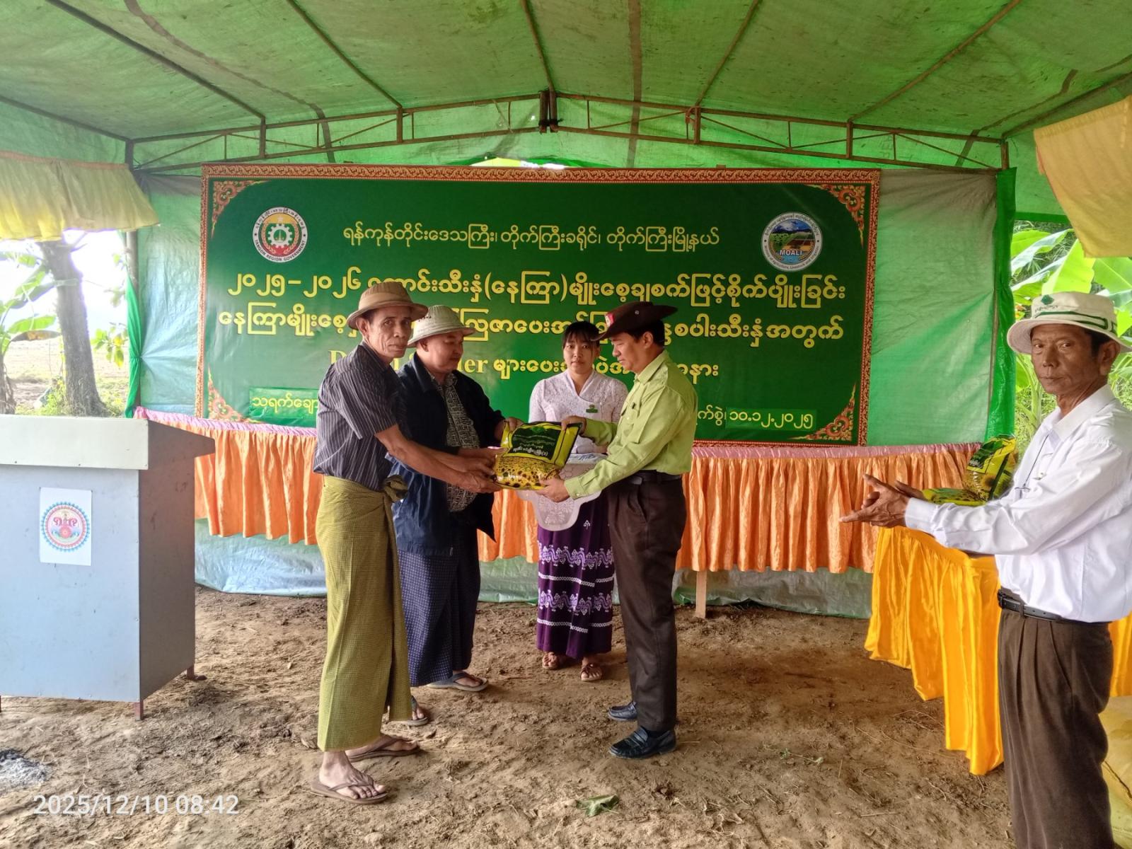 ရန်ကုန်တိုင်းဒေသကြီး၊ တိုက်ကြီးခရိုင်၊ တိုက်ကြီးမြို့နယ်၌ ၂၀၂၅-၂၀၂၆ ဆောင်းသီးနှံ (နေကြာ) မျိုးစေ့ချစက်ဖြင့် လက်တွေ့သရုပ်ပြစိုက်ပျိုးခြင်း၊ နေကြာမျိုးစေ့နှင့် ဓာတ်မြေဩဇာများ ပေးအပ်ခြင်းနှင့် နွေစပါးအတွက် Drum Seeder များ ပေးအပ်ပွဲကို ယနေ့န့နက် ၈ နာရီက သရက်ချောင်းကျေးရွာ ကွင်းအမှတ် ၇၀၀ A တောင်သူ ဒေါ်တင့်တင့်ဝေ၏ လယ်မြေ၌ ကျင်းပသည်။