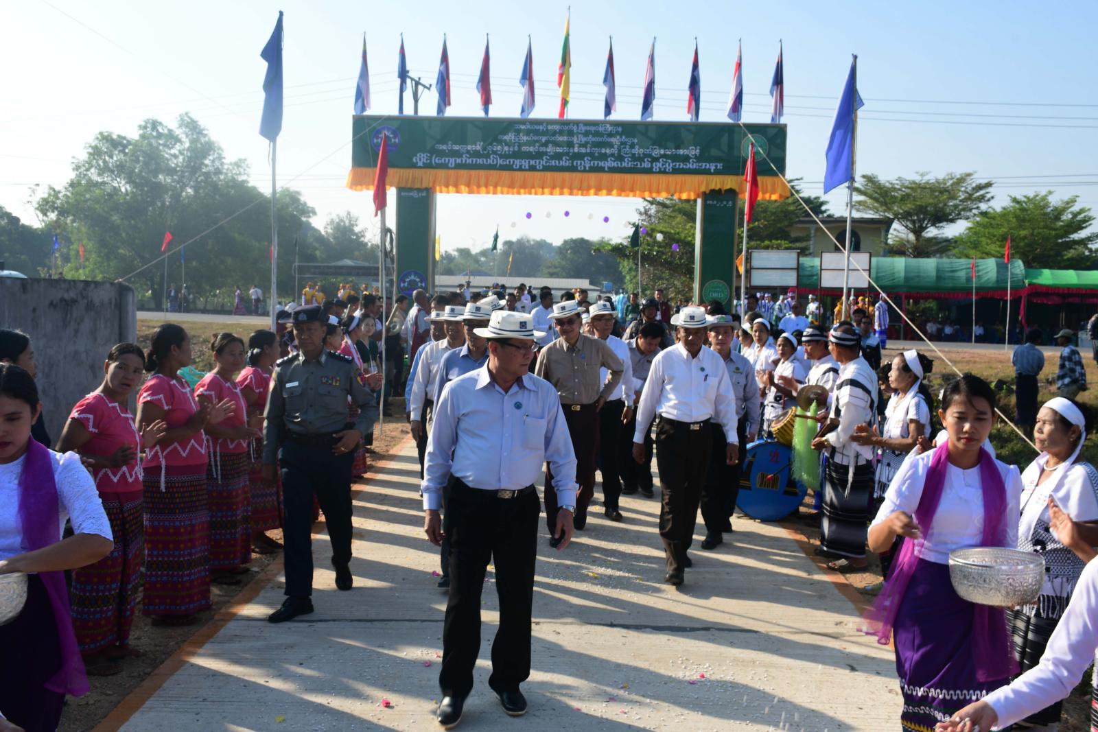 ဆက်လက်၍ ပြည်နယ်ဝန်ကြီးချုပ်နှင့်တာဝန်ရှိသူများက အရှည် ၆ ဖာလုံ၊ အကျယ် ၁၂ ပေနှင့် Pipe Culvert (၄)စင်းပါဝင်သော ကျေးရွာတွင်းကွန်ကရစ် လမ်းသစ်အားဖြတ်သန်းကြည့်ရှုစစ်ဆေးသည်။ လမ်းဖွင့်ပွဲတွင် ပြည်နယ်ဝန်ကြီးချုပ်က ကိုယ့်အားကိုယ်ကိုးစိတ်ဓာတ် မိမိတို့ကိုယ်တိုင်ဖွံ့ဖြိုးတိုးတက် လိုစိတ်များမွေးမြူကြကာ ကျေးလက်ဒေသဖွံ့ဖြိုးရေးလုပ်ငန်းများကို တန်ဖိုးထားကြရန် အကျိုးရှိရှိအသုံးပြုကြရန်နှင့် ဖွံ့ဖြိုးရေးလုပ်ငန်းများကို သက်ဆိုင်ရာဌာနများနှင့်ပေါင်းစပ်တင်ပြဆောင်ရွက်ခြင်းဖြင့် မိမိဒေသဖွံ့ဖြိုးအောင်ပူးပေါင်းဆောင်ရွက်ကြစေလိုကြောင်းတိုက်တွန်းပြောကြားသည်။ ယင်းနောက် ပြည်နယ်ကျေးလက်ဒေသဖွံ့ဖြိုး တိုးတက်ရေးဦးစီးဌာန ညွှန်ကြားရေးမှူးဦးဝင်းနိုင်က ကွန်ကရစ်လမ်းသစ်နှင့်ပတ်သက်၍ရှင်းလင်းတင်ပြသည်။