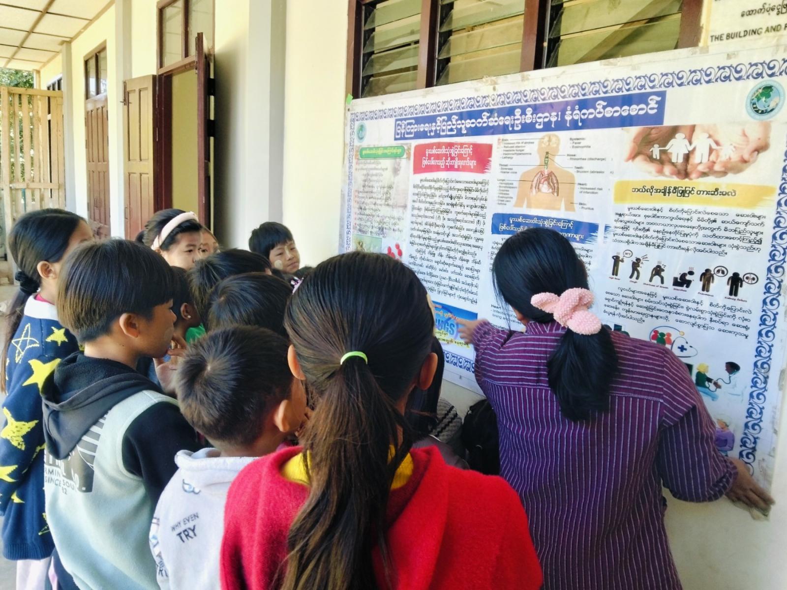 ထို့နောက် ကျောင်းသား၊ ကျောင်းသူများက ပြန်ကြားရေးနှင့်ပြည်သူ့ဆက်ဆံရေးဦးစီးဌာနမှ ပြသထားသည့် ကလေးအလုပ်သမားပပျောက်ရေးနှင့် မူးယစ်ဆေးဝါးအန္တရာယ် ကာကွယ်တားဆီးရေး နံရံကပ်စာစောင်များကို စိတ်ပါဝင်စားစွာ လေ့လာကြည့်ရှုခဲ့ကြောင်း သိရသည်။