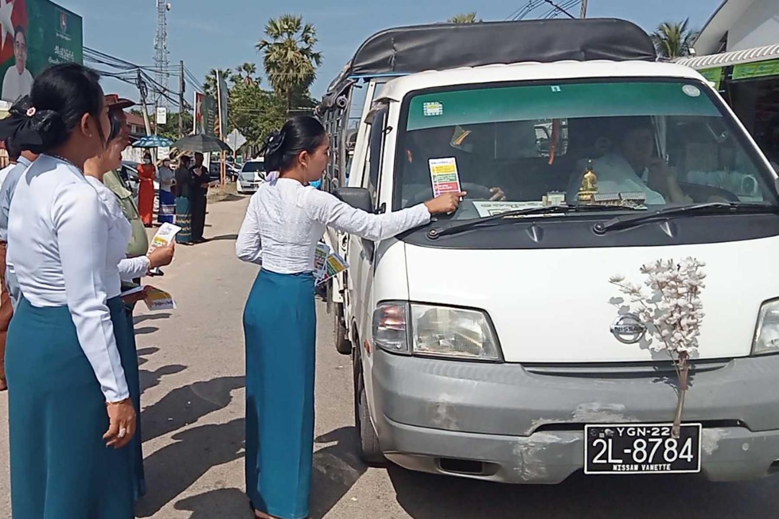 အဆိုပါလက်ကမ်းစာစောင်များကို တိုင်းဒေသကြီးပြန်ကြားရေးနှင့်ပြည်သူ့ဆက်ဆံရေးဦးစီးဌာနမှ ဦးဆောင်၍တိုင်း/ခရိုင်၊ မြို့နယ်ဝန်ထမ်းများ၊ မြို့နယ်စီမံခန့်ခွဲရေးနှင့်အုပ်ချုပ်ရေးကော်မတီဥက္ကဋ္ဌနှင့်အဖွဲ့ဝင်များ၊ မြို့နယ်ရွေးကောက်ပွဲကော်မရှင်အဖွဲ့ခွဲအဖွဲ့ဝင်များနှင့် စည်ပင် သာယာရေးအဖွဲ့တို့က ခရီးသွားလာပြည်သူများ၊ သွားလာလှုပ်ရှားနေသောပြည်သူများနှင့် ဒေသခံပြည်သူများအား ဝေငှပေးပြီး ယာဉ်များတွင်ကပ်ပေးသည်။