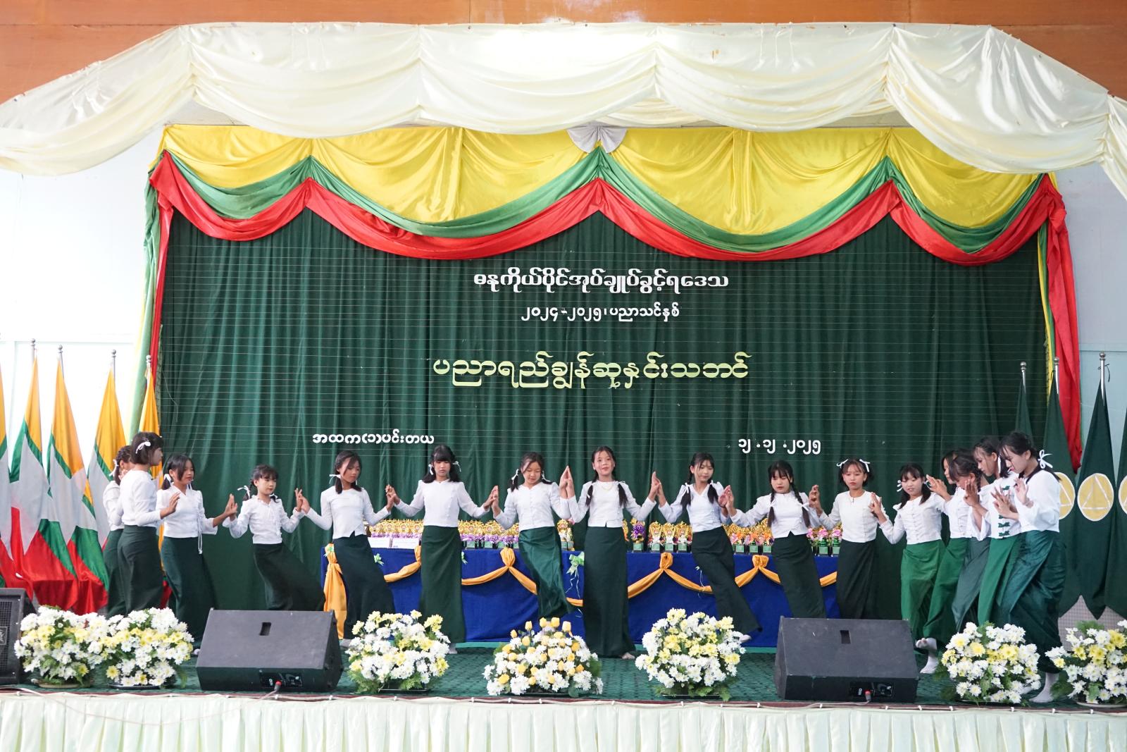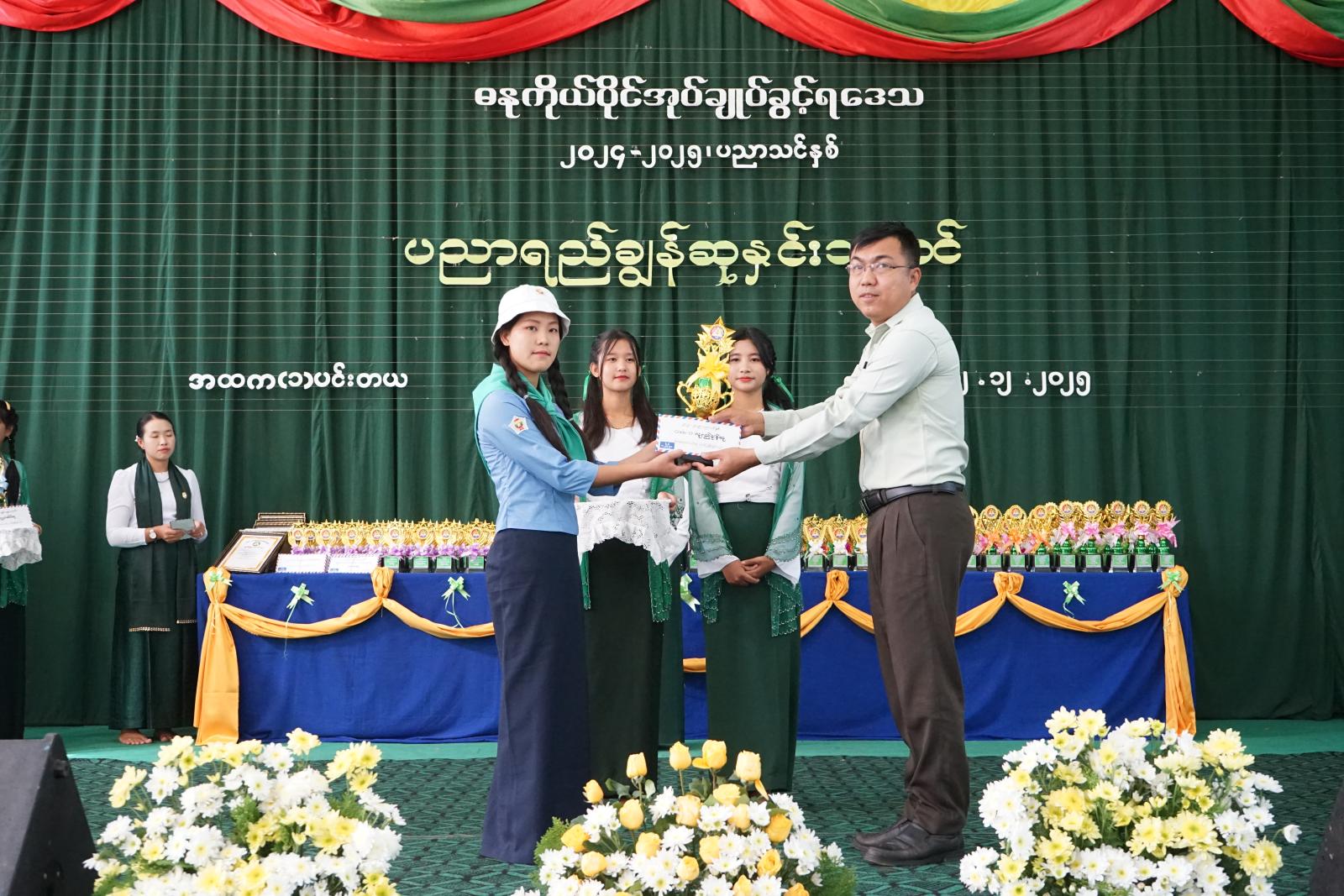 ယနေ့တွင် ကျင်းပပြုလုပ်သည့် ပညာရည်ချွန်ဆု ဂုဏ်ပြုဆုချီးမြှင့်ပွဲ အခမ်းအနားတွင် G-12 လူရည်ချွန်ဆု၊ ရှမ်းပြည်နယ်အဆင့်တွင် ဆုရရှိခဲ့သူ စန္ဒာရားအတီးရွှေတံဆိပ်ဆု၊ ပတ္တလား ဂုဏ်ပြုဆုရရှိခဲ့သူများ၊ ၂၀၂၅ ခုနှစ် တက္ကသိုလ်ဝင်တန်းစာမေးပွဲတွင် ဂုဏ်ထူးဖြင့် အောင်မြင်ခဲ့ကြသူများ၊ ၂၀၂၅ ခုနှစ် တက္ကသိုလ်ဝင်တန်းအောင်မြင်ကြသူ ကျောင်းသား/ကျောင်းသူ (၅၇)ဦး၊ မြို့နယ်အဆင့် အင်္ဂလိပ်စာစွမ်းရည်ဆုရသူ ကျောင်းသား/ကျောင်းသူ(၃)ဦး၊ ထက်/လယ်/မူ အဆင့်တို့တွင် ဆုရရှိခဲ့ကြသည့် ကျောင်းသား/ကျောင်းသူများအား ဆုများ အသီးသီးချီးမြှင့်ပေးခဲ့ကြောင်းသိရပြီး၊ အခမ်းအနားတွင် ကျောင်းသား/ကျောင်းသူများနှင့် ဓနုတိုင်းရင်းသားတေးသံရှင် ဒီနေရှင်းတို့မှ တေးသီချင်းများဖြင့် သီဆိုကပြဖျော်ဖြေ တင်ဆက်ပေးခဲ့ကြကြောင်း သိရသည်။