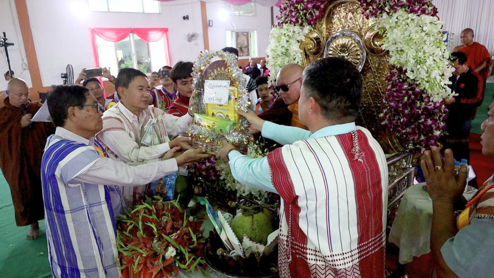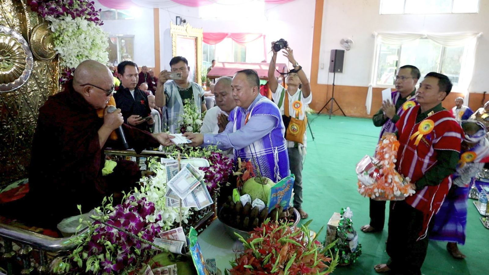 ယင်းနောက် ဒါယကာ ဒါယိကာမ ဧည့်ပရိတ်သတ်အပေါင်းတို့မှ ဒုတိယမြိုင်ကြီးငူဆရာတော်ထံမှ အနုမောဒနာတရားကိုနာယူပြီး ကရင်ပြည်နယ်အစိုးရအဖွဲ့ စီးပွားရေးရာဝန်ကြီး ဦးစောခင်မောင်မြင့်၊ လမ်းပန်းဆက်သွယ်ရေးဝန်ကြီး ဦးညီညီဇော်နှင့် အရှေ့တောင်တိုင်းစစ်ဌာနချုပ်မှ တိုင်းစစ်ဦးစီးချုပ် ဗိုလ်မှူးချုပ်ဌေးလွင်ဦးနှင့်တာဝန်ရှိသူများ ဒါယကာဒါယိကာမများမှ ဆရာတော် သံဃာတော်အရှင်သူမြတ်တို့အား လှူဖွယ်ဝတ္တုအစုစုတို့အား ဆက်ကပ်လှူဒါန်း၍ ရေစက်သွန်းချ အမျှပေးဝေခဲ့ကြောင်း သိရသည်။