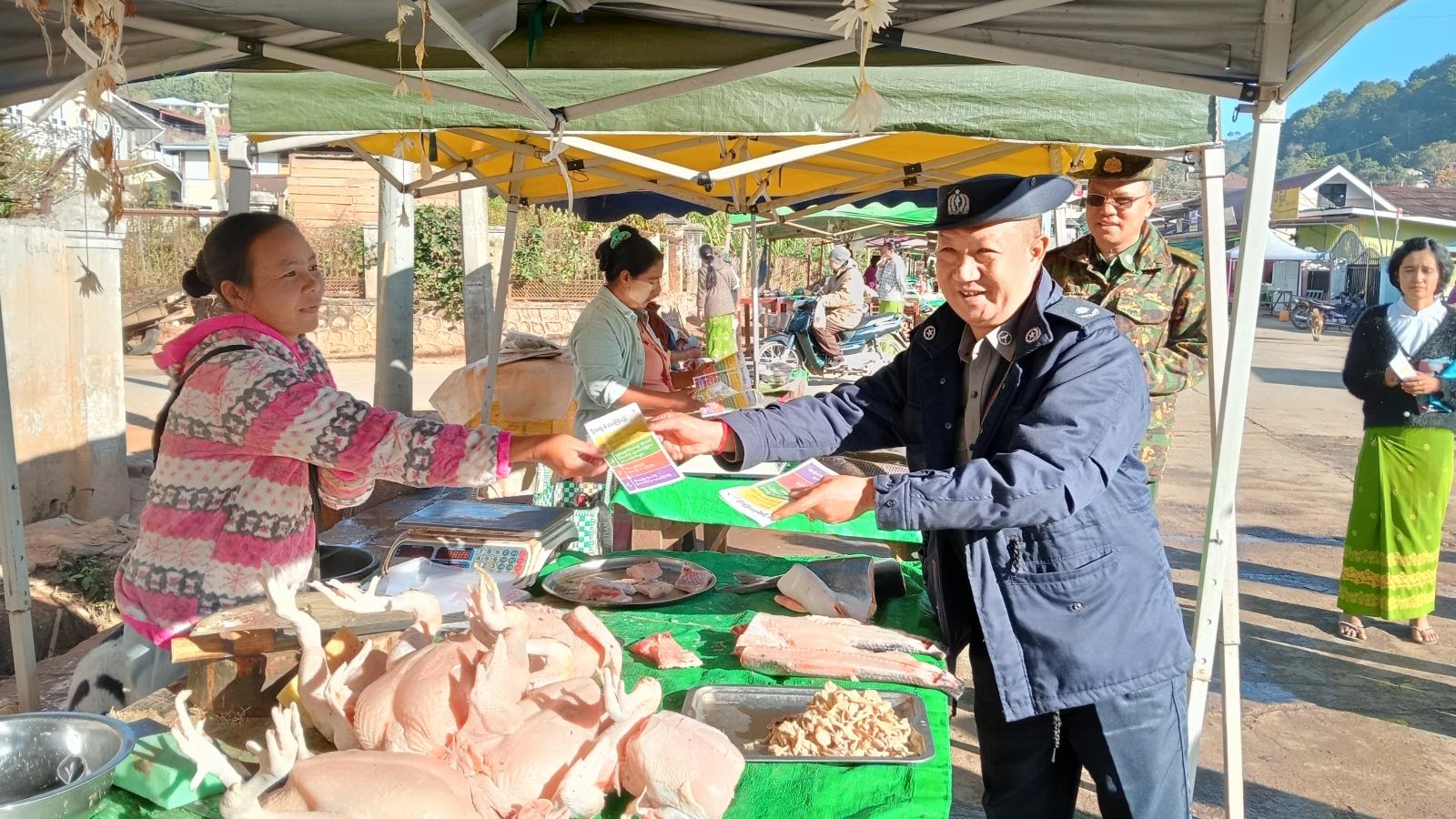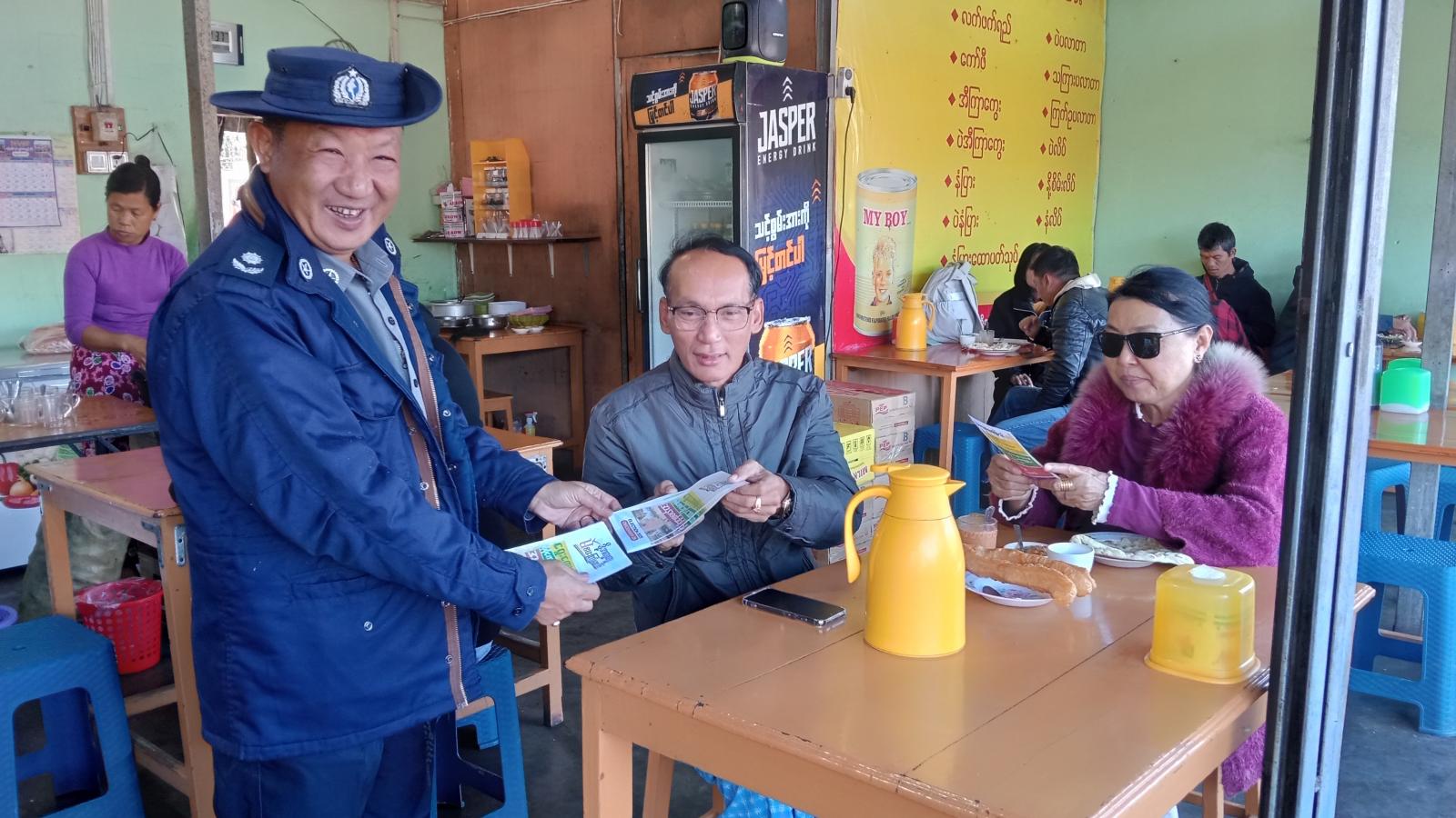 ရှမ်းပြည်နယ်တောင်ပိုင်း၊ ကလောမြို့နယ်တွင် ၂၀၂၅ ခုနှစ်၊ ပါတီစုံဒီမိုကရေစီအထွေထွေရွေးကောက်ပွဲတွင် ဆန္ဒမဲမေးပိုင်ခွင့်ရှိသည့် ပြည်သူများအားလုံး ပါဝင်မဲပေးနိုင်ရေးအတွက် ရွေးကောက်ပွဲအောင်မြင်ရေးလှုံ့ဆော်မှု “ဒို့အတူတူမဲပေးကြမည်” လက်ကမ်းစာစောင်များအား မြို့နယ်စီမံခန့်ခွဲရေးနှင့်အုပ်ချုပ်ရေးကော်မတီဥက္ကဋ္ဌနှင့်အဖွဲ့ဝင်များ၊ မြို့နယ်ရွေးကောက်ပွဲကော်မရှင်အဖွဲ့ခွဲဥက္ကဋ္ဌနှင့်အဖွဲ့ဝင်များ၊ ဌာနဆိုင်ရာတာဝန်ရှိသူများက ဒီဇင်ဘာလ ၁၃ ရက်နေ့နံနက် ၈ နာရီခွဲက ကလောမြို့မစျေးအတွင်းနှင့် လူစည်ကားသည့်နေရာများ၌ လိုက်လံ ဖြန့်ဝေခဲ့သည်။