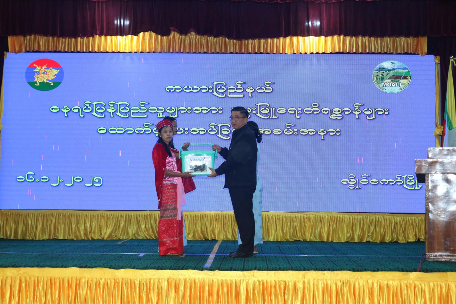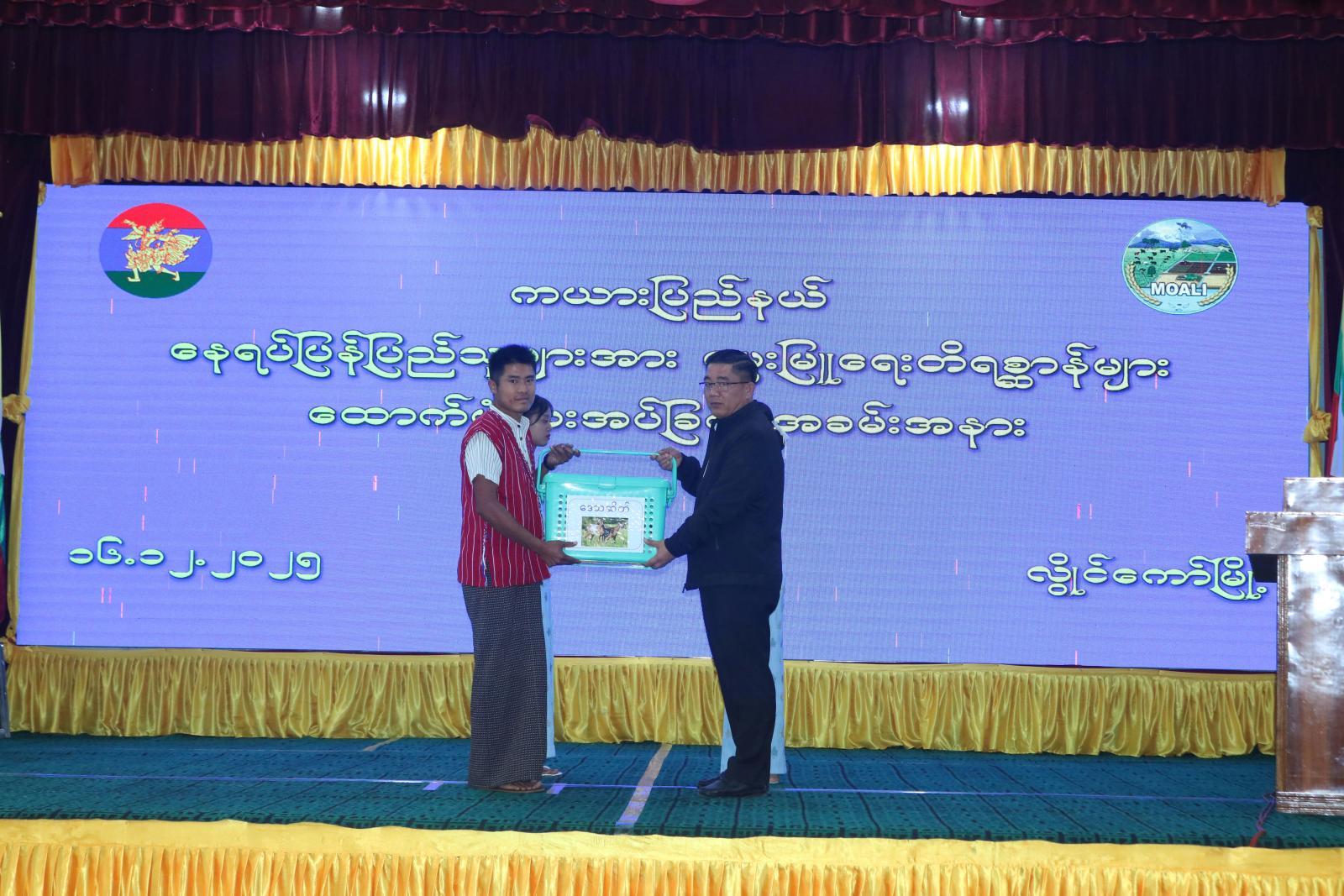 ကယားပြည်နယ်အစိုးရအဖွဲ့မှ ယာယီနေရပ်စွန့်ခွာရာမှ ပြန်လည်ရောက်ရှိနေထိုင်လျက်ရှိသည့် ဒေသခံပြည်သူများအား မွေးမြူရေးလုပ်ငန်းများ ပြန်လည်လုပ်ကိုင်နိုင်ရန် ဒေသမျိုးသန့်တိရစ္ဆာန်များပေးအပ်ခြင်းအခမ်းအနားကို ယနေ့ နံနက်က လွိုင်ကော်မြို့ မြို့နယ်ခန်းမ၌ ကျင်းပသည်။