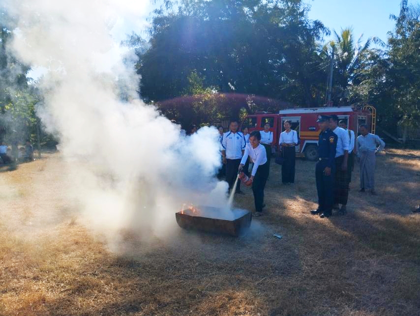 ရှေးဦးစွာ မြို့နယ်မီးသတ်ဦးစီးမှူး ဦးရှိန်းမင်းထက်၏ကြီးကြပ်မှုဖြင့် ဒုတိယဦးစီးမှူး ဦးသိန်းလင်းနိုင်က မီးဘေးအန္တရာယ် ကြိုတင်ကာကွယ်ရေးလုပ်ငန်းများနှင့်ပတ်သက်၍ အသိပညာပေးဟောပြောပြီး မီးငြှိမ်းသတ်ခြင်းအား မြို့နယ်မီးသတ်တပ်ဖွဲ့ဝင်များက လက်တွေ့သရုပ်ပြသ၍ခြင်းများ ပြုလုပ်ခဲ့သည်။