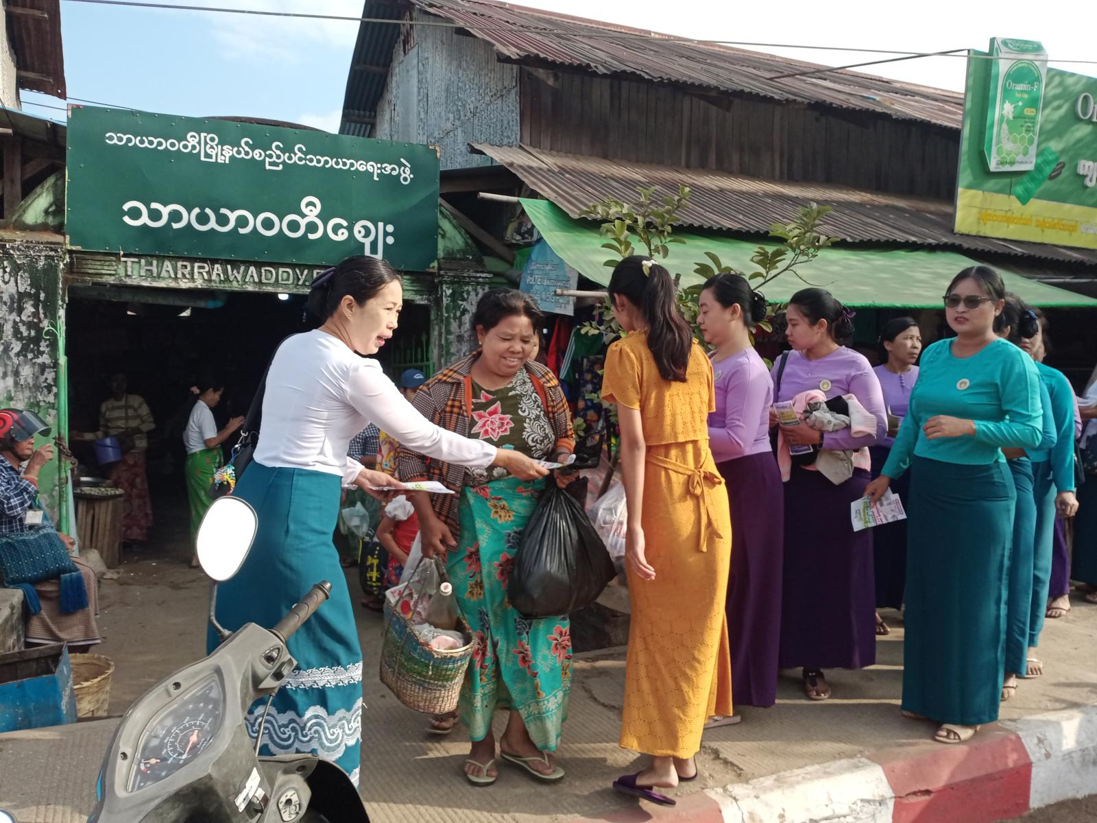 အသိပညာပေးလက်ကမ်းစာစောင်များ ဖြန့်ဝေရာတွင် ကျောက်ဆည်ခရိုင် ပြန်ကြားရေးနှင့်ပြည်သူ့ဆက်ဆံရေးဦးစီးဌာနမှ လက်ထောက်ညွှန်ကြားရေးမှူး ဒေါ်တင်သူဇာလှိုင်နှင့်ဝန်ထမ်းများမှ မြို့မဈေးရှိဈေးရောင်းသည့် ဈေးသည်များ၊ ဈေးဝယ်ပြည်သူများအား ဖြန့်ဝေခဲ့ကြောင်း သိရသည်။