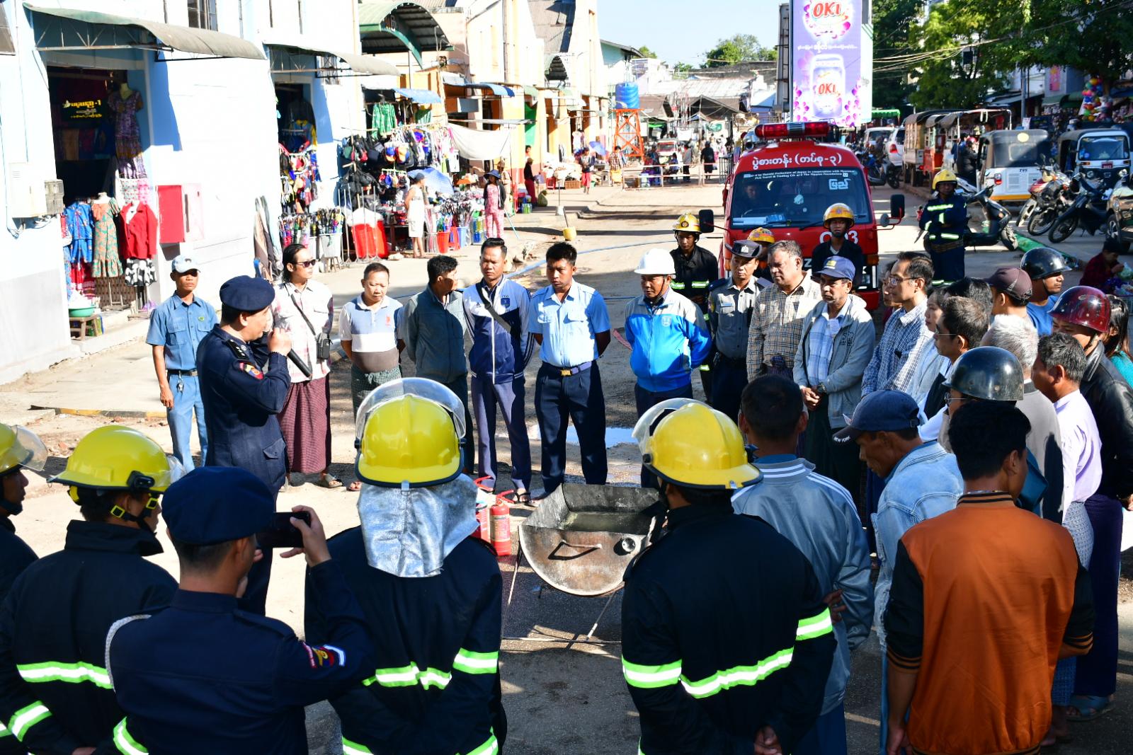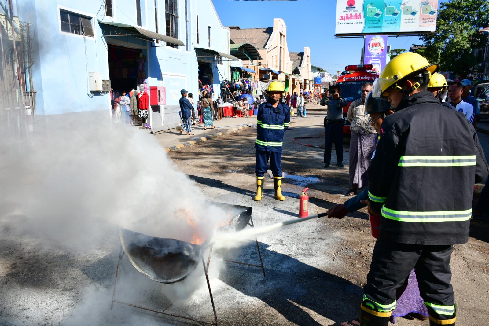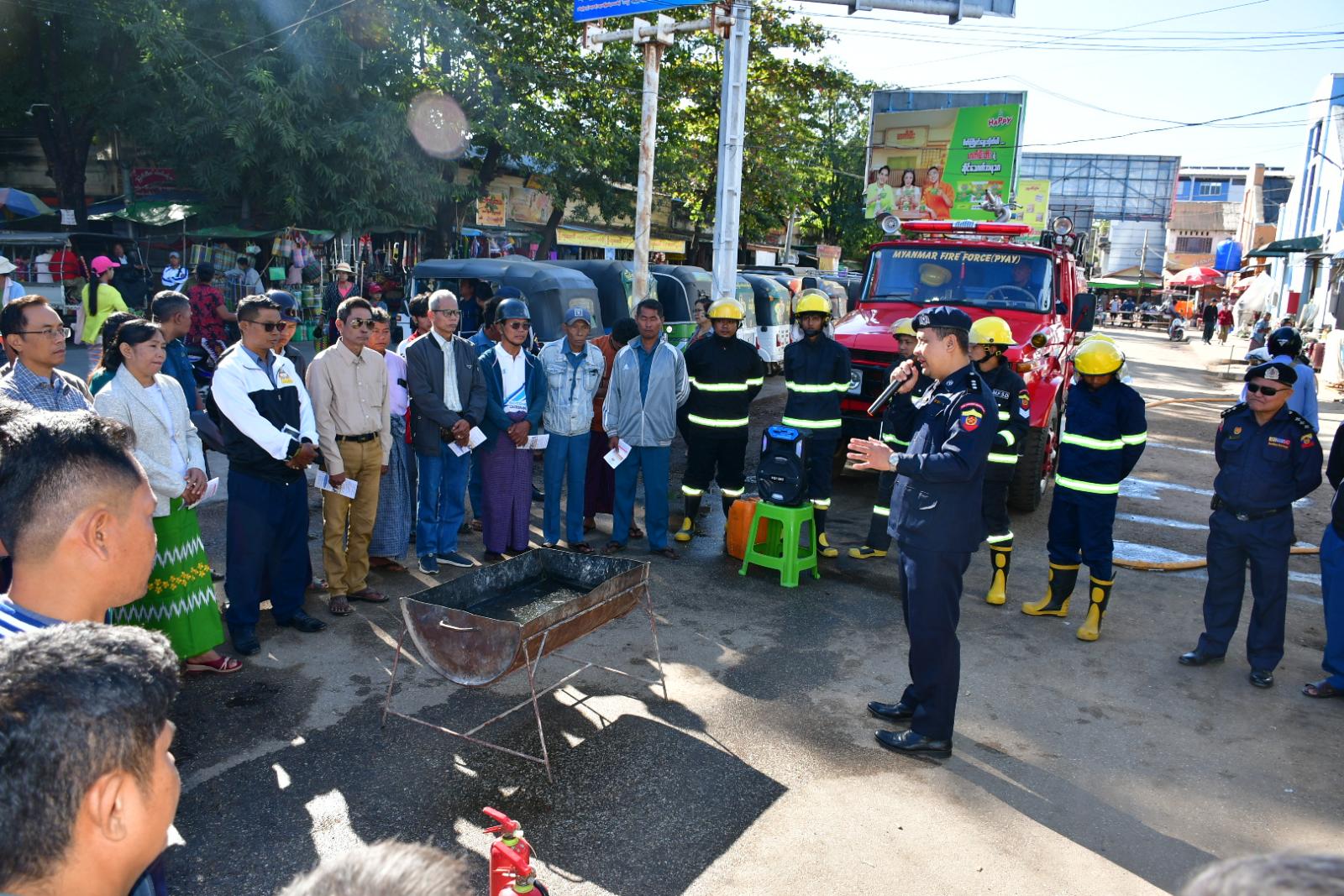 ထိုသို့ဆောင်ရွက်ရာတွင် မြို့နယ်မီးသတ်ဦးစီးဌာနမှူး ဦးကျော်လင်းစိုးက မီးလောင်မှုမှုများ မဖြစ်ပေါ်ရေးအတွက် လိုက်နာဆောင်ရွက်ရမည့် မီးဘေးကြိုတင်ကာကွယ်နည်းလမ်းများအကြောင်းကို ဆွေးနွေးပြောကြားပြီး သန္ဓေနှင့် အရန်မီးသတ်တပ်ဖွဲ့ဝင်များက ဈေးသူဈေးသားများအား မီးသတ်ဆေးဘူးနှင့် ရေစိုအဝတ်တို့ဖြင့် လက်တွေ့မီးငြှိမ်းသတ်နည်း လေ့ကျင့်မှုများ ဆောင်ရွက်ပေးကာ မီးသတ်ပိုက်ဖြင့် မီးငြှိမ်းသတ်နည်းသရုပ်ပြဆောင်ရွက်ခဲ့ကြောင်း သိရသည်။