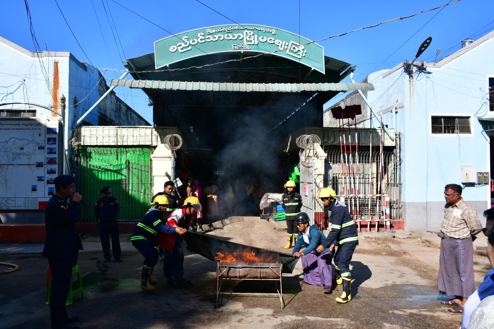 ပဲခူးတိုင်းဒေသကြီး ပြည်မြို့ ကမ်းနားလမ်းရှိ စည်ပင်သာယာမြို့မဈေးကြီး၌ ယနေ့နံနက်ပိုင်းက မြို့နယ်မီးသတ်ဦးစီးဌာနမှူး ဦးဆောင်သော သန္ဓေနှင့်အရန်မီးသတ်တပ်ဖွဲ့ဝင်များ၊ မြို့နယ်စည်ပင်သာယာရေးအဖွဲ့တာဝန်ရှိသူများနှင့် ဈေးသူဈေးသားများပူးပေါင်း၍ မီးဘေးကြိုတင်ကာကွယ်ရေး သရုပ်ပြဇာတ်တိုက်လေ့ကျင့်မှု ဆောင်ရွက်သည်။