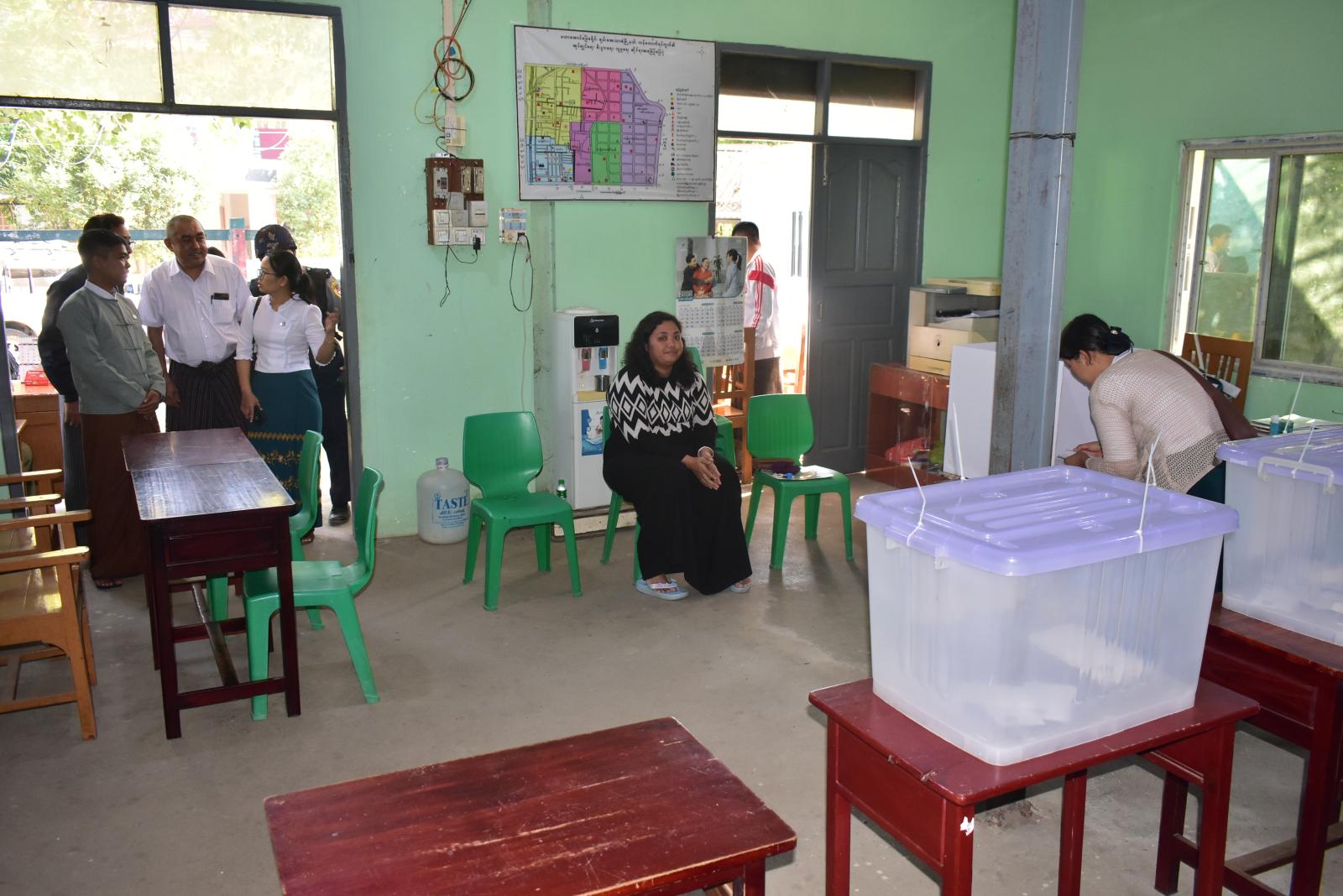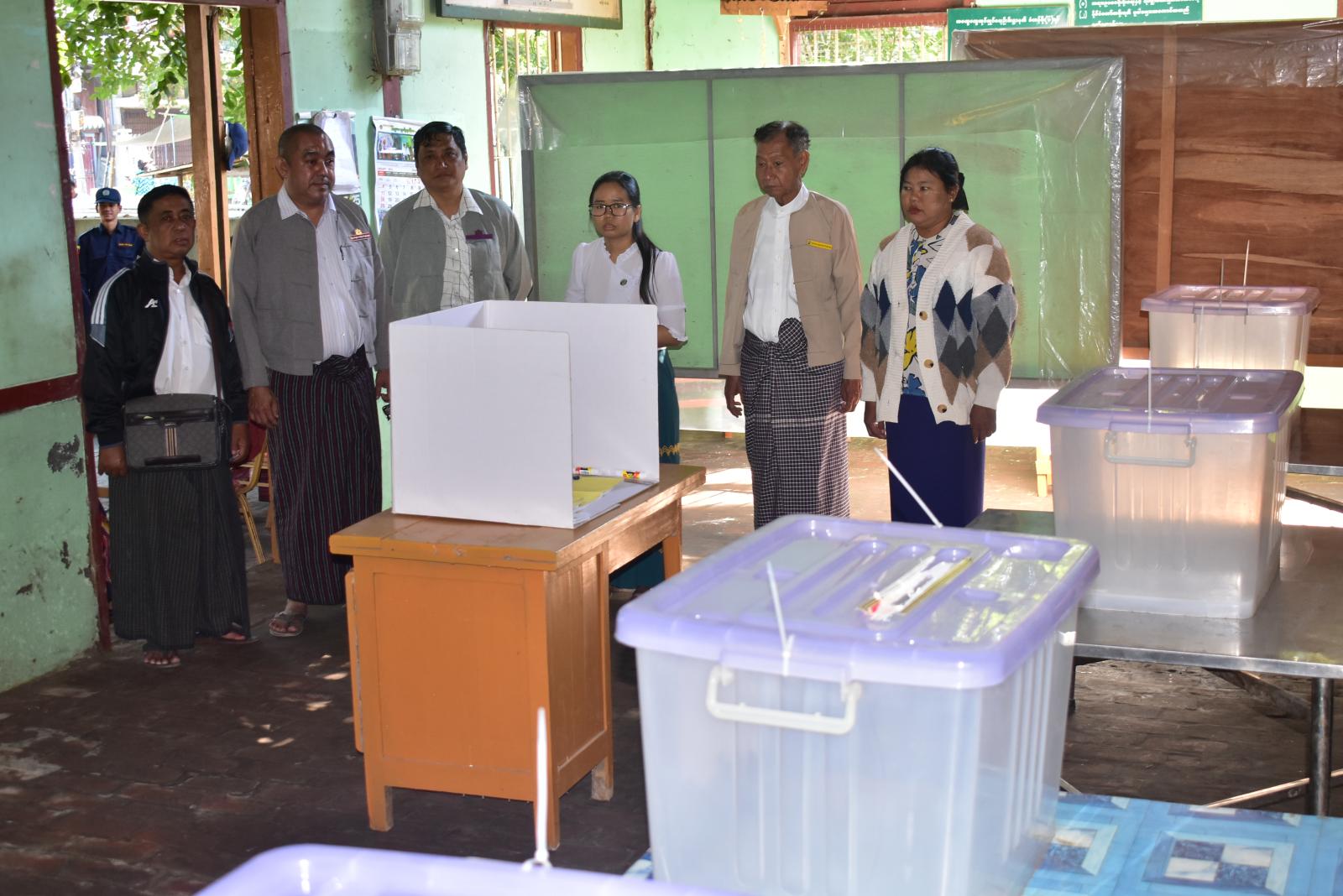 ချမ်းအေးသာစံမြို့နယ်အတွင်းရှိ မဲရုံများ၌ ကြိုတင်ဆန္ဒမဲပေးနေမှုများအား သက်ဆိုင်ရာတာဝန်ရှိသူများက လိုက်လံကြည့်ရှု