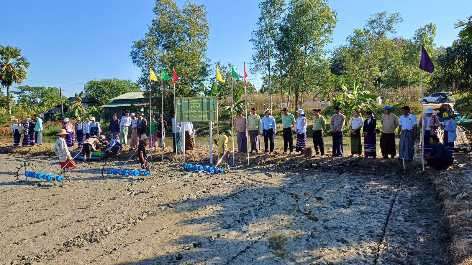 ဧရာဝတီတိုင်းဒေသကြီး၊ ဖျာပုံခရိုင်၊ ဖျာပုံမြို့နယ်၊ ကျုံတာကျေးရွာအုပ်စု၊ ဖျာပုံ-ကျိုက်လတ်ကားလမ်းဘေး၊ ကွင်းအမှတ်(၄၅၇/A)၊ ဦးပိုင်အမှတ်(၁၉/၂)၊ ဧရိယာ(၇)ဧကရှိ တောင်သူ ဦးမောင်မောင်၏ လယ်ယာမြေတွင် ယနေ့ နံနက် (၉) နာရီအချိန်က နွေစပါးစိုက်ပျိုးရာသီ၌ ကြဲခင်းစနစ်လျော့နည်းပပျောက်ရေး မျိုးစေ့ချကိရိယာ (Drum Seeder)ဖြင့် စိုက်ပျိုးပြသခြင်းကွင်းသရုပ်ပြပွဲနှင့် ကန်သင်းဘောင်တွင် ကျင်းတစ်ထောင် ဆီတစ်ပုံး နေကြာစိုက်ပျိုးထားရှိမှုအား ခရိုင်၊ စိုက်ပျိုးထုတ်လုပ်မှုတိုးတက်မြင့်မားရေး လုပ်ငန်းကြီးကြပ်မှုကော်မတီဥက္ကဋ္ဌနှင့် တာဝန်ရှိသူများ ကြည့်ရှုအားပေးခဲ့ကြသည်။