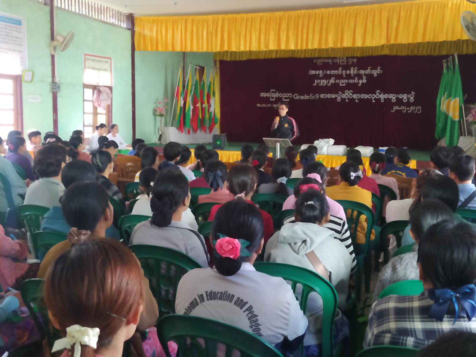 အခမ်းအနားတွင် မြို့နယ်ပညာရေးမှူးရုံးမှ မြို့နယ်ပညာရေးမှူး ဒေါ်ကြူကြူမာနှင့် တောင်ငူခရိုင် ပညာရေးမှူးရုံးမှ ဦးစီးအရာရှိ ဦးရဲထွဋ်ကိုတို့က အမှာစကားပြောကြားခဲ့သည်။ ဆက်လက်၍ မြို့နယ်ပညာရေးမှူးက အခြေခံပညာမူလတန်းအဆင့် G-5 နှင့် အလယ်တန်းအဆင့် G-9 စာမေးပွဲဆိုင်ရာ အလုပ်ရုံဆွေးနွေးပွဲဖြစ်သည့်အတွက် စာမေးပွဲနှင့်သက်ဆိုင်သည့် မေးခွန်းများနှင့် အမှတ်ပေးစည်းမျဥ်းများအား သိရှိစေရန်၊ အလုပ်ရုံဆွေးနွေးပွဲပြုလုပ်ရခြင်း၏ ရည်ရွယ်ချက်များအား ရှင်းလင်းပြောကြားခဲ့သည်။