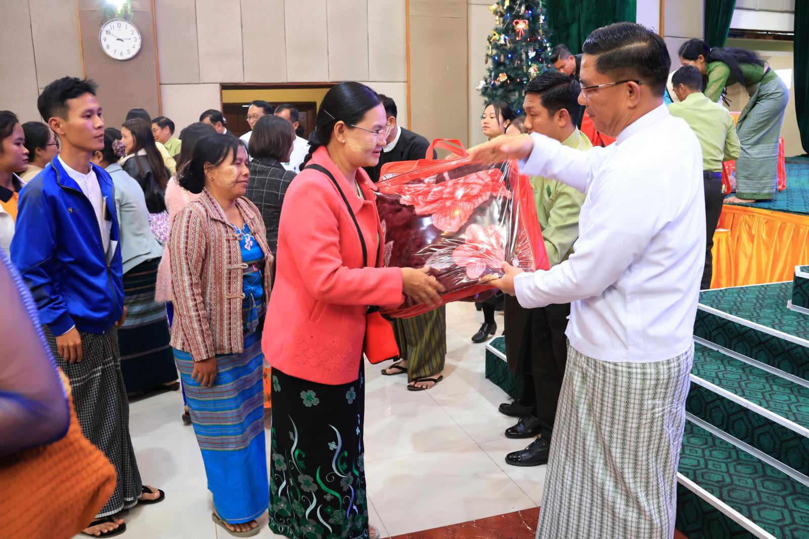 ထို့နောက် ပြည်နယ်ဝန်ကြီးချုပ်က ဒေသကွပ်ကဲရေးမှူး၊ ပြည်နယ်တရားသူကြီးချုပ်၊ ပြည်နယ်အစိုးရအဖွဲ့ဝင်များနှင့် ခရစ်ယာန်ဘာသာဝင် ဌာနဆိုင်ရာတာဝန်ရှိသူများအတွက် ခရစ္စမတ်လက်ဆောင်ပစ္စည်းများပေးအပ်ရာ သယံဇာတရေးရာဝန်ကြီးနှင့် ဌာနဆိုင်ရာတာဝန်ရှိသူနှစ်ဦးက လက်ခံရယူသည်။