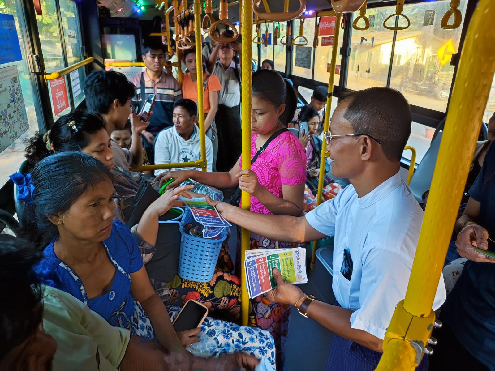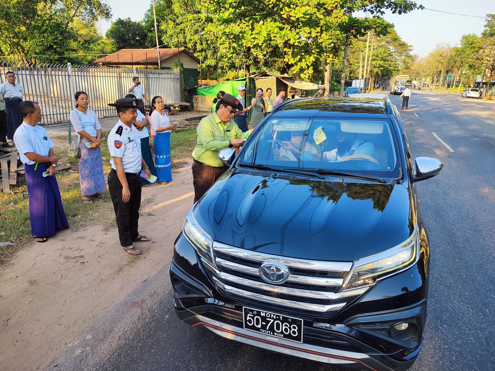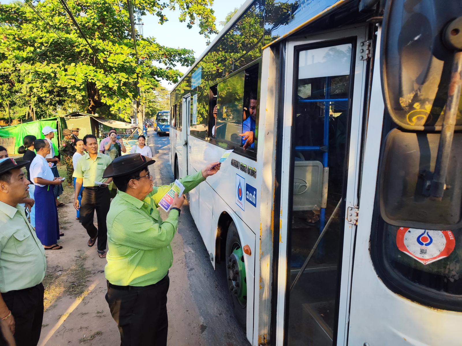 ထိုသို့ ဖြန့်ဝေဆောင်ရွက်ခြင်းကို ခရိုင်စီမံခန့်ခွဲရေးနှင့်အုပ်ချုပ်ရေးကော်မတီဥက္ကဋ္ဌ ဦးစိုးနိုင်၊ မြို့နယ် စီမံခန့်ခွဲရေးနှင့်အုပ်ချုပ်ရေးကော်မတီဥက္ကဋ္ဌ ဦးပြည့်ဖြိုးမောင်တို့ကဦးဆောင်၍ မြို့နယ်အထွေထွေအုပ်ချုပ်ရေးဦးစီးဌာနမှဝန်ထမ်များ၊ မြို့နယ်စည်ပင်သာယာရေးအဖွဲ့အမှုဆောင်အရာရှိ ဦးခင်ဦး၊ မြို့နယ်မီးသတ်ဦးစီးဌာနမှဝန်ထမ်းများ၊ ကျန်းမာရေးဝန်ထမ်းများ၊ မြို့နယ်ပြန်ကြားရေးနှင့်ပြည်သူ့ဆက်ဆံရေးဦးစီးဌာနမှ ဝန်ထမ်းများ၊ မြို့နယ်အဆင့် ဌာနဆိုင်ရာတာဝန်ရှိသူများနှင့် ရပ်ကွက်အုပ်ချုပ်ရေးမှူးများ ပါဝင်သောပူးပေါင်းအဖွဲ့က “ဒို့အတူတူမဲပေးကြမယ်”၊ “ရွေးကောက်ပွဲမှသည် ပိုမိုကောင်းမွန်သောအနာဂတ်ဆီသို့”၊ “ဒီမိုကရေစီကို ပြန်လည်ဖော်ဆောင်ဖို့အတွက် ရွေးကောက်ပွဲမှလွဲ၍ အခြားနည်းမရှိပါ”၊ “ပြည်သူများလိုလားသည့် ဒီမိုကရေစီနိုင်ငံတော်ကို ရွေးကောက်ပွဲဖြင့်သာဖော်ဆောင်နိုင်ပါသည်”၊ “ဒီမိုကရေစီခိုင်မြဲဖို့မဲရုံသွားပြီးမဲပေးကြပါစို့”၊ “နိုင်ငံဖွံ့ဖြိုးတိုးတက်ဖို့ဦးဆောင်နိုင်သူ ရွေးချယ်ကြပါစို့”စသည့် အကြောင်းအရာများပါဝင်သည့် လက်ကမ်းစာစောင်များကိုလူစည်ကားရာနေရာများ၊YBS ကားပေါ်များ၊ သုံးဘီး၊ ဆိုင်ကယ်၊ အနှေးယာဉ်ဂိတ်များရှိပြည်သူများထံ ဖြန့်ဝေပေးခဲ့ကြောင်း သိရသည်။