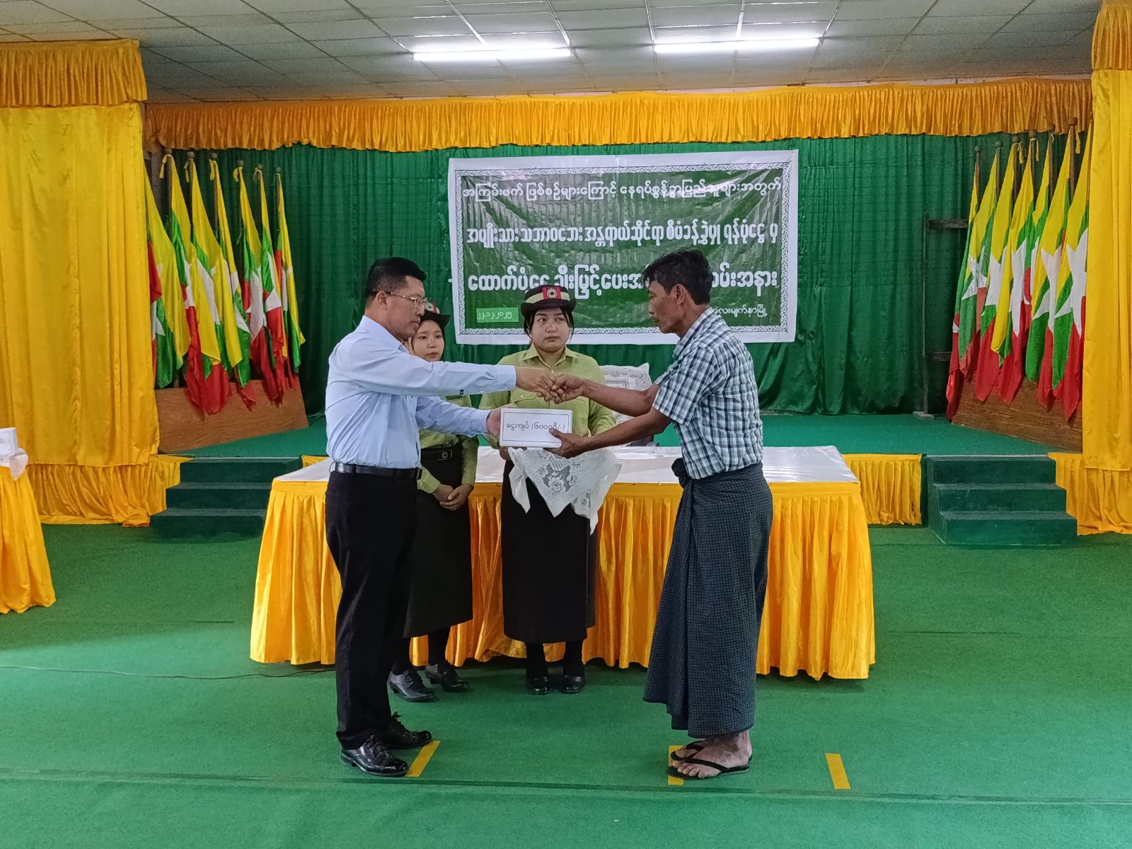 ဦးစွာ ဧရာဝတီတိုင်းဒေသကြီးအစိုးရအဖွဲ့ ဝန်ကြီးချုပ် ဦးတင်မောင်ဝင်းက အဖွင့်အမှာစကားပြောကြားခဲ့ပြီး ဧရာဝတီတိုင်းဒေသကြီးအစိုးရအဖွဲ့ဝန်ကြီးချုပ် ဦးတင်မောင်ဝင်း၊ ဧရာဝတီတိုင်းဒေသကြီးအစိုးရအဖွဲ့ လုံခြုံရေးနှင့် နယ်စပ်ရေးရာဝန်ကြီး ဗိုလ်မှူးကြီးခန့်မွန်ဆွေ၊ ဧရာဝတီတိုင်းဒေသကြီး လမ်းပန်းဆက်သွယ်ရေးဝန်ကြီး ဦးအောင်စန်းချစ်တို့က နေရပ်စွန့်ခွာ၍ ယာယီရောက်ရှိလာသော တိုက်ပွဲရှောင်ပြည်သူများအား တစ်ဦးလျှင် ထောက်ပံ့ငွေ (၆၀၀၀၀ိ/)ကျပ်အား (၃)လစာထောက်ပံ့ပေးအပ်ခဲ့သည်။ ဆက်လက်၍ နေရပ်စွန့်ခွာ၍ ယာယီရောက်ရှိလာသော တိုက်ပွဲရှောင်ပြည်သူတစ်ဦးချင်းအား မြို့နယ်အထွေထွေအုပ်ချုပ်ရေးဦးစီးဌာနမှ ဝန်ထမ်းများက ထောက်ပံ့ငွေများပေးအပ်နေမှုကို ဧရာဝတီတိုင်းဒေသကြီးအစိုးရအဖွဲ့ဝန်ကြီးချုပ် ဦးတင်မောင်ဝင်းနှင့် တာဝန်ရှိသူများက ကြည့်ရှုအားပေးခဲ့သည်။