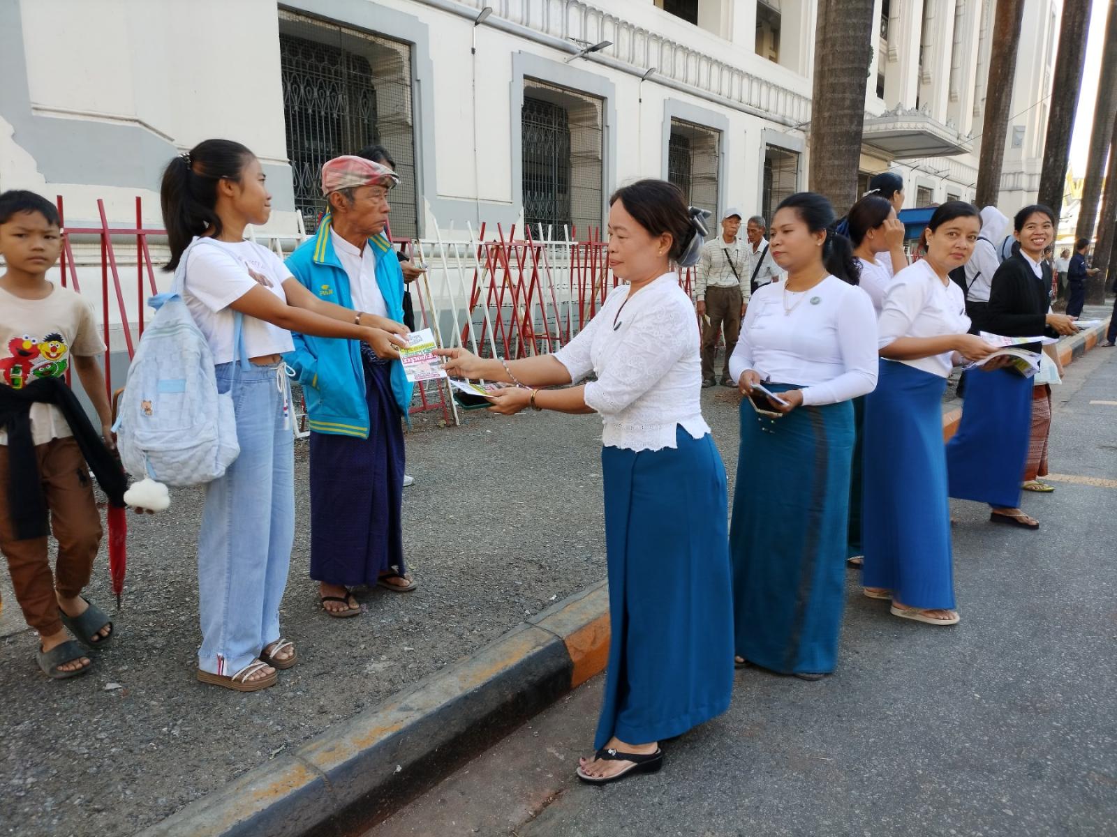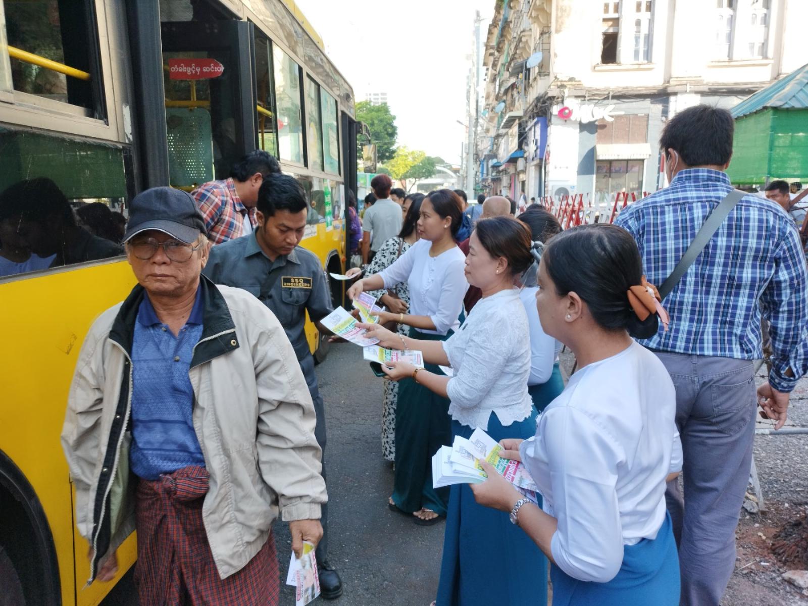 ထိုသို့ ဖြန့်ဝေရာနေရာသို့ ရန်ကုန်တိုင်းဒေသကြီးအစိုးရအဖွဲ့၊ ဝန်ကြီးချုပ် ဦးစိုးသိန်းနှင့် အစိုးရအဖွဲ့ဝင်များ၊ တိုင်းဒေသကြီးအဆင့်ဌာနဆိုင်ရာများ၊ ခရိုင်စီမံခန့်ခွဲရေးနှင့် အုပ်ချုပ်ရေးကော်မတီဥက္ကဋ္ဌနှင့် အဖွဲ့ဝင်များ၊ ခရိုင်အဆင့်ဌာနဆိုင်ရာများ၊ မြို့နယ်စီမံခန့်ခွဲရေးနှင့် အုပ်ချုပ်ရေးကော်မတီဥက္ကဋ္ဌနှင့် အဖွဲ့ဝင်များ၊ မြို့နယ်အဆင့်ဌာနဆိုင်ရာဝန်ထမ်းများ၊ လူမှုရေးအသင်းအဖွဲ့များမှ တက်ရောက်ပါဝင်လျက် ခရီးသွားပြည်သူများ၊ လမ်းသွားလမ်းလာပြည်သူများအား လက်ကမ်းစာစောင် (၅၀၀၀) ကို ဖြန့်ဝေခဲ့ကြကြောင်း သိရသည်။