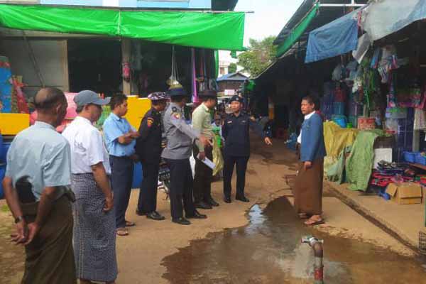 ထိုသို့ကွင်းဆင်းစစ်ဆေးခြင်းကို မြို့နယ်စီမံခန့်ခွဲရေးနှင့်အုပ်ချုပ်ရေးကော်မတီဥက္ကဋ္ဌ မြို့နယ်အုပ်ချုပ် ရေးမှူး ဦးကျော်မျိုးနိုင် ဦးဆောင်ကြီးကြပ်မှုဖြင့် မြို့နယ်မီးသတ်ဦးစီးဌာနမှူး ဦးသန်းဌေးအောင်၊ မြို့နယ်ရဲတပ်မှူးရဲမှူး ဉာဏ်ထွန်း၊ မြို့နယ်စည်ပင်သာယာရေးအဖွဲ့အမှုဆောင်အရာရှိ ဦးမျိုးလွင်နှင့် မြို့နယ်လျှပ်စစ်ဦးစီးမှူးဦးကျော် စိုးထိုက်တို့က ဈေးအတွင်းတည်ခင်းရောင်းချလျက်ရှိသည့် ဈေးဆိုင်များ၌ မီးဘေးအန္တရာယ်လုံခြုံရေးအတွက် မီးသတ်ဆေးဘူး တပ်ဆင်ထားရမည်ဖြစ်ကြောင်း၊ သုံးစွဲနေသည့်မီးသတ်ဆေးဘူးများ ကောင်းမွန်မှုရှိ/မရှိနှင့် သက်တမ်းလွန်မဖြစ်စေရေး သတိပြုရမည် ဖြစ်ကြောင်း၊ ဆိုင်ခန်းများတွင်တပ်ဆင်ထားသည့် လျှပ်စစ်ဝါယာကြိုးများ ကောင်းမွန်မှုရှိ/မရှိ စစ်ဆေးခြင်း၊ ဈေးအတွင်းအသုံးပြုနေသည့် ရေတွင်း၊ ရေကန်ရေပိုက်ခေါင်းများ ကောင်းမွန်မှု ရှိ/မရှိနှင့်အပေါ့စားမီးသတ်စက်အစရှိသည့် မီးချိတ်/မီးကပ်၊ မီးသတိပြုရေးစာတမ်းများ ချိတ်ဆွဲထားခြင်း၊ မီးသတ်ဆေးဘူး စနစ်တကျထားရှိမှုရှိ/မရှိတို့ကို လိုက်လံစစ်ဆေးပြီး အရေးပေါ်အခြေအနေဖြစ်ပေါ်ပါက မီးသတ်ဆေးဘူးအသုံးပြုနည်းနှင့် မီးငြှိမ်းသတ်ခြင်းတို့ကို သရုပ်ပြရှင်းလင်းပေးသည်။