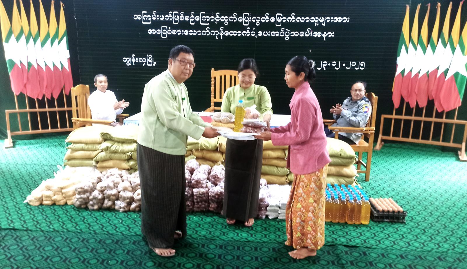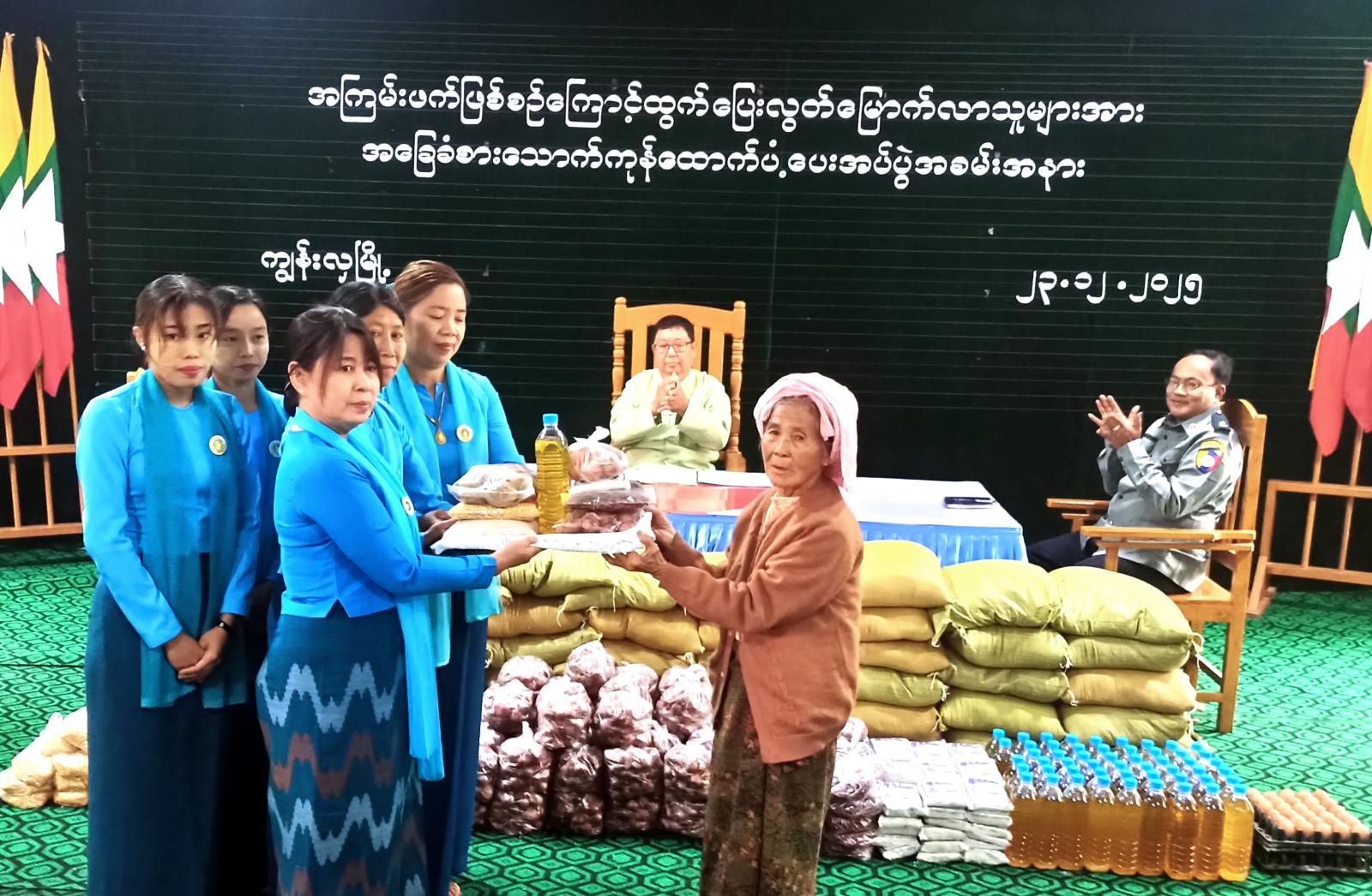 ထို့နောက် မြို့နယ်စီမံခန့်ခွဲရေးနှင့် အုပ်ချုပ်ရေးကော်မတီဥက္ကဋ္ဌနှင့် အဖွဲ့ဝင်များ၊ မြို့နယ်အမျိုးသမီးရေးရာအဖွဲ့ဥက္ကဋ္ဌ ဒေါ်စုစုလွင်နှင့် အဖွဲ့ဝင်များ၊ မြို့နယ်မိခင်နှင့် ကလေးစောင့်ရှောက်ရေးအသင်းဝင်များ၊ မြို့မိမြိုဖများက အကြမ်းဖက်ဖြစ်စဉ်ကြောင့် ထွက်ပြေးလွတ်မြောက်လာသူ (၅၄) ဦးအား စုစုပေါင်း ငွေကျပ် ၄၁၇၆၉၀၀ တန်ဖိုးရှိ ဆန်၊ ဆီ၊ ဆားအပါဝင် အခြေခံစားသောက်ကုန် (၈) မျိုးကို တစ်ဦးချင်းလက်ဝယ်အရောက် ပေးအပ်ခဲ့ကြောင်း သိရသည်။