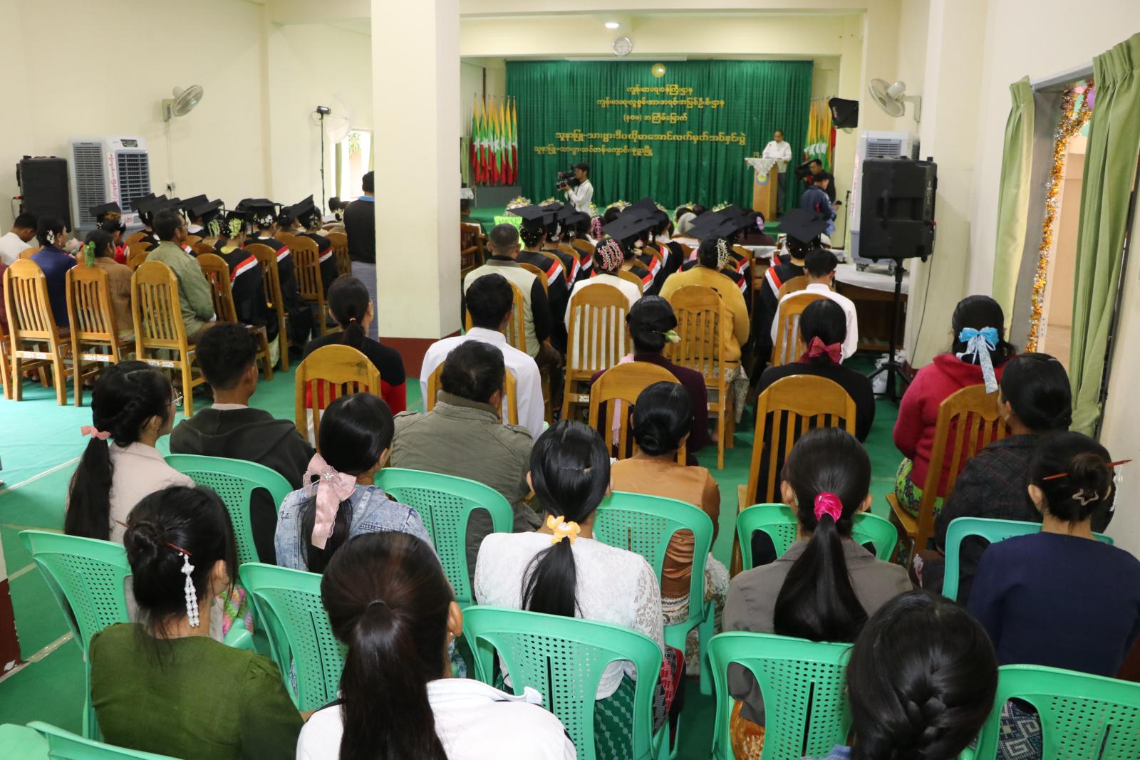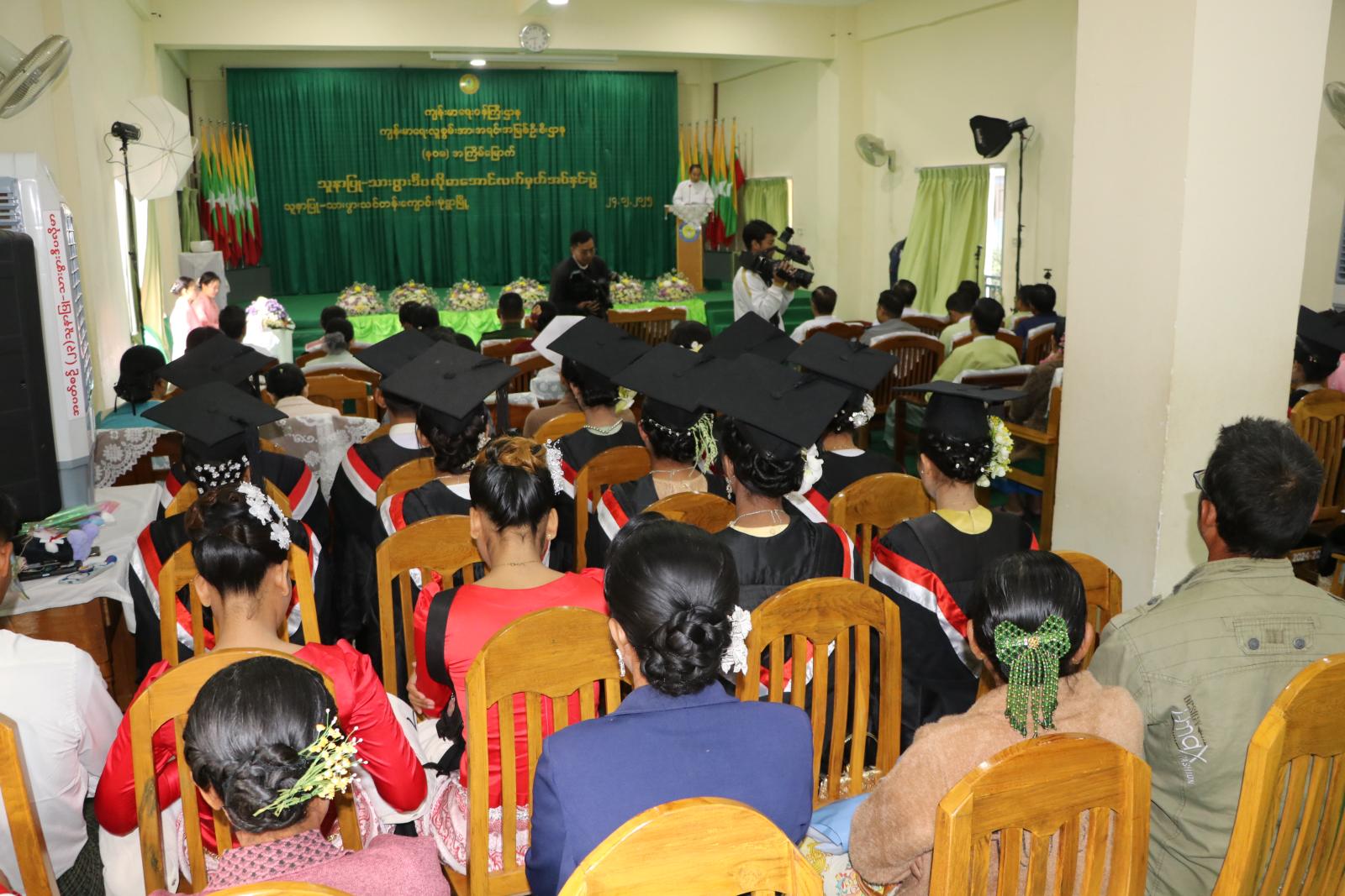 ယင်းနောက် တိုင်းဒေသကြီး ပြည်သူ့ကျန်းမာရေးနှင့်ကုသရေးဦးစီးဌာန တိုင်းဒေသကြီးဦးစီးမှူး ဒေါက်တာမြင့်ကျော်က သင်တန်းဆင်းမောင်မယ်များအား အမှာစကားပြောကြားပြီး မုံရွာသူနာပြုနှင့်သားဖွားသင်တန်းကျောင်း၊ ကျောင်းအုပ်ဆရာမကြီးက သင်ကြားရေးတာဝန်ခံ ဆရာမကြီးထံ အောင်လက်မှတ်များအား လွှဲပြောင်းပေးအပ်သည်။