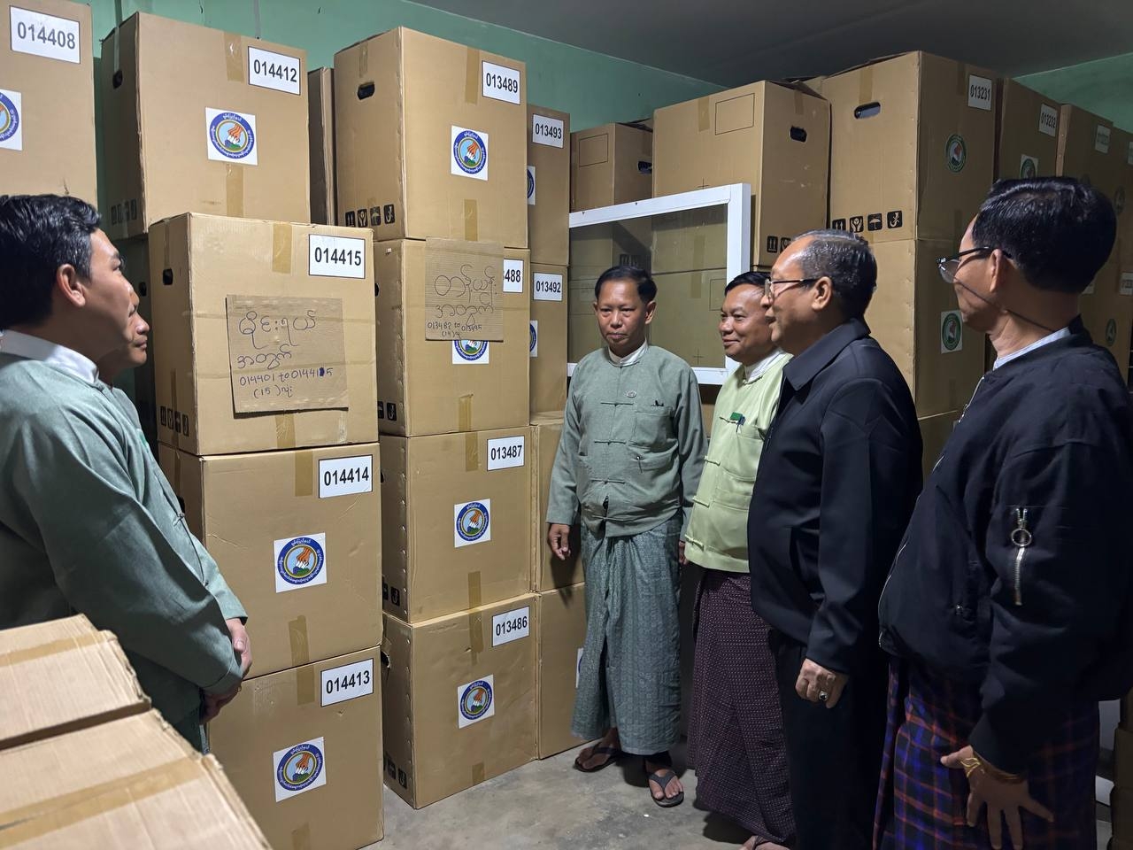 ဆက်လက်၍ ပြည်ထောင်စုရွေးကောက်ပွဲကော်မရှင်အဖွဲ့ဝင် ရှမ်းပြည်နယ် (မြောက်ပိုင်း)တာဝန်ခံ ဦးမြင့်ဦးသည် တာဝန်ရှိသူများနှင့်အတူ မဲရုံအလိုက်ဖြန့်ခွဲမည့် မြန်မာအီလက်ထရောနစ် မဲပေးစက် (MEVM) စက်များ ထိန်းသိမ်းထားရှိမှုများအား ကြည့်ရှုစစ်ဆေးခဲ့ကြောင်း သိရသည်။