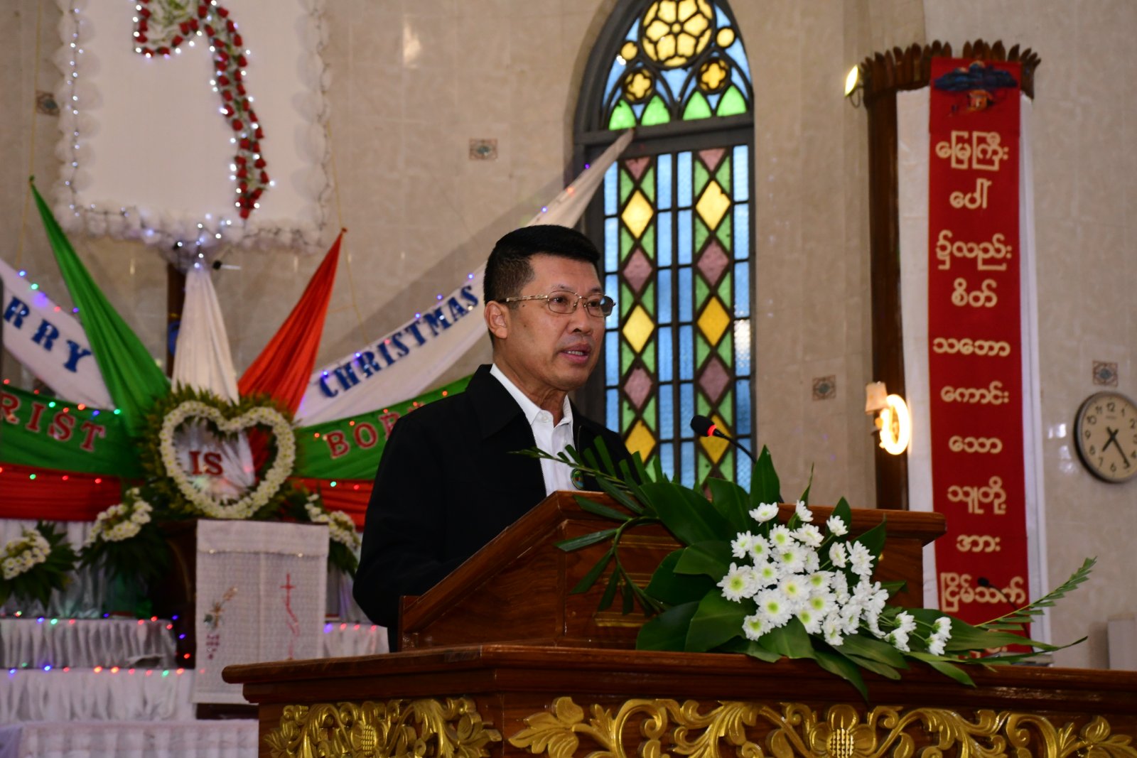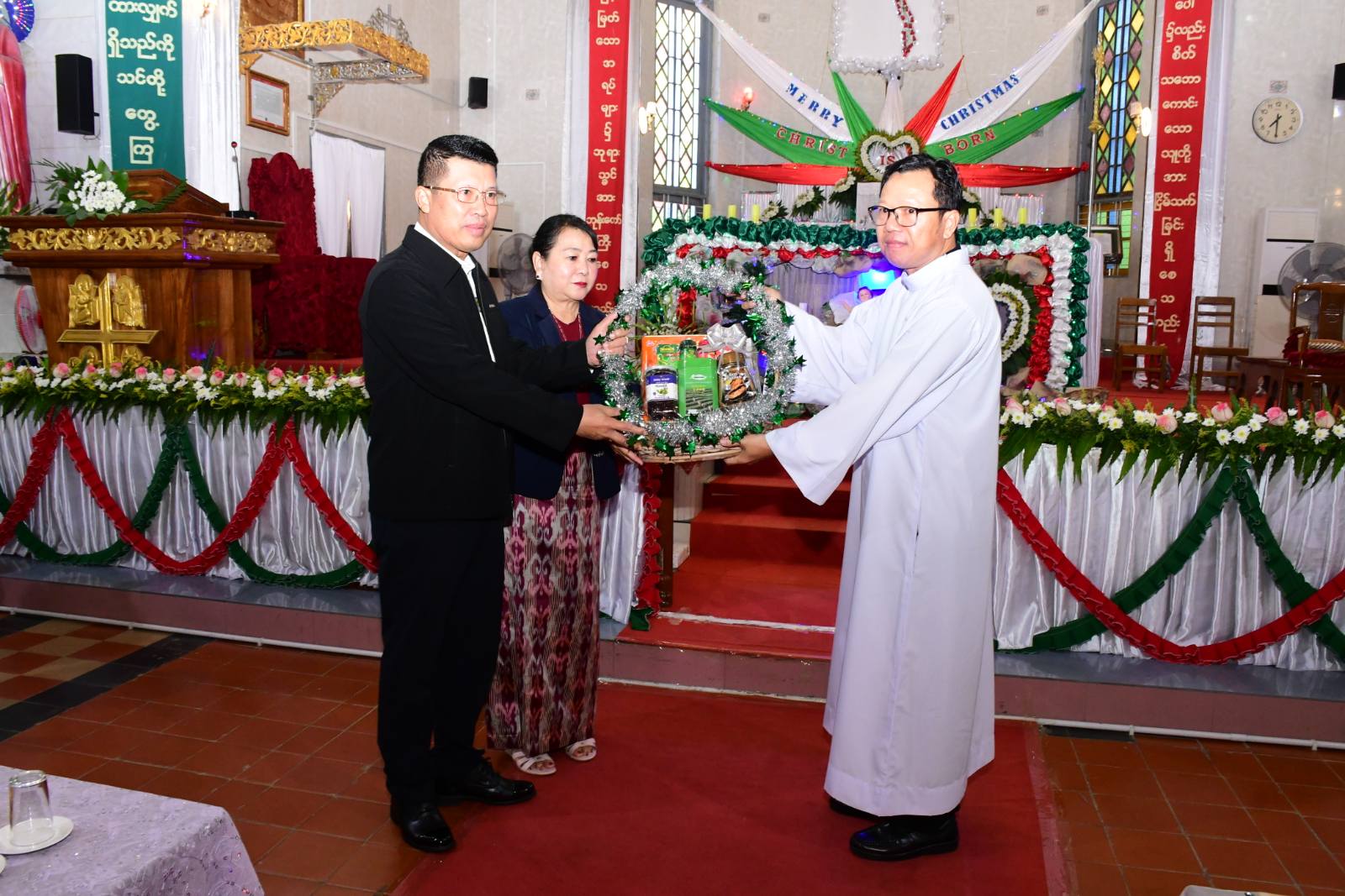 ထို့နောက် တိုင်းဒေသကြီးဝန်ကြီးချုပ်က“ အခုအချိန်မှာ ကမ္ဘာတစ်ဝန်းလုံးမှာရှိသည့် ခရစ်ယာန်ဘာသာဝင်များသည် အလွန်ကြည်နူးပျော်ရွှင်စွာ ခရစ္စမတ်ပွဲတော်များကို ကျင်းပနေကြပါကြောင်း၊ ခရစ်တော်၏ နာမတော် ဂုဏ်ကျေးဇူးတော်တို့ကို အောက်မေ့ခြင်း၊ ချီးမွမ်းခြင်း၊ လူသားများကို မေတ္တာတရား၊ အကြင်နာဂရုဏာတရားများပေးပြီး လူသားများ၏ အလိုဆန္ဒပြည့်ဝစေရန် ကောင်းချီးပေးလျက်သာယာအေးမြစေသော ကျေးဇူးတော်တို့ကို မြွက်ဟရွတ်ဆိုကြလျက် လှိုက်လှဲပျော်ရွှင်စွာ ဆင်ယင်နေကြပါကြောင်း၊ ကိုးကွယ်မှုဘာသာသာသနာတိုင်းမှာ လူသားများအားလုံးအတွက် အကျိုးဖြစ်ထွန်းစေရေး၊ လောကလူ့ဘောင်ကြီး အေးချမ်းသာယာရေးအတွက် အကျိုးပြုအဆုံးအမတရား များ၊ လမ်းညွှန်ချက်များ နည်းပေးလမ်းပြ လိုက်နာကြရန် သွန်သင်ချက်များသာပါရှိတဲ့အတွက် သက်ဆိုင်ရာဘာသာဝင်အသီးသီးဟာ ယင်းအဆိုအမိန့် အဆုံးအမများကို တစ်စိုက်မတ်မတ် လိုက်နာစောင့်ထိန်းကြရန် လိုအပ်ပါကြောင်း၊ ဘာသာတရားတိုင်းဟာ လူသားများရဲ့ စိတ်နှလုံးကို ယဉ်ကျေးသိမ်မွေ့စေတာဖြစ်တဲ့အတွက် လူသားအချင်းချင်း မေတ္တာတရားများပွားများစေပြီး လူ့ကျင့်ဝတ်နှင့်အညီ လေးစားလိုက်နာကျင့်သုံးခြင်းအားဖြင့် လူ့သိက္ခာတိုးတက်မြင့်မားလှတဲ့ ယဉ်ကျေးမှုအသစ်များ ထွန်းကားလာစေမှာ ဖြစ်သည့်အတွက် ပြည်ထောင်စုသမ္မတမြန်မာနိုင်ငံတော် ကြီးအတွင်း အတူတကွ မှီတင်းနေထိုင်ကြတဲ့ ခရစ်ယာန်ဘာသာဝင် တိုင်းရင်းသားပြည်သူအပေါင်းတို့ သည် ခရစ်တော်၏ ဟောကြားချက် အဆုံးအမတော်များကို ဦးထိပ်ထားလျက် ကျေးဇူးတော်အစုံကို ခံယူနိုင်ကြပါစေကြောင်း” ခရစ္စမတ်နှုတ်ခွန်းစကားပြောကြားကာ ပုသိမ်ကတ်သလစ်သာသနာ ကျောင်းထိုင်ဘုန်းတော်ကြီးနှင့် တိုင်းဒေသကြီးဝန်ကြီးချုပ်တို့သည် ခရစ္စမတ်လက်ဆောင်များ အပြန်အလှန်ပေးအပ်ခဲ့ပြီးနောက် ပုသိမ်ကတ်သလစ်သာသနာ လက်ထောက်ဘုန်းတော်ကြီး ဖာသာပီဒဲလစ်က ဆုတောင်းမေတ္တာပို့သခဲ့သည်။ ယင်းနောက် ခရစ္စမတ်သီချင်းသီဆို၍ တိုင်းဒေသကြီးဝန်ကြီးချုပ်နှင့် ဧည့်သည်တော်များသည် သူငယ်တော်ယေဇူးအား နှုတ်ဆက်၍ ခရစ္စမတ်နှင့် နှစ်သစ်ကူးကျေးဇူးတော် ချီးမွမ်းခြင်း အခမ်းအနားပြီးမြောက်ခဲ့ကြောင်း သိရသည်။