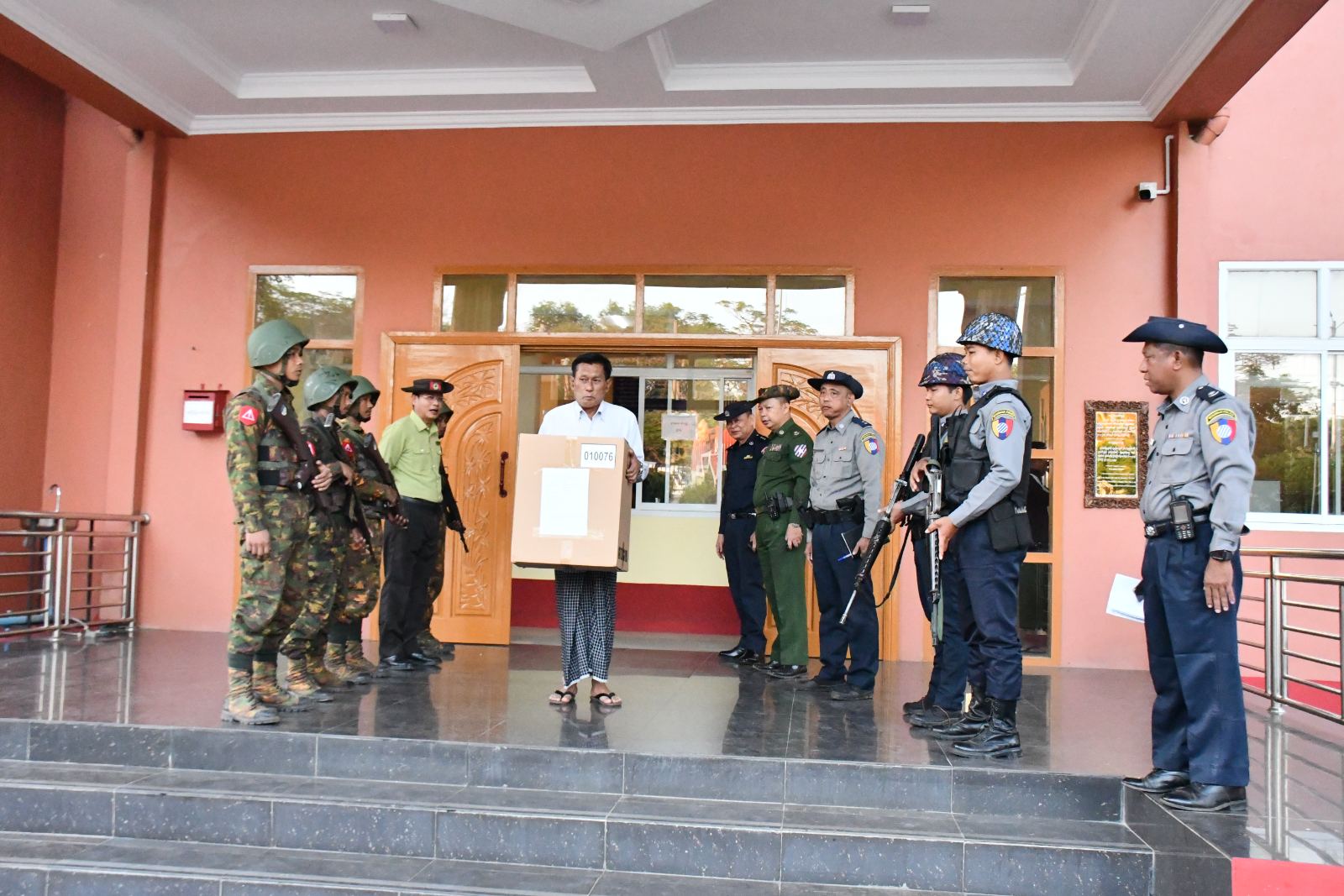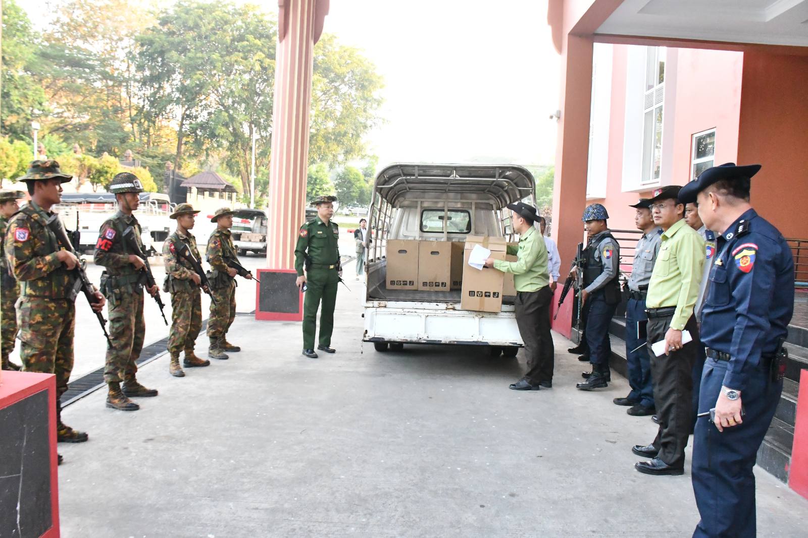အဆိုပါမြန်မာအီလက်ထရောနစ်မဲပေးစက်နှင့် မဲရုံသုံးပစ္စည်းများ ထုတ်ယူရာတွင် စနစ်တကျဖြစ်စေရေးနှင့် အမှားအယွင်းများ မဖြစ်ပေါ်စေရေန်အတွက် မြို့နယ်စီမံခန့်ခွဲရေးနှင့် အုပ်ချုပ်ရေးကော်မတီဥက္ကဋ္ဌ ဦးအောင်ဝင်းနိုင်နှင့် အဖွဲ့ဝင်များ တာဝန်ရှိသူအဆင့်ဆင့်က အနီးကပ်ကြီးကြပ်၍ သက်ဆိုင်ရာမဲရုံများအား ဇုံနယ်မြေများခွဲ၍ သက်ဆိုင်ရာတာဝန်ရှိသူများထံ သတ်မှတ်အချိန်အလိုက် ထုတ်ပေးလျက်ရှိသည်။