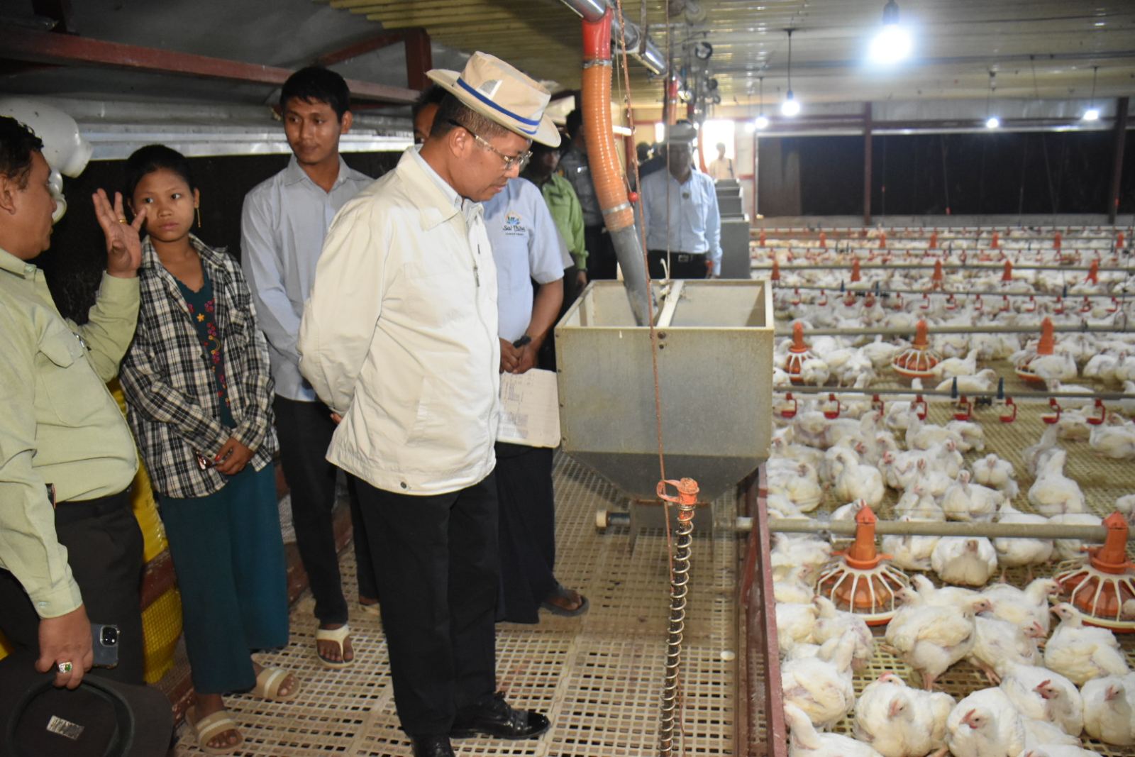 ထို့နောက် တိုင်းဒေသကြီးဝန်ကြီးချုပ်နှင့်အဖွဲ့သည် မအူပင်မြို့နယ်၊ ရွှေတောင်မှော်ကျေးရွာရှိ စိုင်းဟီဟအသားစားကြက်ခြံသို့ သွားရောက် ၍ အသားစားကြက် (၁၅၅၀၀၀)ကောင်မွေးမြူထားရှိမှု များကို ကြည့်ရှုအားပေးပြီး တိုးချဲ့မွေးမြူနိုင်ရေး၊ ဈေးကွက်အတွင်း တိုးချဲ့တင်ပို့နိုင်ရေးတို့ကို မှာကြားခဲ့သည်။ ရွှေတောင်မှော်ကျေးရွာရှိ စိုင်းဟီဟအသားစားကြက်ခြံအနေဖြင့် တစ်နှစ် ၅ သုတ်ဖြင့် တိုင်းအတွင်း (၈၀)ရာခိုင်နှုန်းနှင့် တိုင်းပြင်ပ (၂၀) ရာခိုင်နှုန်း တင်ပို့ရောင်းချကြောင်း သိရသည်။