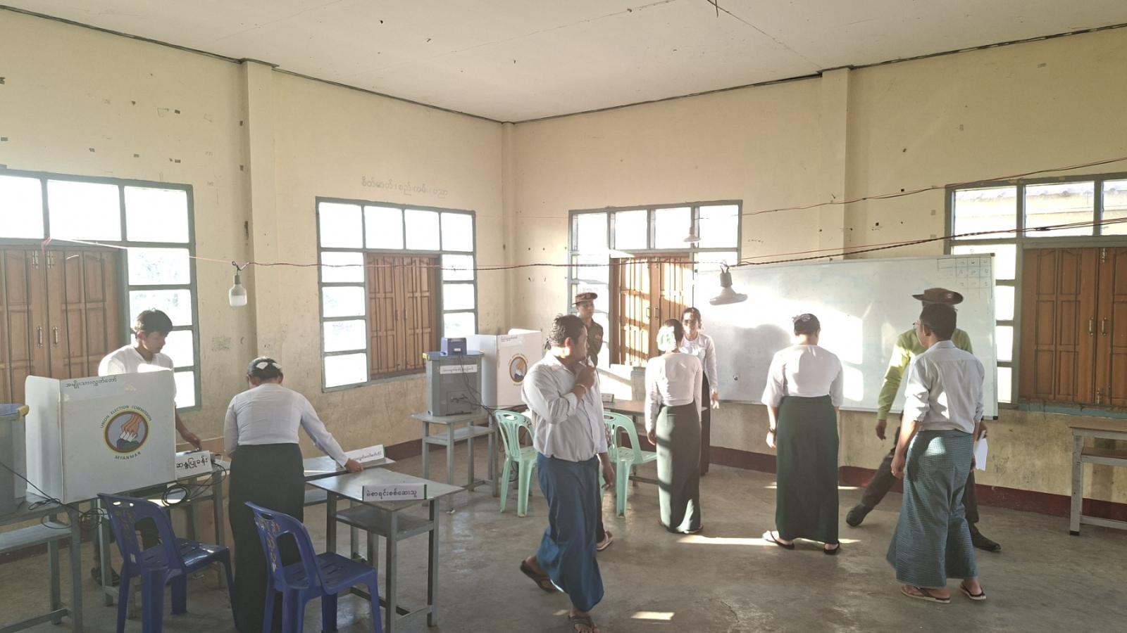 မြဝတီမြို့ပေါ် (၇)ရပ်ကွက်နှင့် ပူလွဲပူကျေးရွာအုပ်စုရှိ (အရပ်သား၊တပ်မဲရုံ)၊မဲပလဲ့ ကျေးရွာအုပ်စု၊ မဲကနယ်ကျေးရွာအုပ်စု၊ ဖားကလူကျေးရွာအုပ်စုများရှိ (တပ်မဲရုံ)များဖြင့် အရပ်သား မဲရုံ(၃၅)ရုံ၊ တပ်မဲရုံ (၇)ရုံ သတ်မှတ်မဲရုံစုစုပေါင်း (၄၂)ရုံ အတွက် မဲပေးစက်များကို ခရိုင်ရွေး ကောက်ပွဲ ကော်မရှင်အဖွဲ့ခွဲဥက္ကဋ္ဌ ဦးမြင့်ဦးနှင့် ခရိုင်၊မြို့နယ်ရွေး ကောက်ပွဲအရာရှိနှ င့်တာဝန်ရှိသူများ၊ ခရိုင်/ မြို့နယ်ရွေးကောက်ပွဲကော်မရှင်အဖွဲ့ခွဲ (အဖွဲ့ဝင်)ဌာနဆိုင်ရာများပူးပေါင်း၍ ရပ်ကွက်/ကျေးရွာ ရွေးကောက်ပွဲကော်မရှင်အဖွဲ့ခွဲများမှ (တာဝန်ရှိသူ)ထံ ယမန်နေ့ နံနက်ပိုင်းက စနစ်တကျ လွှဲပြောင်းပေးခဲ့သည့် မဲပေးစက်နှင့် ဆက်စပ်ပစ္စည်းများကို မဲရုံ (၄၂)ရုံ ရှိ တာဝန်ရှိသူများက သတ်မှတ်ပုံစံအတိုင်း ပြင်ဆင်နေရာ ချထားပြီး မဲပေးစက်များကို လက်တွေ့သရုပ်ပြစမ်းသပ်မဲပေးခြင်းဆောင်ရွက်ခဲ့ကြရာ ခရိုင်စီမံခန့်ခွဲရေးနှင့် အုပ်ချုပ်ရေးကော်မတီဥက္ကဋ္ဌ ဦးကောင်းစံလင်းက ဦးဆောင်၍ ခရိုင်ရွေးကောက်ပွဲကော်မရှင်ဥက္ကဋ္ဌ ဦးမြင့်ဦးနှင့် တာဝန်ရှိသူများနှင့် ခရိုင်၊ မြို့နယ် ရွေးကောက်ပွဲကော်မရှင်အဖွဲ့ခွဲ (စိစစ်ရေးအဖွဲ့) (၄)ဖွဲ့ မှတာဝန်ရှိသူများက သက်ဆိုင်ရာမဲရုံများအလိုက် မြေပြင်ကွင်းဆင်းစစ်ဆေးပြီး လုံခြုံရေးကိစ္စရပ်များနှင့် အုပ်ချုပ်/ထောက်ပံ့မှုကိစ္စရပ်များ ကိုပေါင်းစပ် ညှိနှိုင်းဆောင်ရွက်ပေးခဲ့ကြကြောင်း သိရသည်။