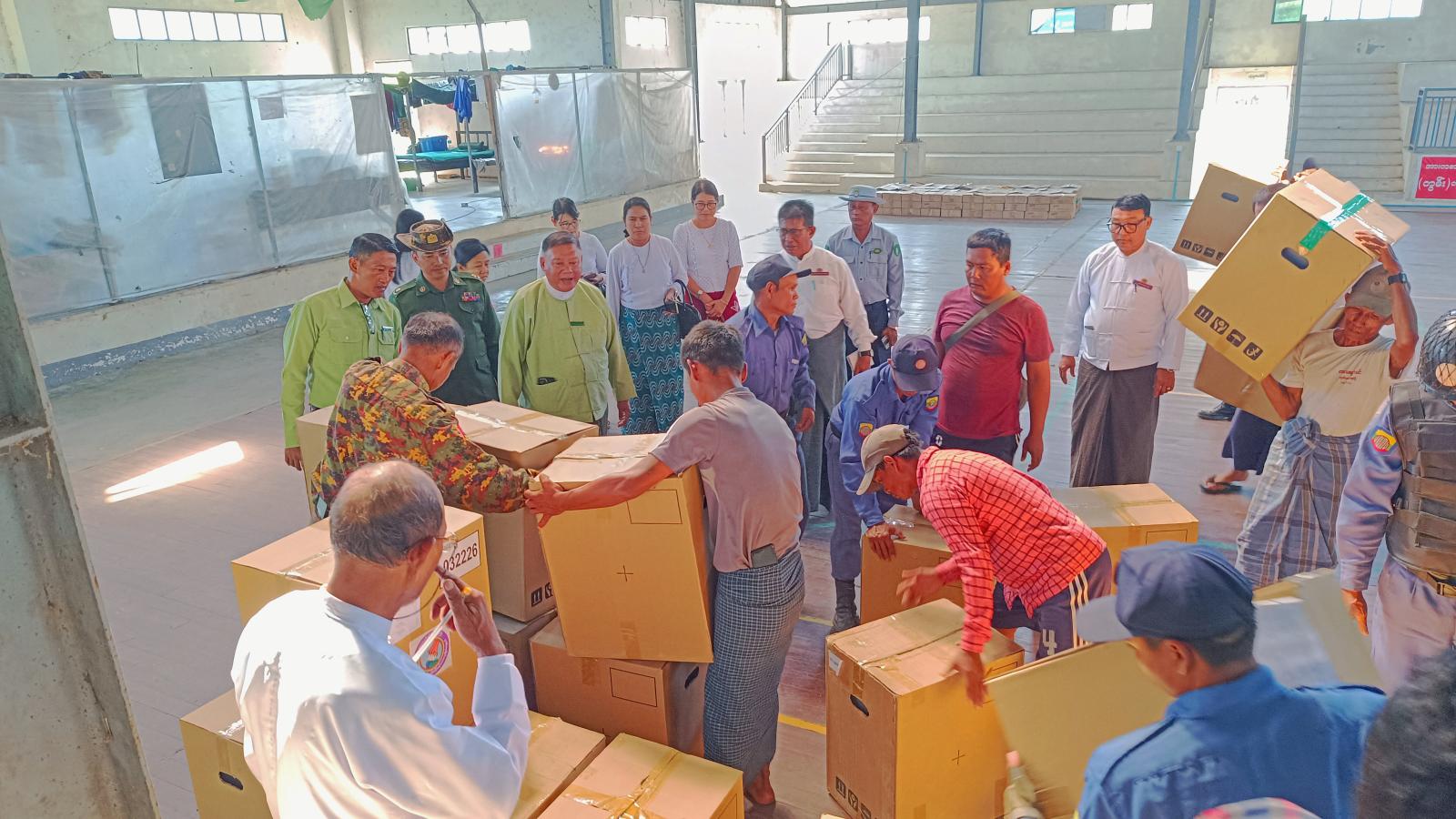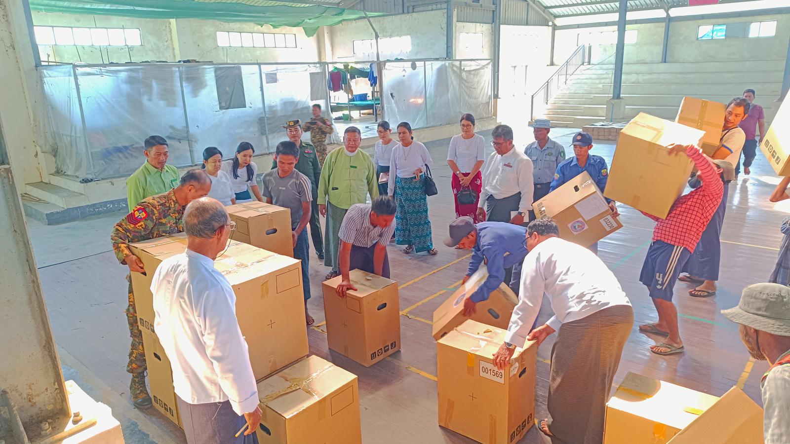 ထိုသို့ MEVM မဲပေးစက်နှင့် ဆက်စပ်ပစ္စည်းများ ရောက်ရှိရာတွင် မြို့နယ်အထွေထွေ အုပ်ချုပ်ရေးဦးစီးဌာနမှ စာရေးဝန်ထမ်းများ၊ မြို့နယ်လူဝင်မှုကြီးကြပ်ရေးနှင့် ပြည်သူ့အင်အားဦးစီးဌာနမှ ဝန်ထမ်းများ၊ မြို့နယ်မီးသတ်ဦးစီးဌာနမှ တပ်ဖွဲ့ဝင်များ၊ တပ်ဖွဲ့ဝင်များနှင့် ပြည်သူ့စစ်အဖွဲ့တို့က စနစ်တကျသယ်ပိုး၍ နေရာချထားကြပြီး အဆိုပါ ရောက်ရှိနေရာချထားမှုများအား မြို့နယ်စီမံခန့်ခွဲရေးနှင့် အုပ်ချုပ်ရေးကော်မတီဥက္ကဋ္ဌ ဦးမြင့်အောင်၊ အဖွဲ့ဝင်ဗိုလ်မှူးရဲနိုင်လွင်နှင့် အဖွဲ့ဝင်များ၊ မြို့နယ်ရွေးကောက်ပွဲကော်မရှင်အဖွဲ့ခွဲ့ဥက္ကဋ္ဌ ဦးဌေးမင်းနှင့် ကော်မတီဝင်များ၊ ဌာနဆိုင်ရာအကြီးအကဲများက ကြည်ရှုစစ်ဆေးခဲ့ကြပြီး လိုအပ်သည်များကို လမ်းညွှန်မှာကြားခဲ့ကြကြောင်း သိရသည်။