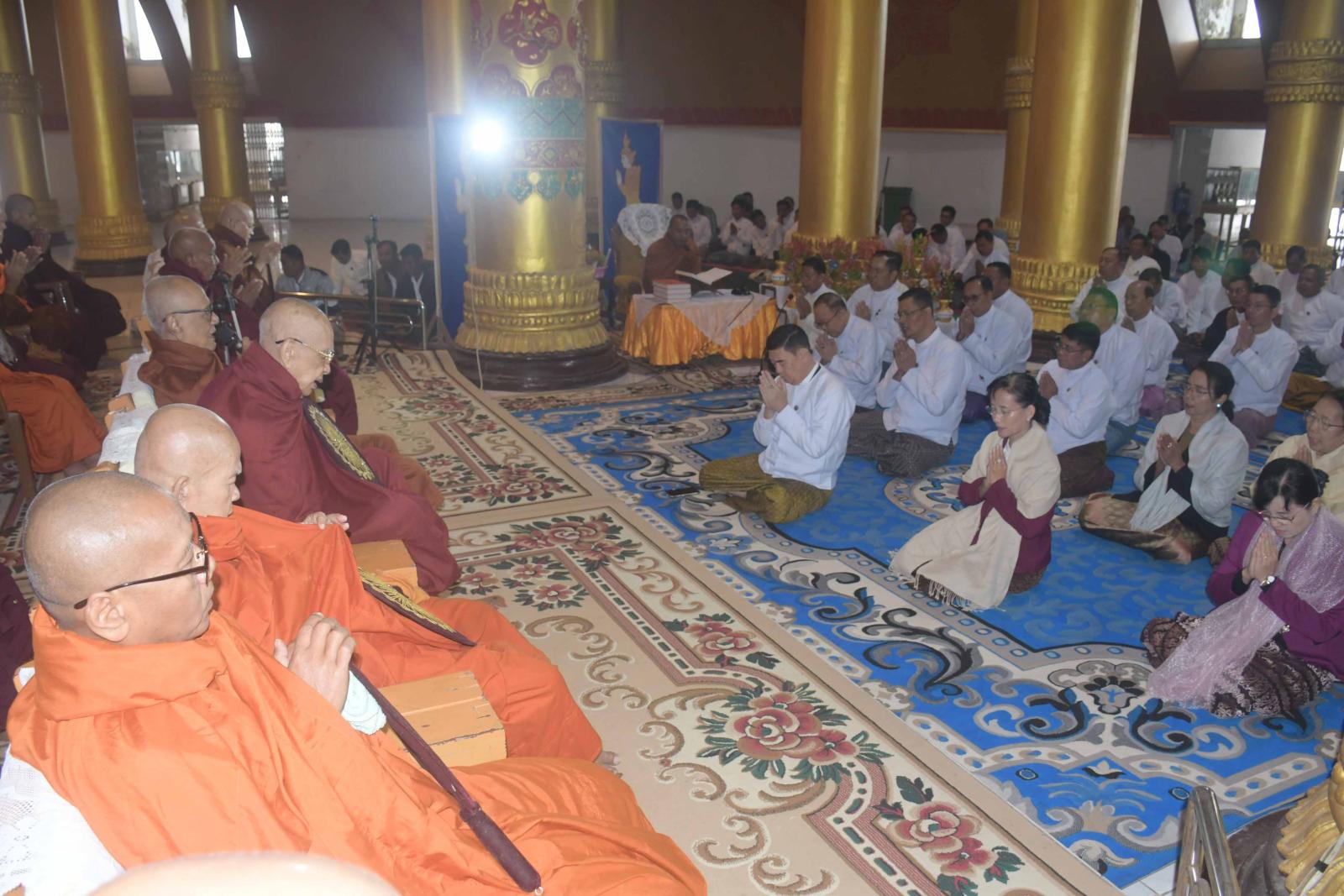 ထို့နောက် အခမ်းအနားကို ကြွရောက်တော်မူကြသော ဆရာတော်သံဃာတော်များနှင့် ပြည်နယ်ဝန်ကြီးချုပ်အမှူးပြုသော ဧည့်ပရိသတ်များက နမောတဿသုံးကြိမ်ရွတ်ဆို ဘုရားကန်တော့၍ ဖွင့်လှစ်ကြပြီးစစ်တွေမြို့၊ နန္ဒာရာမပရိယတ္တိစာသင်တိုက် ပဓာနနာယက၊ ပြည်နယ်ဩဝါဒါစရိယ၊ အဂ္ဂ မဟာမင်္ဂလဓမ္မ ဇောတိကဓဇ၊ အဂ္ဂမဟာပဏ္ဍိတ၊ အဘိဓဇမဟာရဋ္ဌဂုရု ဘဒ္ဒန္တနန္ဒသိရီ မဟာထေရ်မြတ်ထံမှ ပြည်နယ်ဝန်ကြီးချုပ် အမှူးပြုသော ဧည့်ပရိသတ်များက ငါးပါးသီလခံယူ ဆောက်တည်ကြသည်။