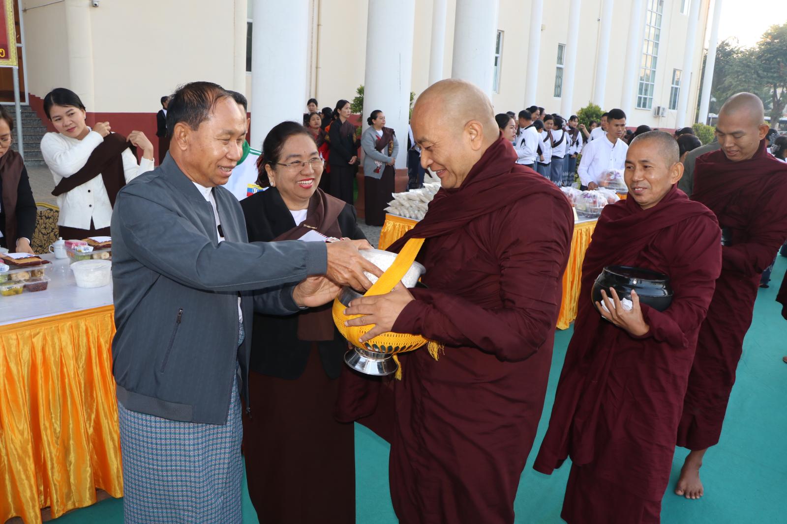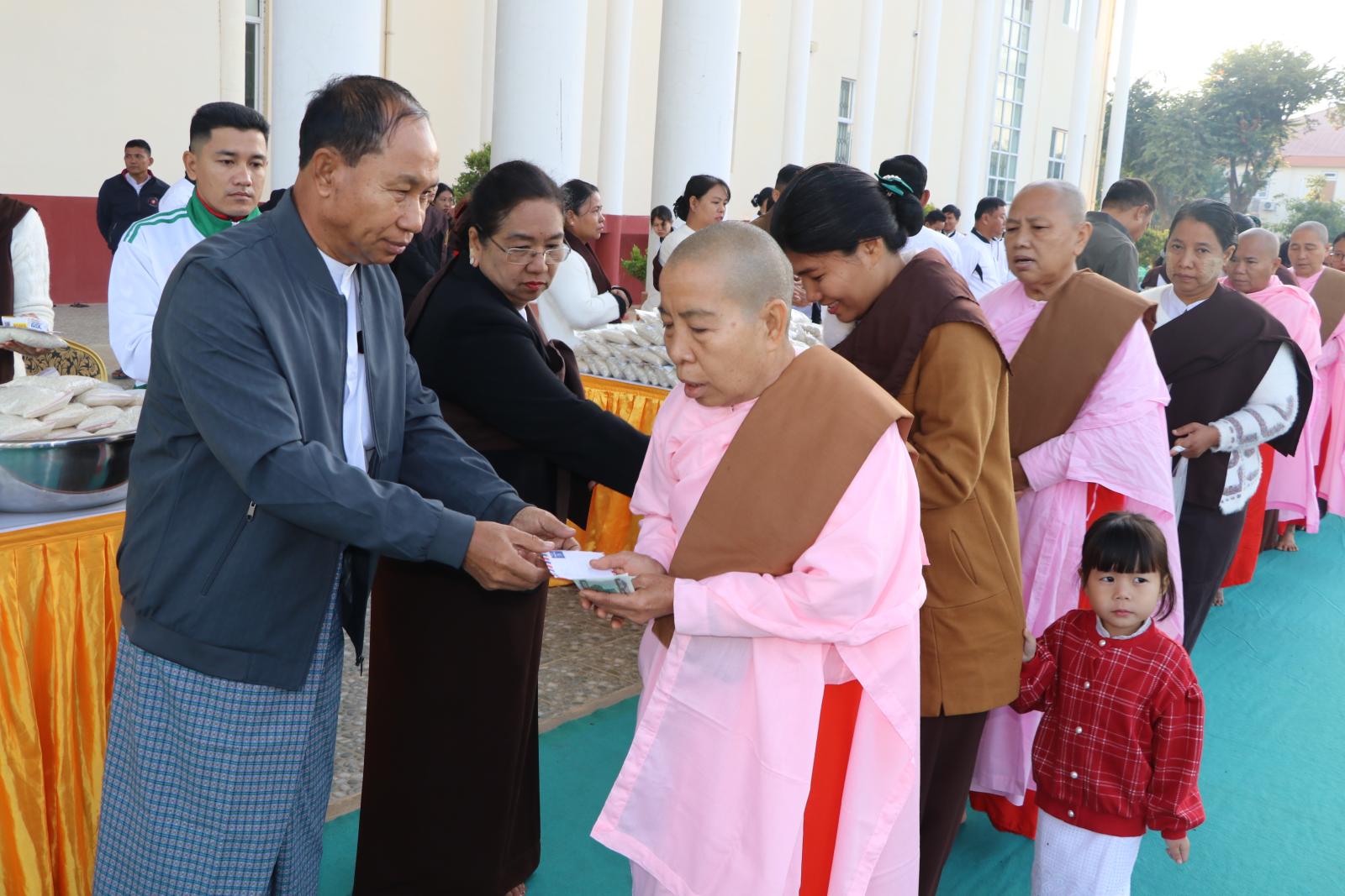 ယင်းနောက် တိုင်းဒေသကြီးဝန်ကြီးချုပ်နှင့်ဇနီး၊ တာဝန်ရှိသူများ၊ အလှူရှင်များက ပင့်သံဃာ ဆရာတော်၊ သံဃာတော်များအား ဆွမ်း၊ဆွမ်းဟင်း၊ သစ်သီး၊ အချိုပွဲများနှင့်ဝတ္ထုငွေများအား လောင်းလှူခဲ့ကြပြီး သီလရှင်ဆရာကြီး၊ ဆရာလေးများအား ဆွမ်းဆန်စိမ်း၊စား သုံးဆီနှင့် လှူဖွယ်ဝတ္ထုများအား ဆက်ကပ်လောင်းလှူကြသည်။