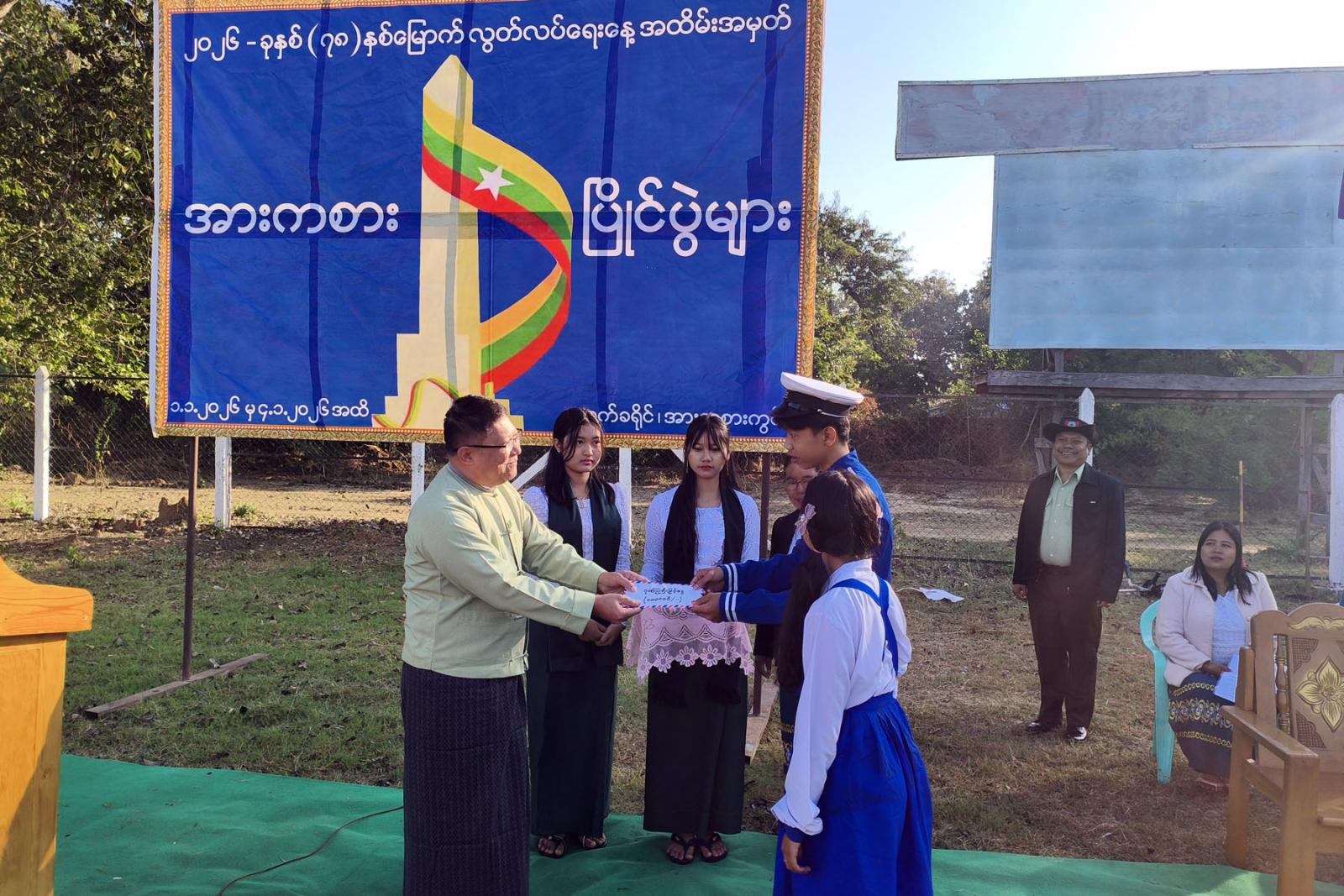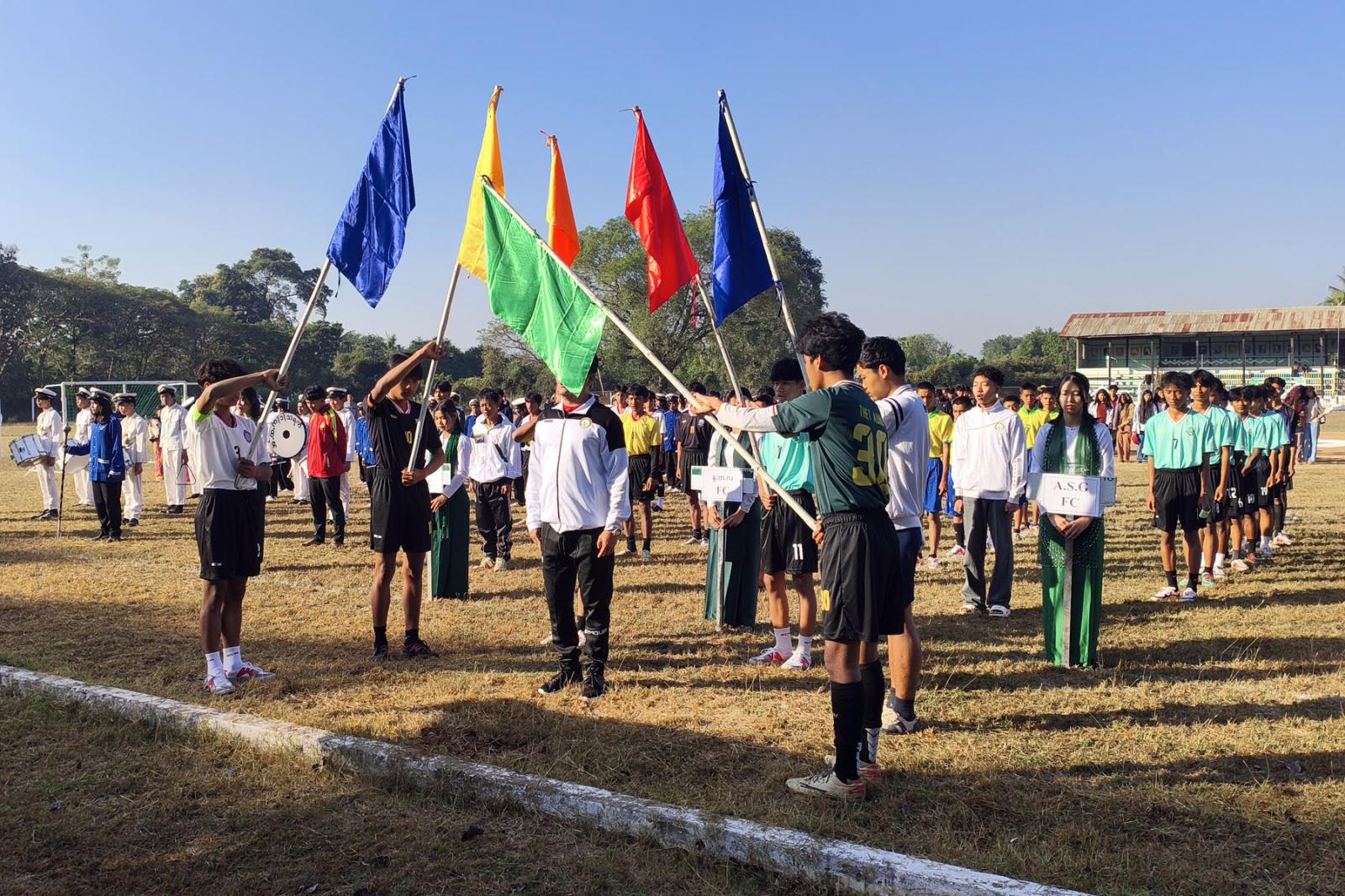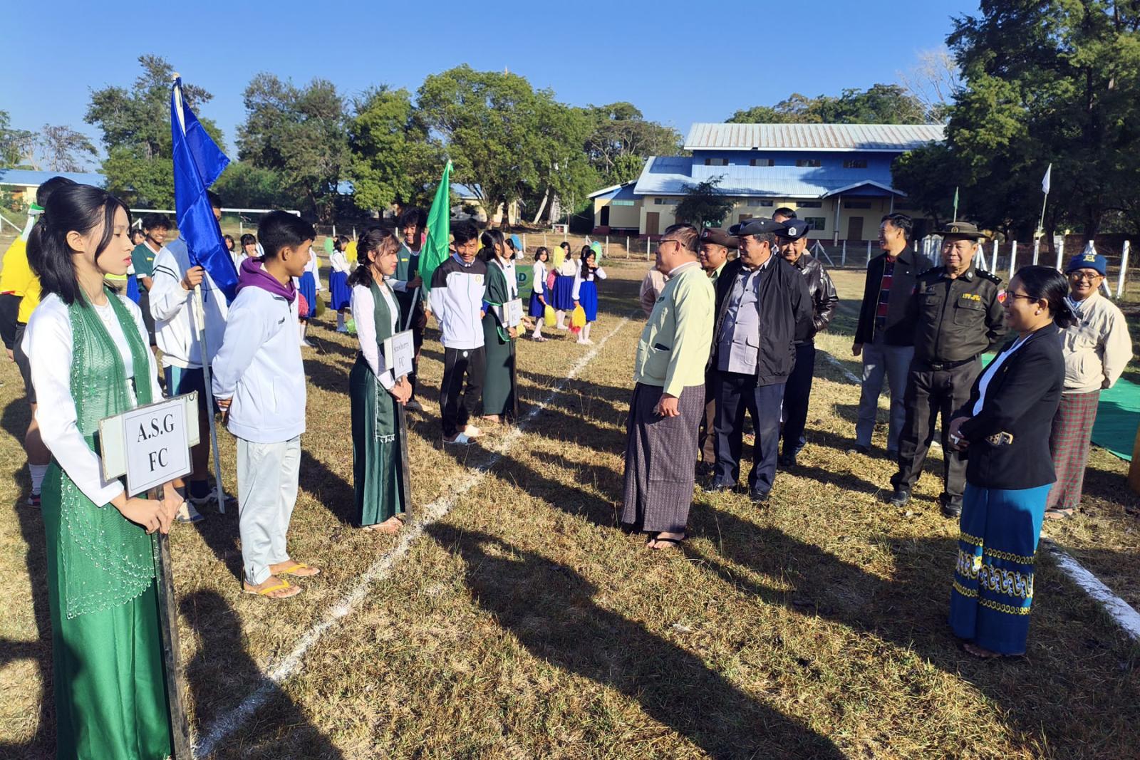 ထို့နောက် ခရိုင်စီမံခန့်ခွဲရေးနှင့်အုပ်ချုပ်ရေးကော်မတီဥက္ကဋ္ဌက ပြိုင်ပွဲဝင်အသင်းများအား လိုက်လံနှုတ်ဆက်ပေးခဲ့ပြီး ဘင်ခရာနှင့် ပန်းပွားအဖွဲ့များအား ဂုဏ်ပြုဆုငွေများ ချီးမြှင့်ပေးခဲ့ပြီး ဖူဆယ်ဘော်လုံးပြိုင်ပွဲအား စတင်ကျင်းပခဲ့ကြောင်း၊ ပြိုင်ပွဲဝင်အသင်း (၆)သင်း ဝင်ရောက်ယှဉ်ပြိုင်မည်ဖြစ်ကြောင်း သိရသည်။