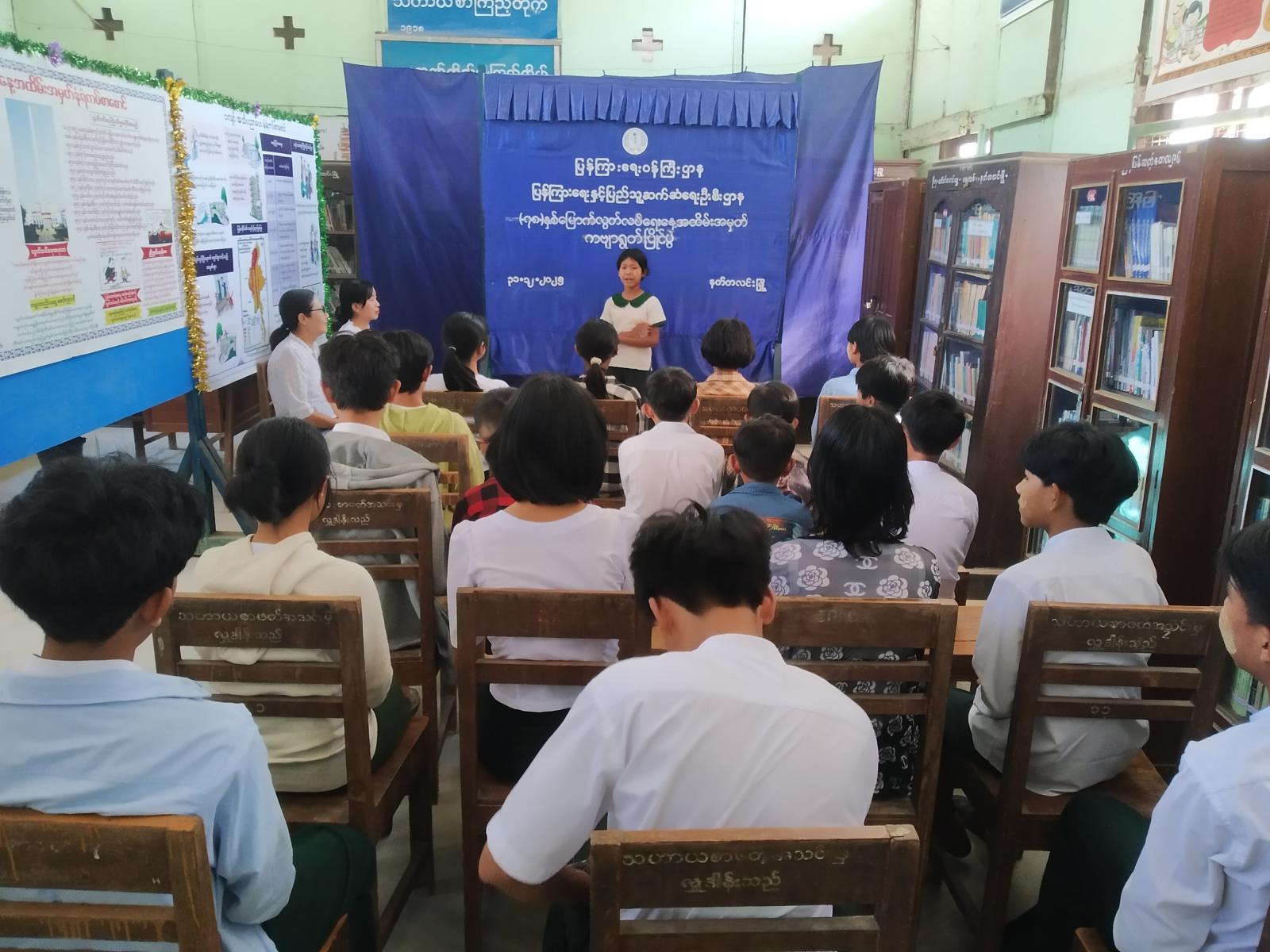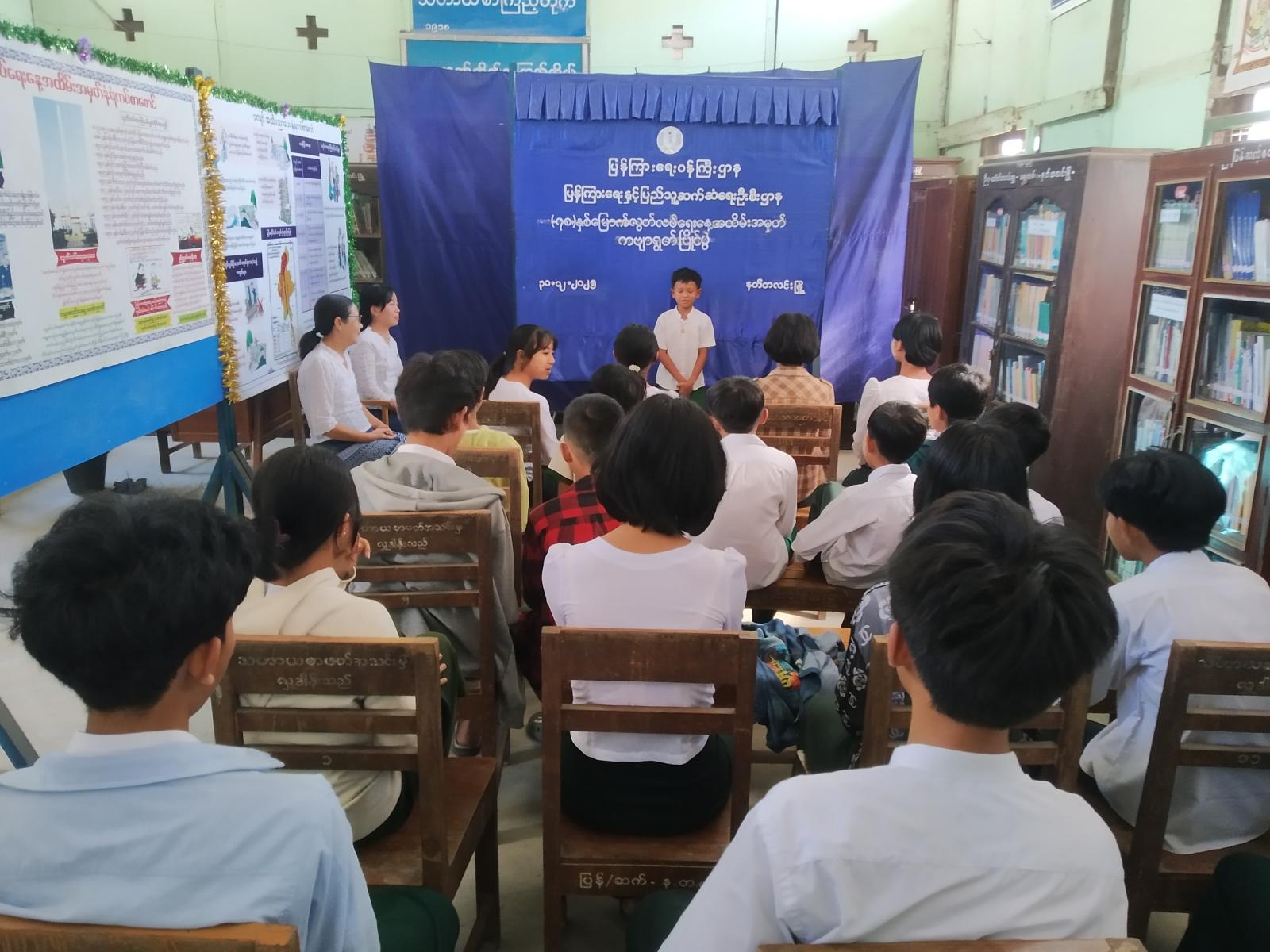 (၇၈)နှစ်မြောက် လွတ်လပ်ရေးနေ့အထိမ်းအမှတ် ကဗျာရွတ်ဆိုပြိုင်ပွဲတွင် ပြန်ကြားရေးနှင့်ပြည်သူ့ဆက်ဆံရေးဦးစီးဌာနမှ မြို့နယ်ဦးစီးမှူး ဒေါ်ခင်သူဇာဝင်းက ပြိုင်ပွဲပြုလုပ်ရခြင်း ရည်ရွယ်ချက်ကို ရှင်းလင်းပြောကြားပြီး (၇၈)နှစ်မြောက် လွတ်လပ်ရေးနေ့အထိမ်းအမှတ် ကဗျာရွတ်ဆိုပြိုင်ပွဲတွင် ကျောင်းသား၊ ကျောင်းသူ(၂၀)ဦး ပါဝင်ယှဉ်ပြိုင်ကြရာပြိုင်ပွဲတွင် ဆုရရှိသည့် ကျောင်းသား၊ ကျောင်းသူများအား အမှတ်တရလက်ဆောင်ပစ္စည်းများ ပေးအပ်ခဲ့ကြောင်း သိရသည်။