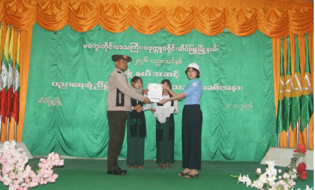 ၎င်းနောက် မြို့နယ်စီမံခန့်ခွဲရေးနှင့်အုပ်ချုပ်ရေးကော်မတီ ဥက္ကဋ္ဌနှင့် အဖွဲ့ဝင်များ၊ ဌာနဆိုင်ရာများက တက္ကသိုလ်ဝင်တန်းစာမေးပွဲတွင် ဂုဏ်ထူးရကျောင်းသား/ကျောင်းသူများ၊ သင်ကြားပြသမှု အကောင်းဆုံး ဆရာ/ဆရာမများ၊ မြို့နယ်အဆင့် ပညာရည်ချွန်ဆု၊ အားကစားထူးချွန်ဆုများကို အသီးသီးပေးအပ်ချီးမြှင့်ခဲ့ကြပြီး၊ ကျောင်းသား/ကျောင်းသူလေးများက တေးသရုပ်ဖော်အကတို့ဖြင့် သီဆိုဖျော်ဖြေခဲ့ကြကြောင်း သိရှိရသည်။