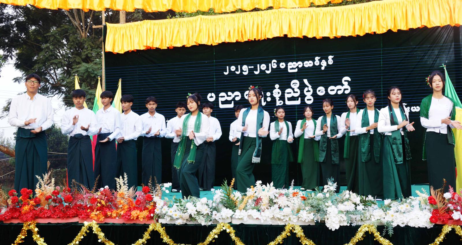 ရှေးဦးစွာ အခမ်းအနားကို အခြေခံပညာအထက်တန်းကျောင်းမှ ကျောင်းသား၊ ကျောင်းသူများမှ စုံညီပွဲတော်တို့ကျောင်းတော်သီချင်းဖြင့် သီဆိုဖွင့်လှစ်သည်။